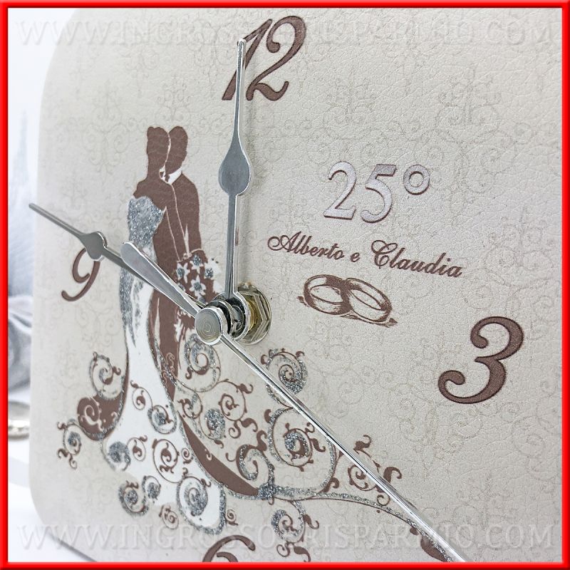 Orologi con sposi, numero 25° e fedi intrecciate, realizzato in ecopelle, con stampa nelle tonalità del grigio e dettagli argentati realizzati con polvere glitterata. Orologio dotato di meccanismo con gancio per l'affissione alla parete e di piede d'appoggio da tavolo.