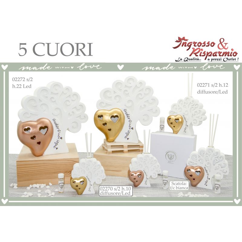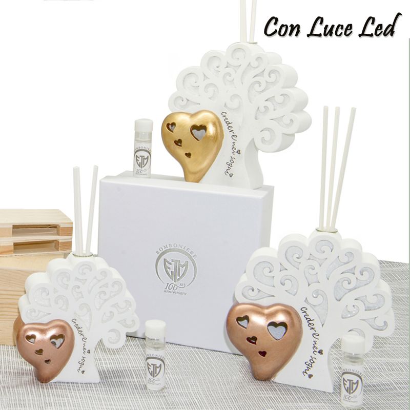 Bomboniere utili come profumatori per ambienti con accensione a led. La bomboniera a forma di albero è realizzata in resina bianca con cuore decorativo, assortito in due varianti di colore, ORO e BRONZO (non è possibile selezionare solo una variante di colore), con LED interno. Sul tronco dell'albero è incisa la frase "Credere nei sogni". Nella parte superiore è presente una fessura in cui inserire la fiala porta profumo ambiente e i bastoncini, per poter utilizzare le bomboniere come profumatori d'ambiente.