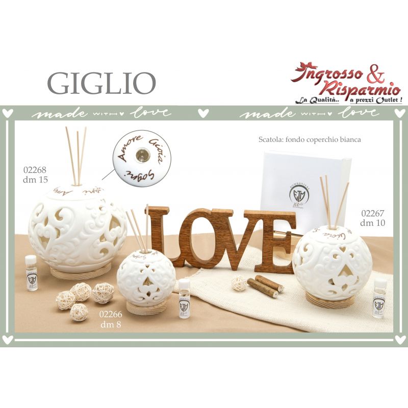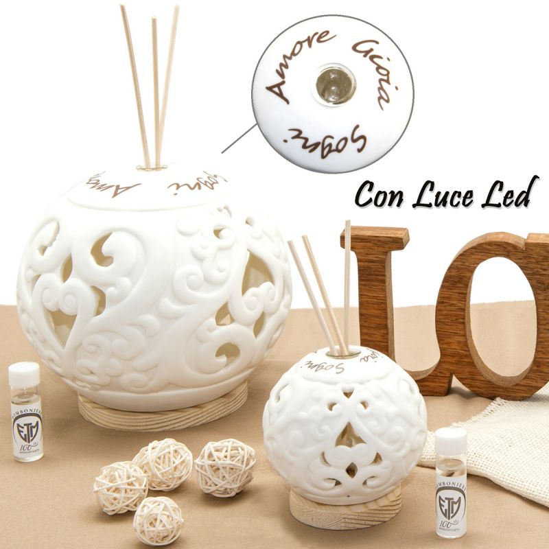 Bomboniere in ceramica bianca, di forma sferica, con superficie lavorata in rilievo e con intagli, decorata da scritte "Amore", "Sogni", "Gioia". La sfera è posata su una base in legno. Nella parte superiore è presente una cavità in cui inserire la fiala porta essenza con i bastoncini diffusori. All'interno della sfera è posizionato un LED alimentato a batterie, che illumina la tua bomboniera profumatore ambiente trasformandola in un bellissimo lume ornamentale, ideale sia per ambienti moderni che classici.