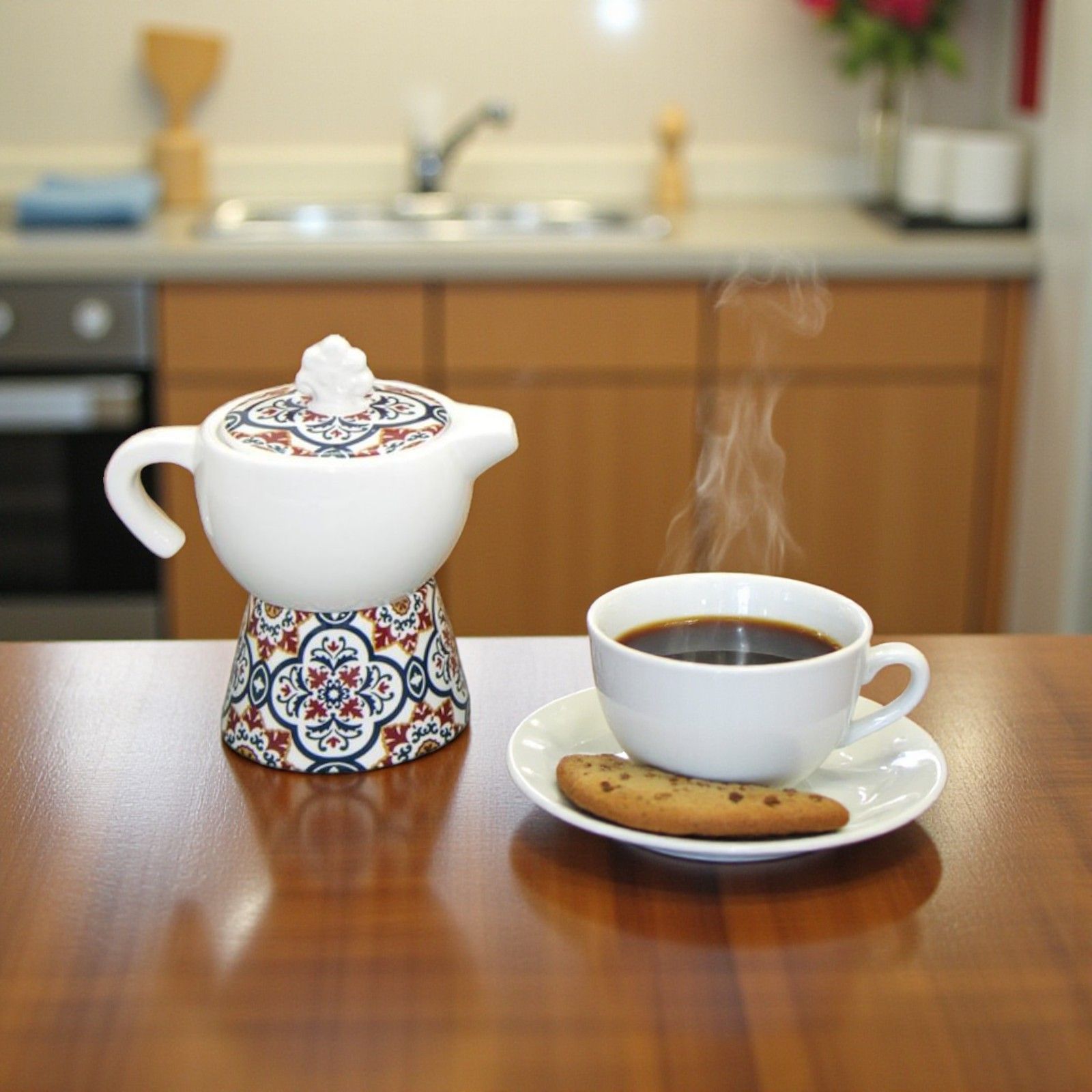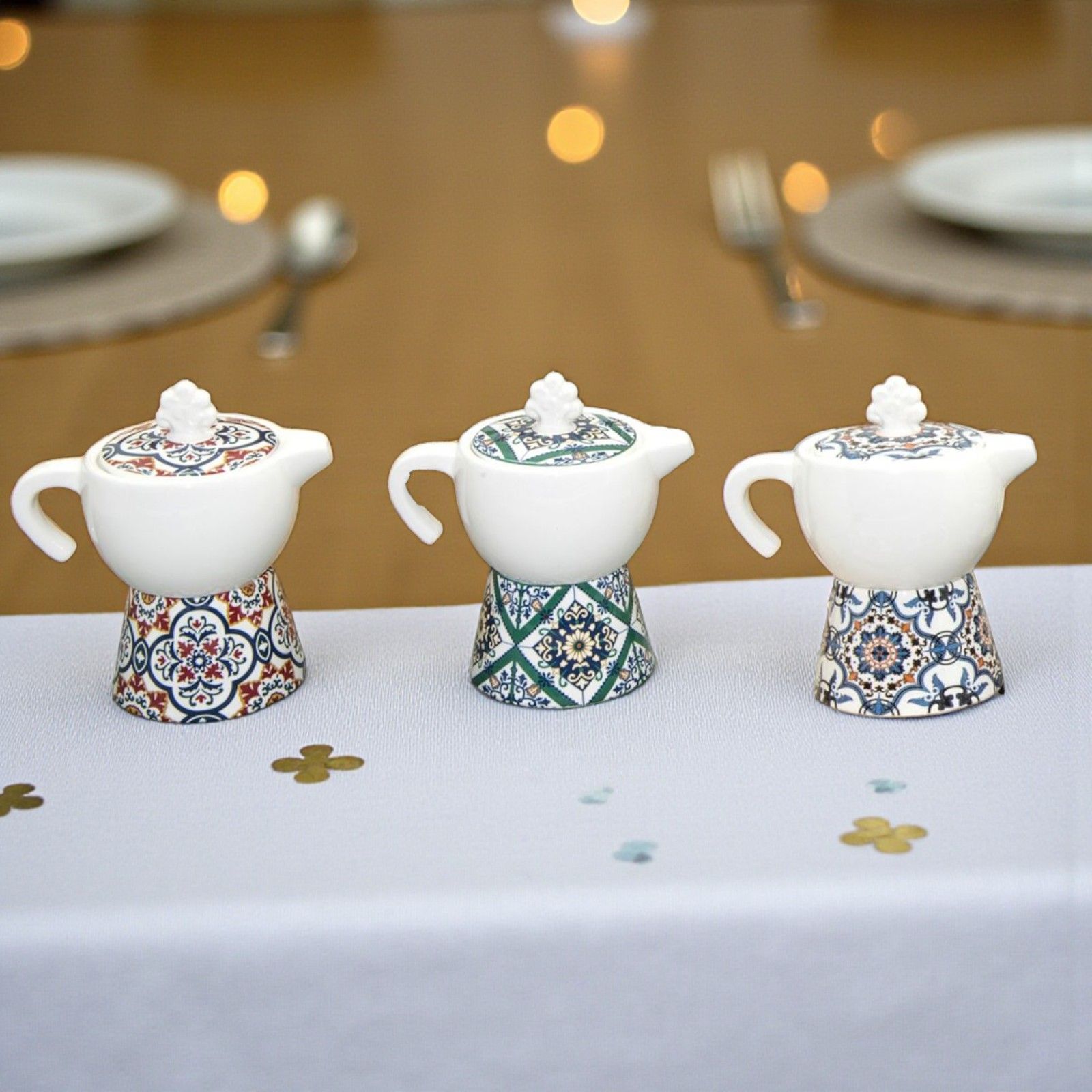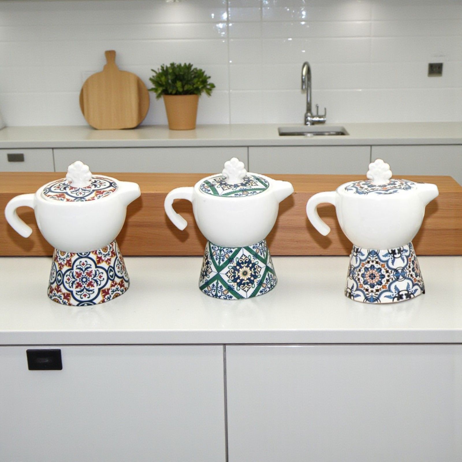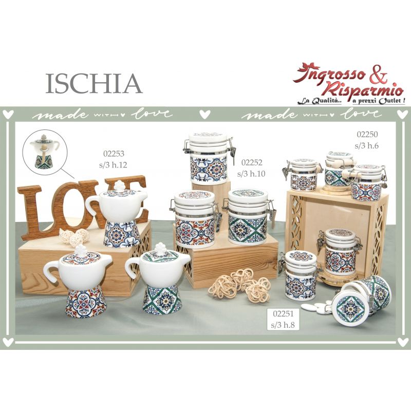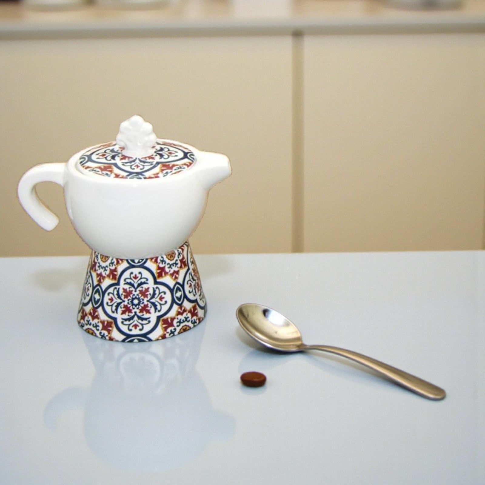Moka in ceramica: una caffettiera con duplice funzione di zuccheriera con cucchiaino incluso o lattiera e porta caffè. Le zuccheriere in ceramica hanno fondo bianco con base e tappo decorato in stile maiolica, assortite in 3 varianti di modello, come in foto. Il pomello sul tappo ha una forma che richiama l'albero della vita.