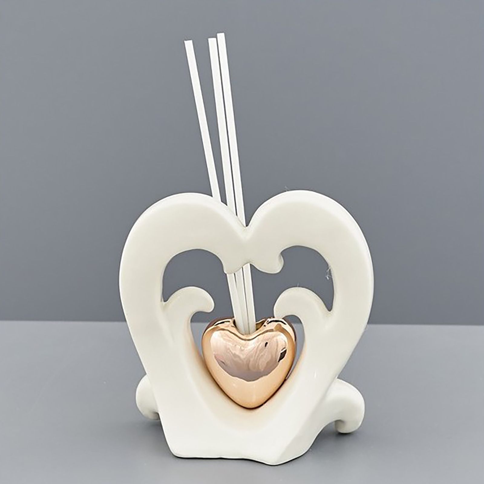 Profumatore ambiente in ceramica bianca lucida, con parte centrale forata e piccolo cuore porta essenza posizionato al centro, realizzato in colore rosa gold/rosè effetto specchio, lucido.