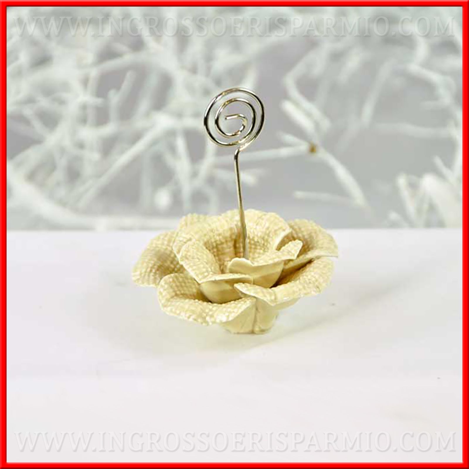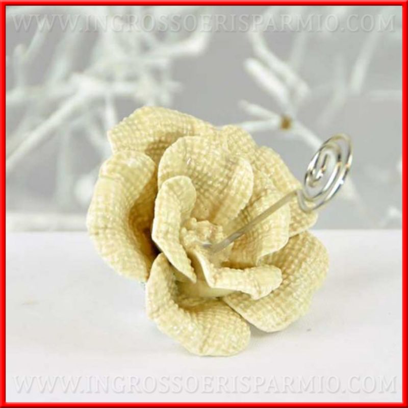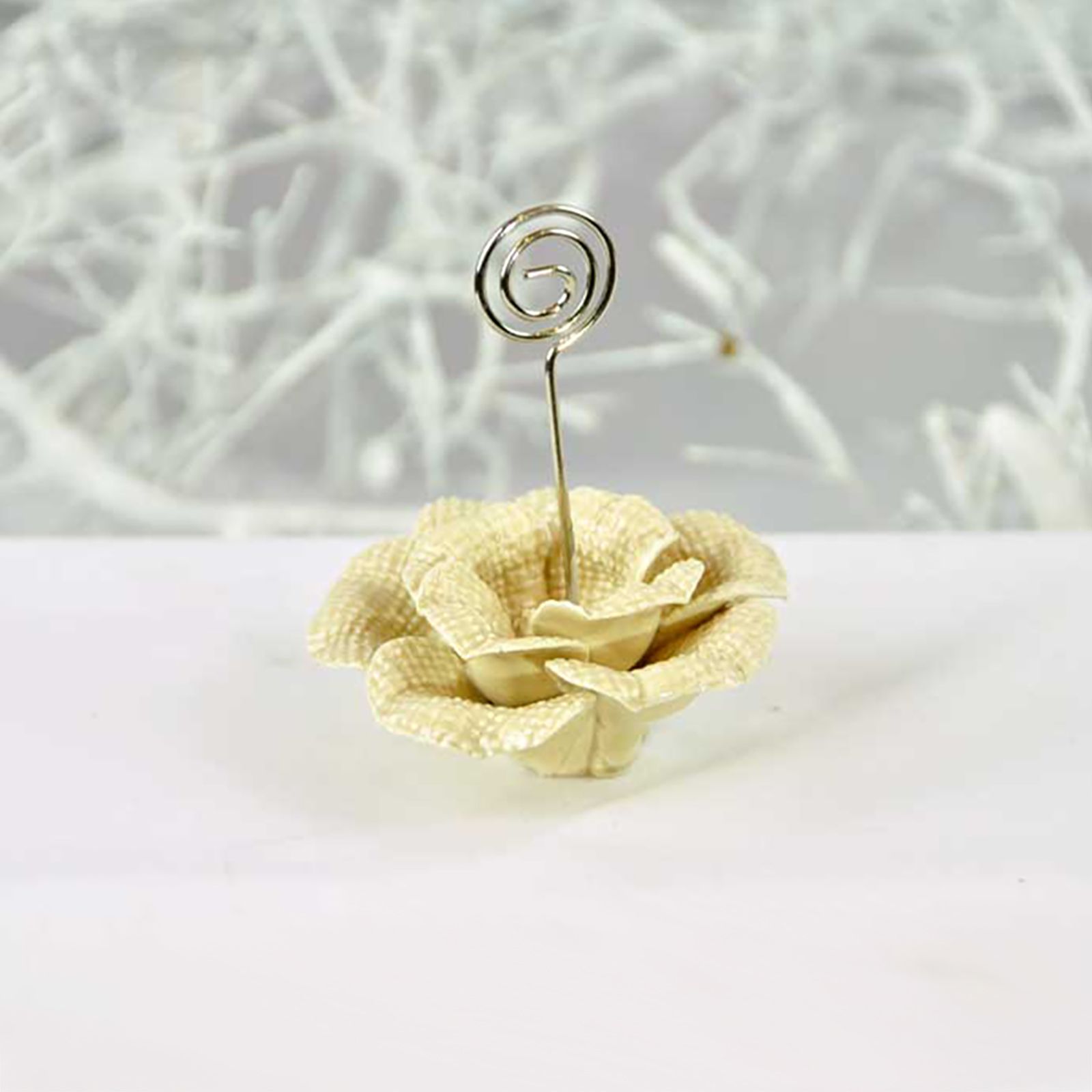 Segnaposti eleganti tema floreale con bocciolo di rosa in ceramica tortora e asta in metallo porta memo e porta foto: perfetti per la scelta come bomboniere segnaposto matrimonio!