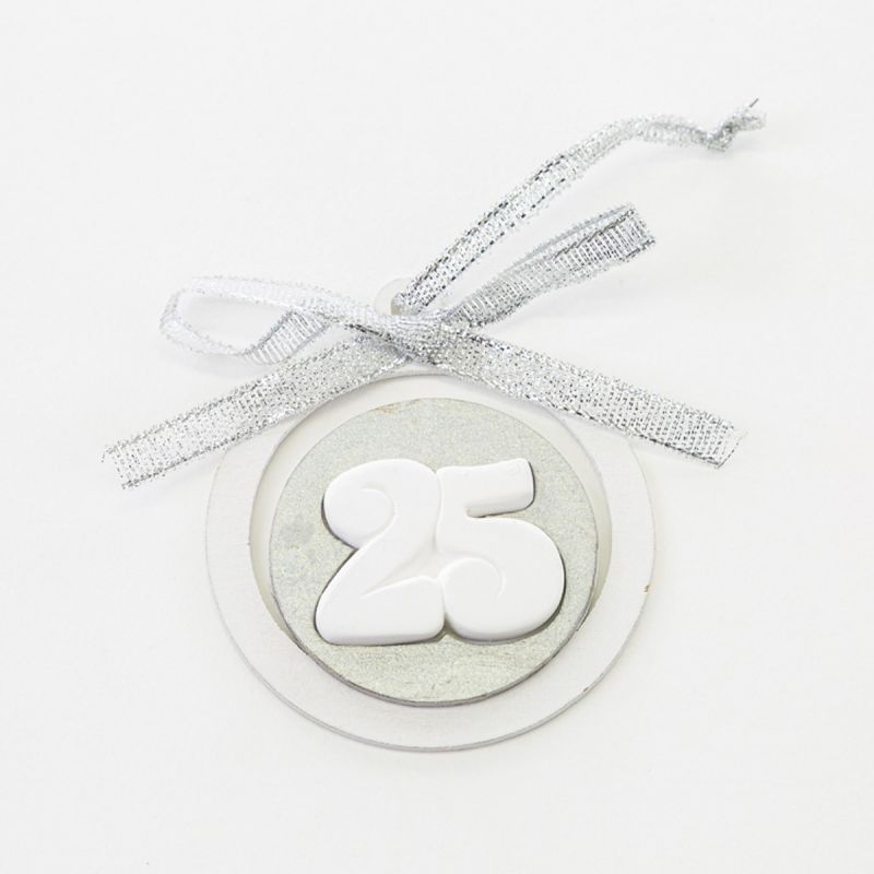 Decorazioni circolari realizzate in legno bianco con particolari in argento e fiocco in tinta che presentano al centro un gessetto bianco con il numero 25.