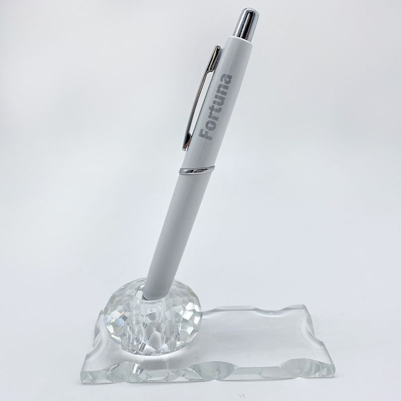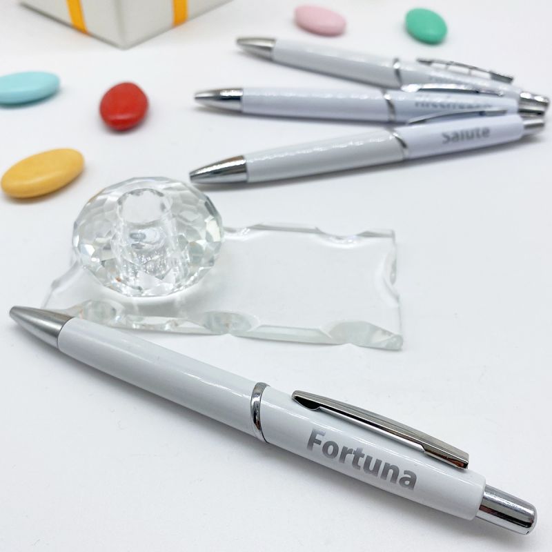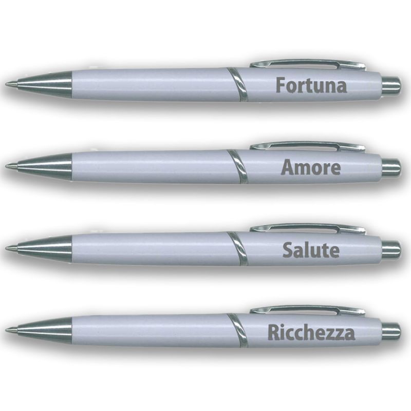 penne a sfera di colore bianco con dettagli in metallo e stampa colore argento delle parole "Amore", "Fortuna", "Ricchezza", "Salute".