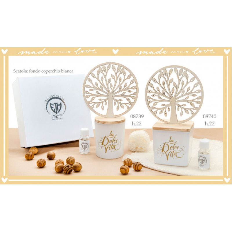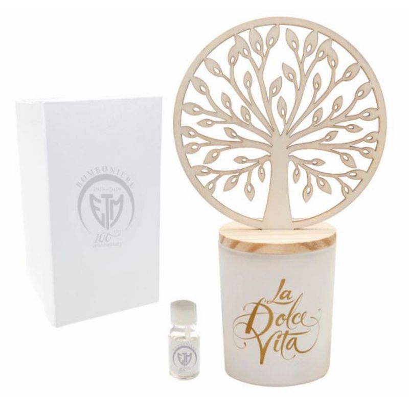 Fantastico profumatore d'ambiente composto da base cilindrica in vetro bianco, con scritta "La Dolce Vita" in oro. Sostituisce i classici bastoncini spargi profumo un elegante tappo in legno naturale con raffigurazione albero della vita, inserito in un inserto circolare.