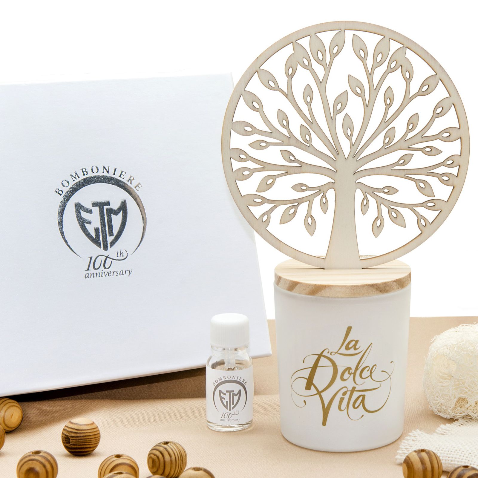 Puoi scegliere di ricevere il profumatore ambiente completo di confezionamento esterno alla scatola, realizzato dai nostri laboratori, composto da sacchetto di tulle, 5 confetti e bigliettino!