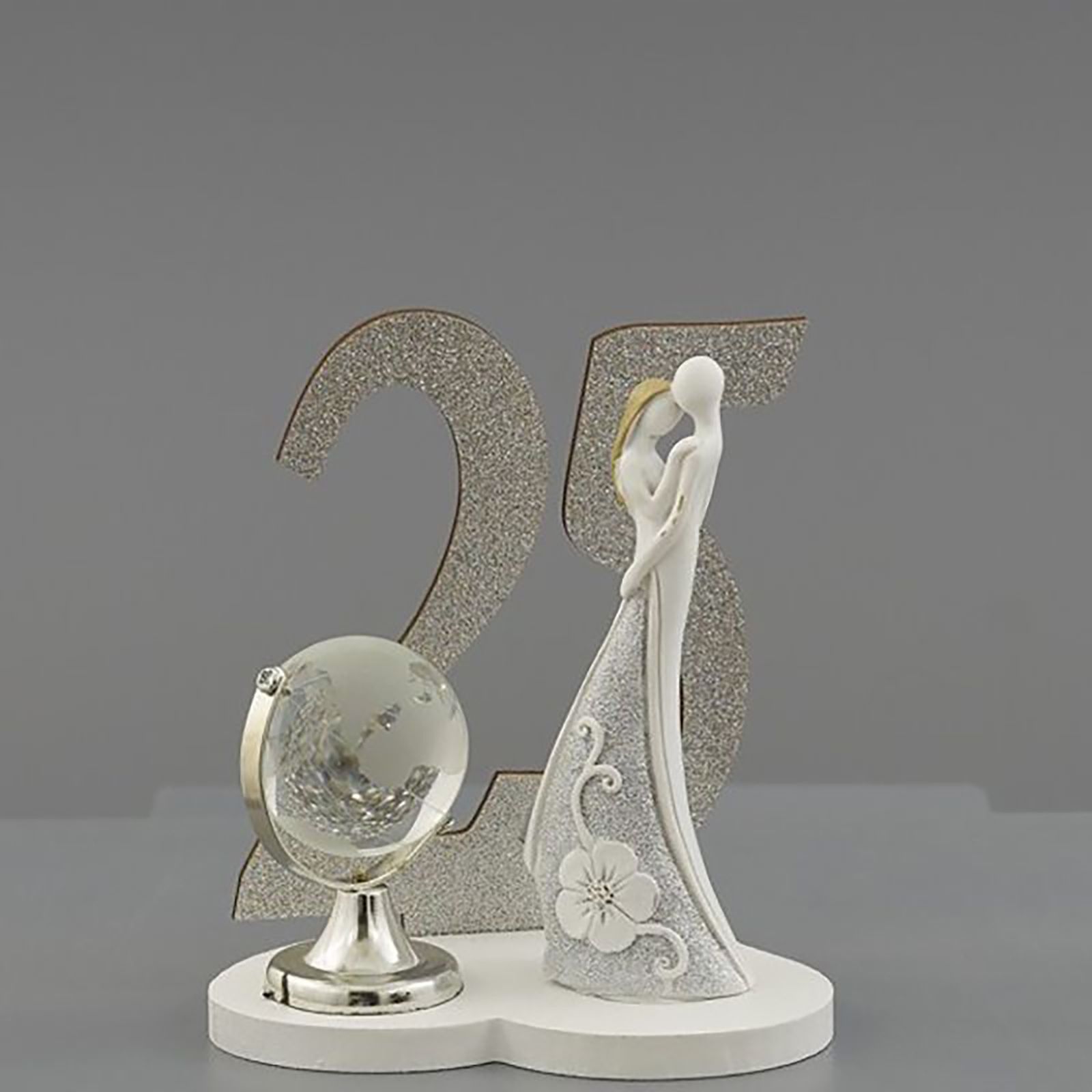 Statuina sposi stilizzata con dettagli glitter argento, posta su una base decorata da un mappamondo rotante in vetro e numero 25 in legno, anch'esso ricoperto di polvere glitterata argento.