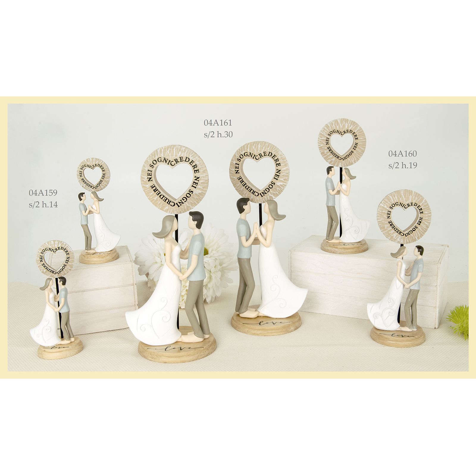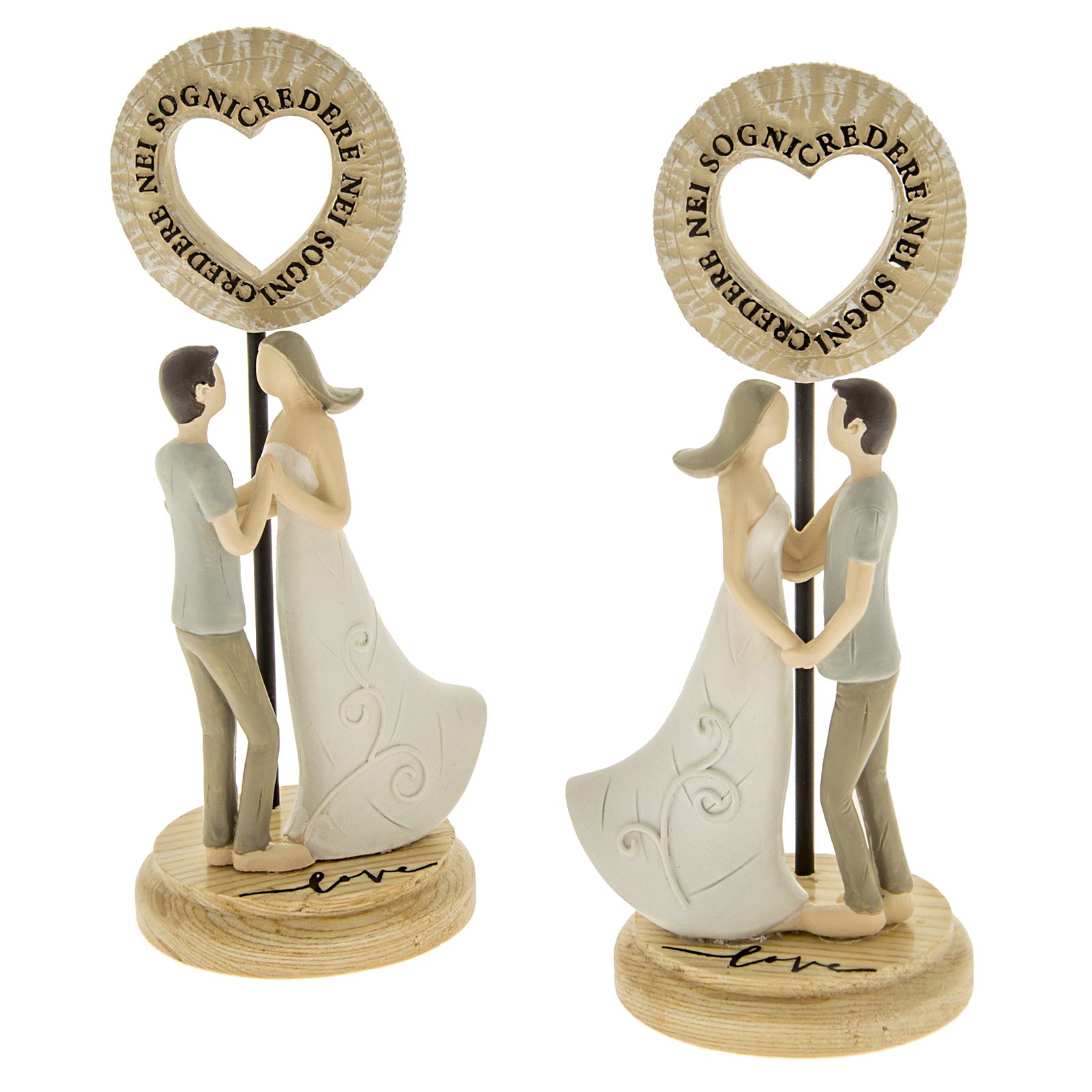 La statuina coppia innamorati potrà essere utilizzata come bomboniera/idea regalo promesse di matrimonio e fidanzamento, ma sarà l'idea migliore per le tue bomboniere matrimonio eleganti!Dietro i due sposi, è presente un segnalino con un cuore circondato dalla frase "Credere nei Sogni". Disponibili in due pose assortite (non selezionabili singolarmente).