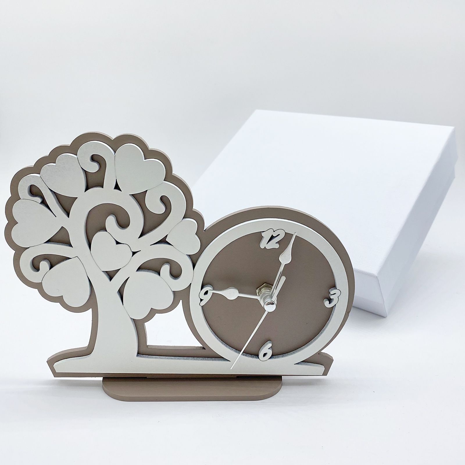 Per te disponibili i nostri orologi in legno ad effetto doppiato in due tonalità, la base di sfondo in color tortora e la sagoma principale in bianco ottico. A sinistra è presente un albero della vita con foglie a forma di cuore e accanto un elegante orologio con lancette in metallo.