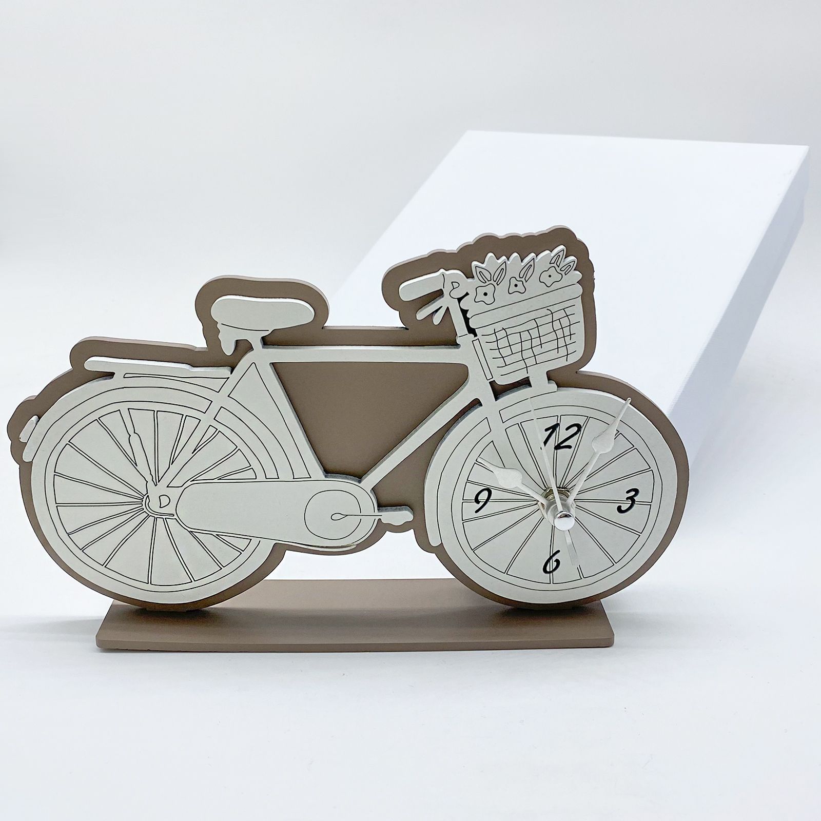 Eccoti questo insolito orologio, con struttura in legno doppiata in due tonalità: tortora per fondo e base e bianco per la raffigurazione della bicicletta. Al centro della ruota anteriore del grazioso velocipede, è montato l'orologio analogico con lancette in metallo color argento.