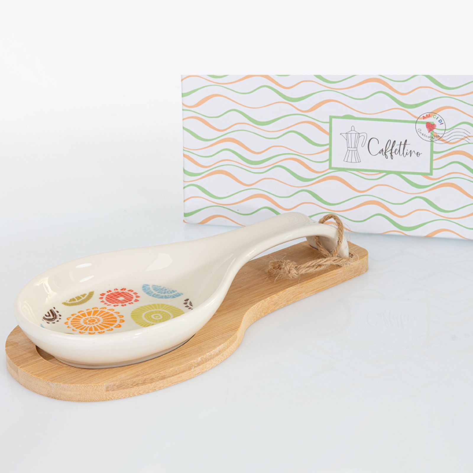 Ecco i nostri poggiamestoli in ceramica bianca, con occhiello e cordoncino in spago e interno decorato a fantasia astratta nelle tonalità del rosso, arancio, verde, celeste e cioccolato. In aggiunta, supporto base in legno di bamboo con incavi che permettono di tenere fermo il poggiamestolo.