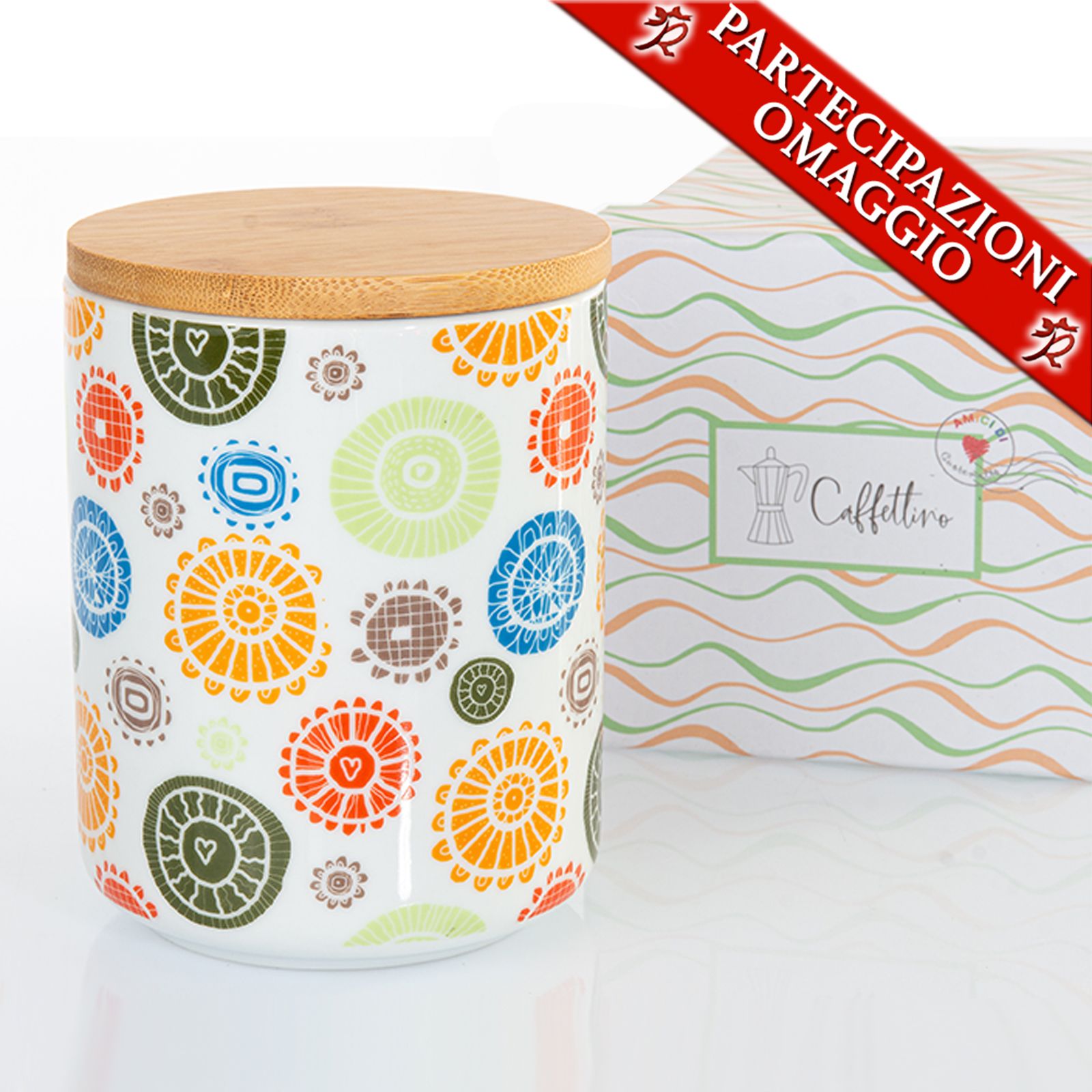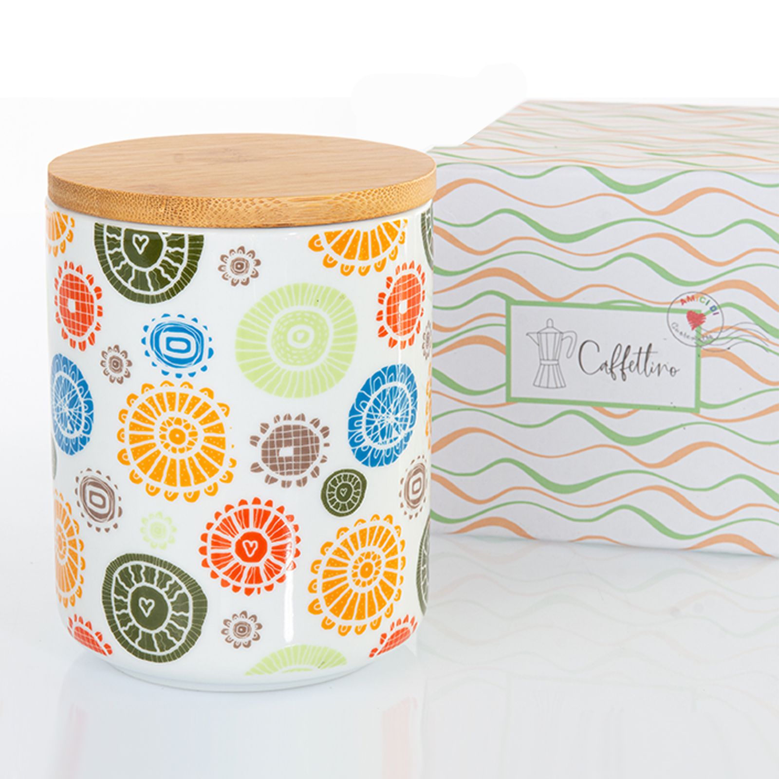 Scegli i nostri barattoli con coperchio in legno di bamboo e guarnizione in silicone, realizzati in ceramica bianca con decorazione a fantasia astratta nelle tonalità del blu, verde, arancio, rosso e tortora. Questi barattoli assicurano la tenuta di ciò che vorrai riporre, grazie alla chiusura ermetica! Potrai quindi utilizzarlo per farine, sale, zucchero, erbe aromatiche e cereali!