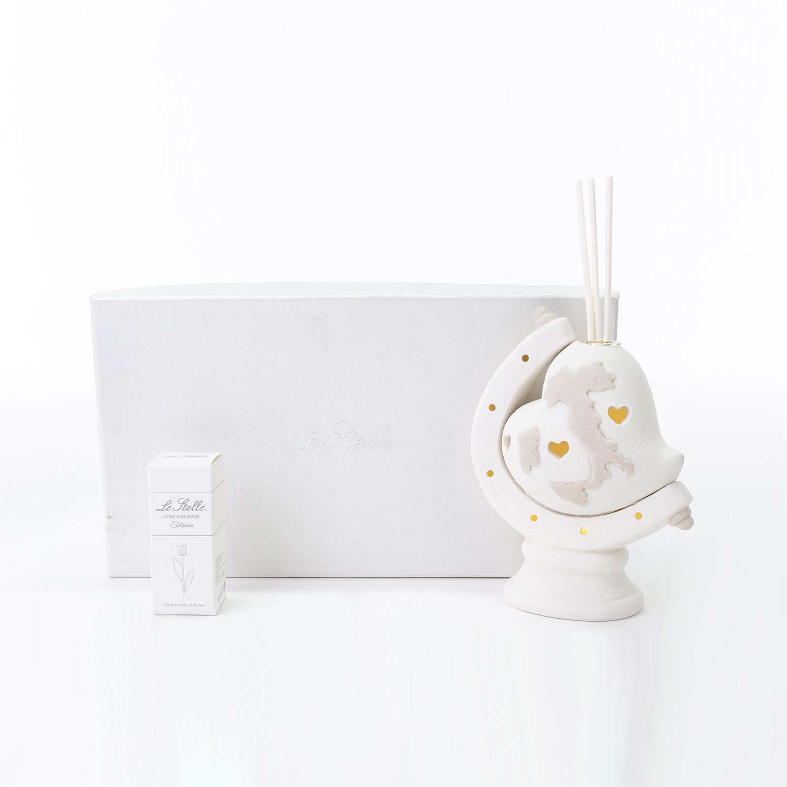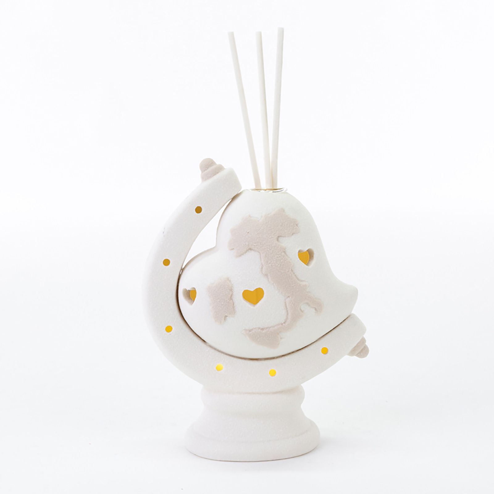Scegli la qualità delle nostre bomboniere in porcellana! Per te su ingrossoerisparmio.com questi particolarissimi diffusori di aromi per ambienti in porcellana purissima con lavorazione a effetto grana ruvida. Il profumatore ha la forma di un cuore con un supporto simile a quello dei mappamondi, su cui sono praticati dei fori da cui filtra la luce del dispositivo led. Nella parte superiore è invece presente l'alloggiamento in cui inserire i bastoncini e l'essenza aromatica. La particolarità di questi profumatori consiste nel fatto che sulla parte frontale del cuore è raffigurata in tonalità tortora una cartina dell'Italia.