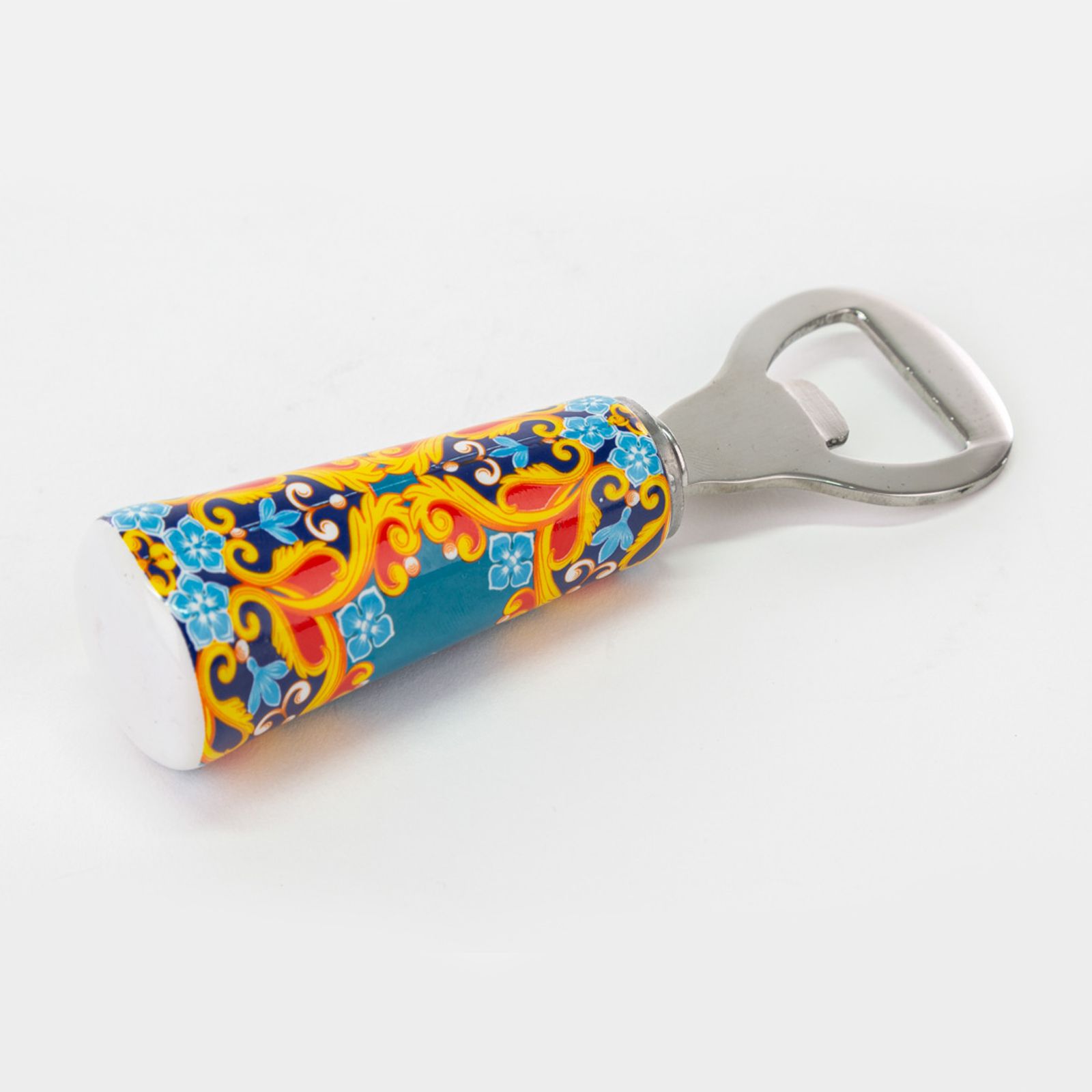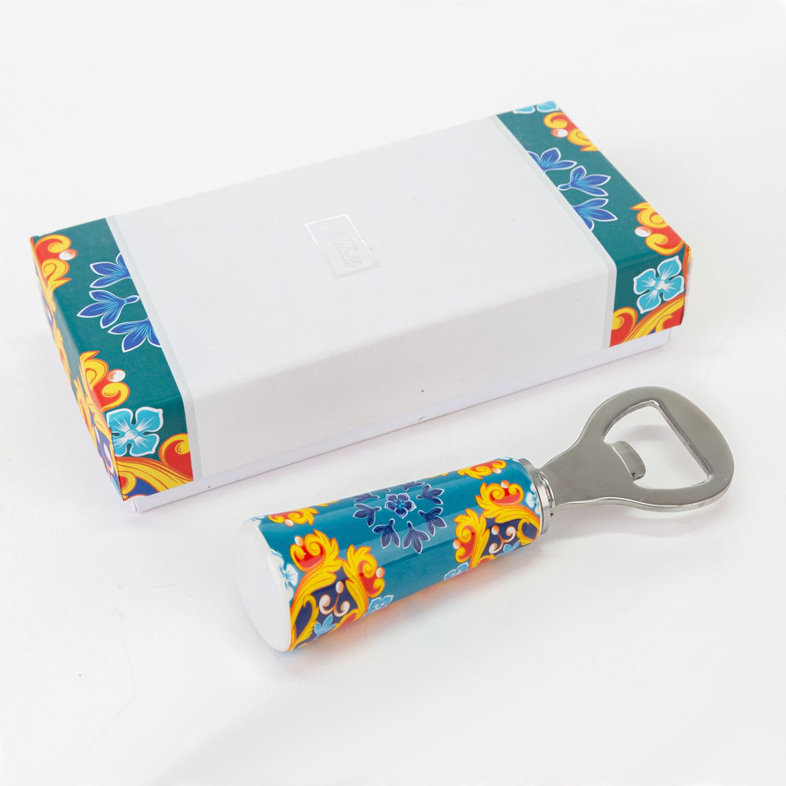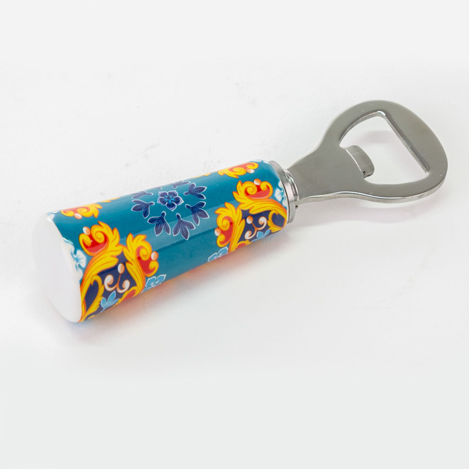 Come i nostri apribottiglie in metallo con manico in ceramica riccamente decorato con una fantasia barocca nelle tonalità del blu, verde petrolio, giallo e arancio. Un regalo gradito di grande impatto visivo e di grande praticità!
