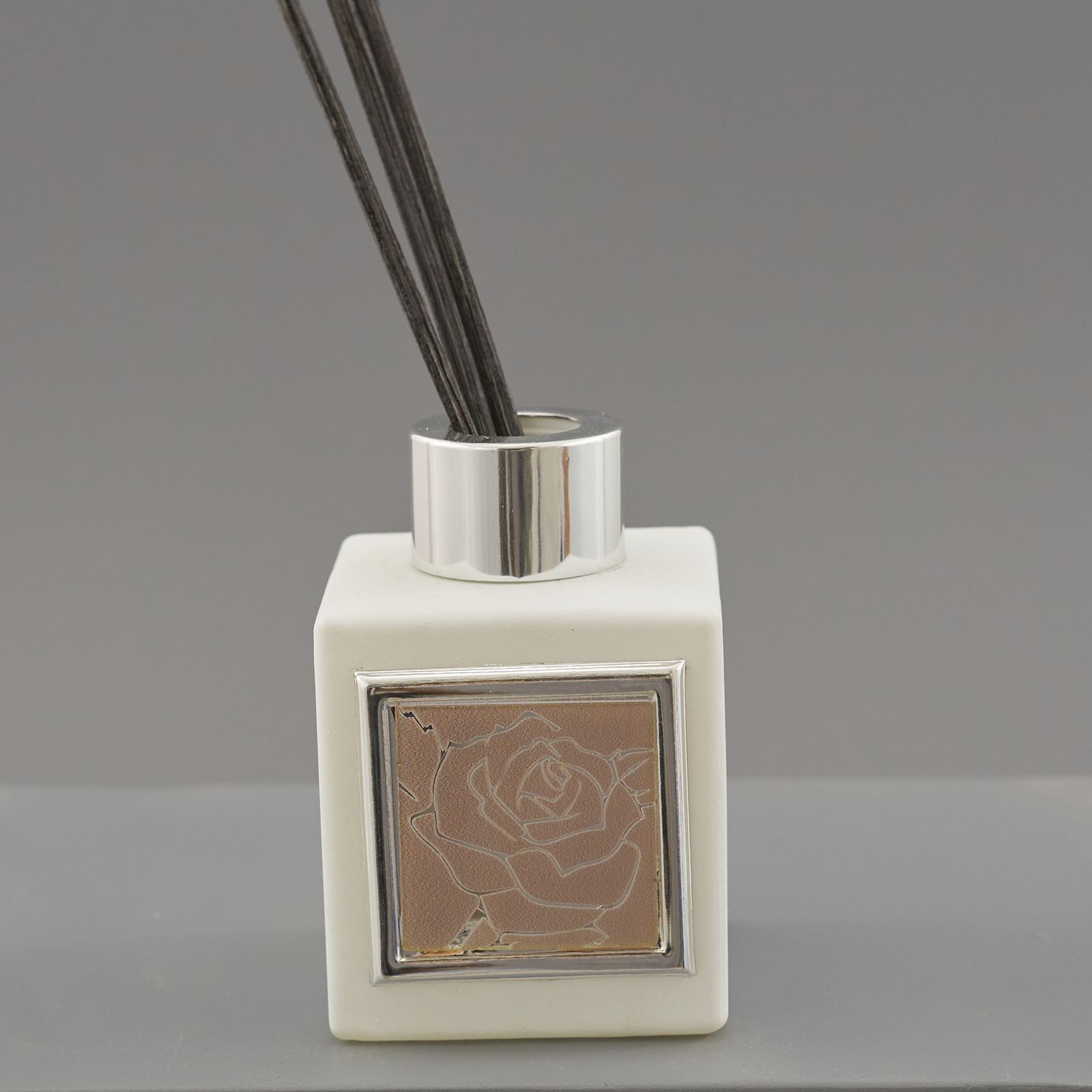 Come i nostri diffusori di aromi in vetro bianco satinato a base cubica, con capacità da 100 ml. Sulla parte frontale del profumatore è applicata una decorazione con cornice quadrata argentata, raffigurante una rosa bianca su sfondo tortora. Il tappo forato a vite presente sul collo, è anch'esso in color argento. Completa il tutto la presenza di bastoncini in legno inclusi.