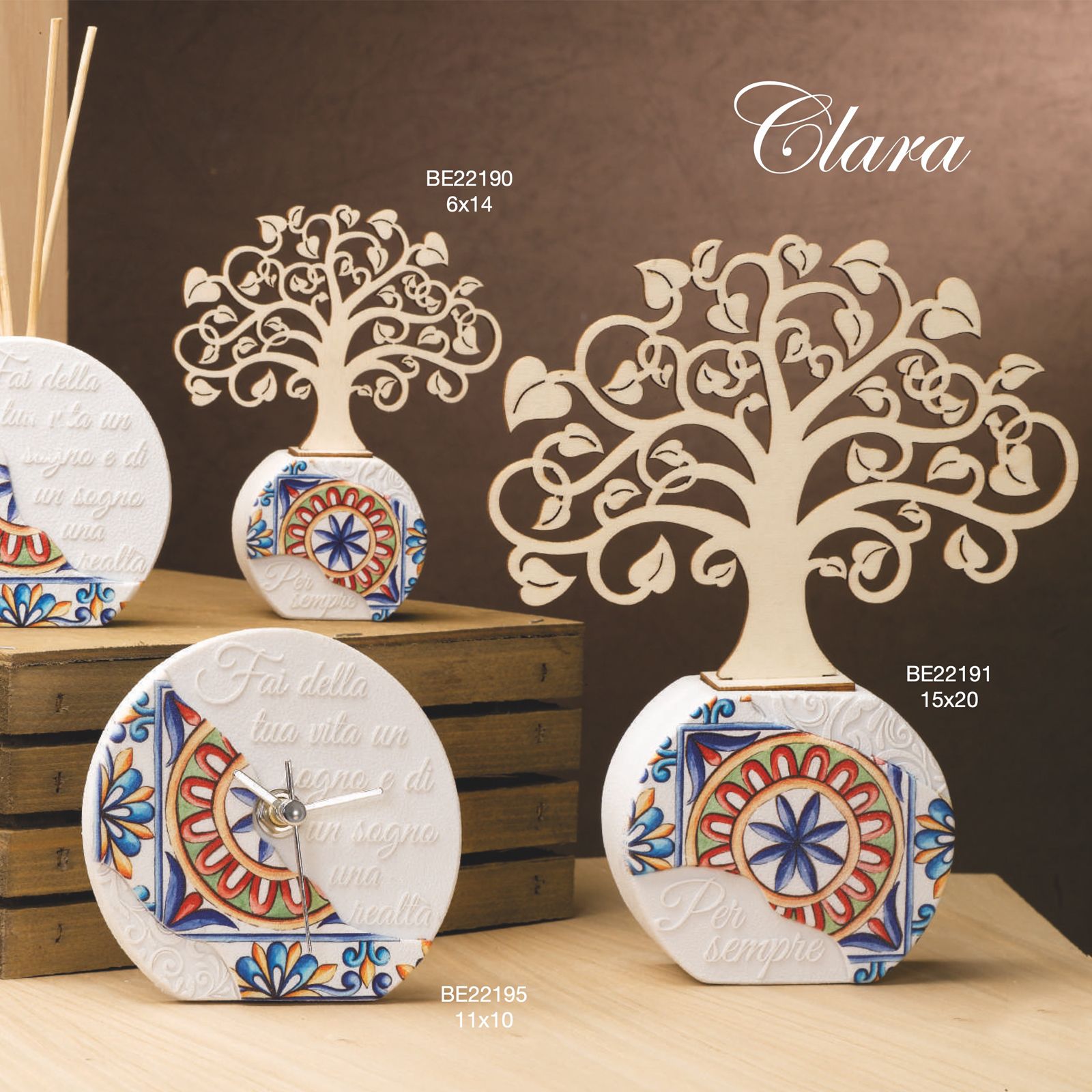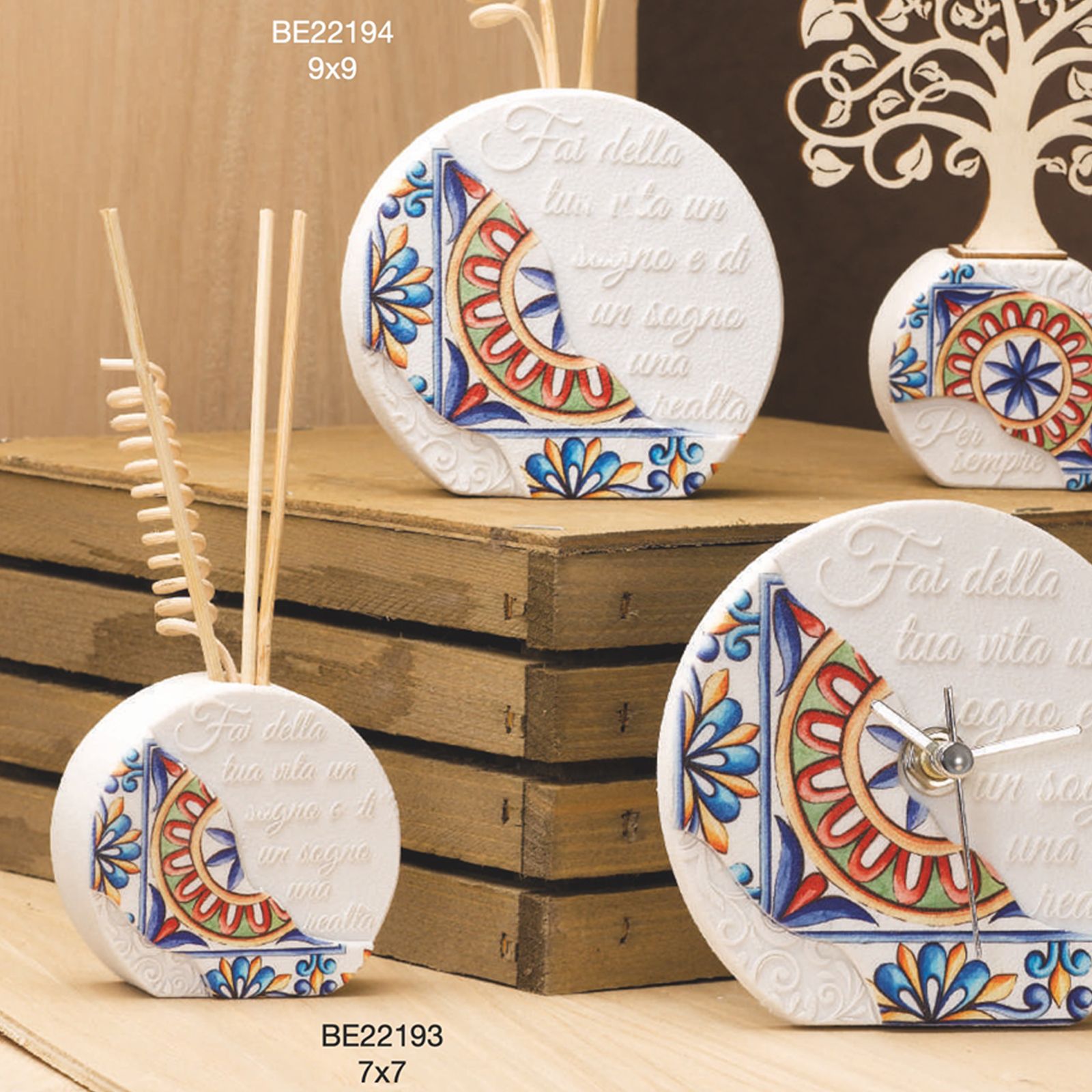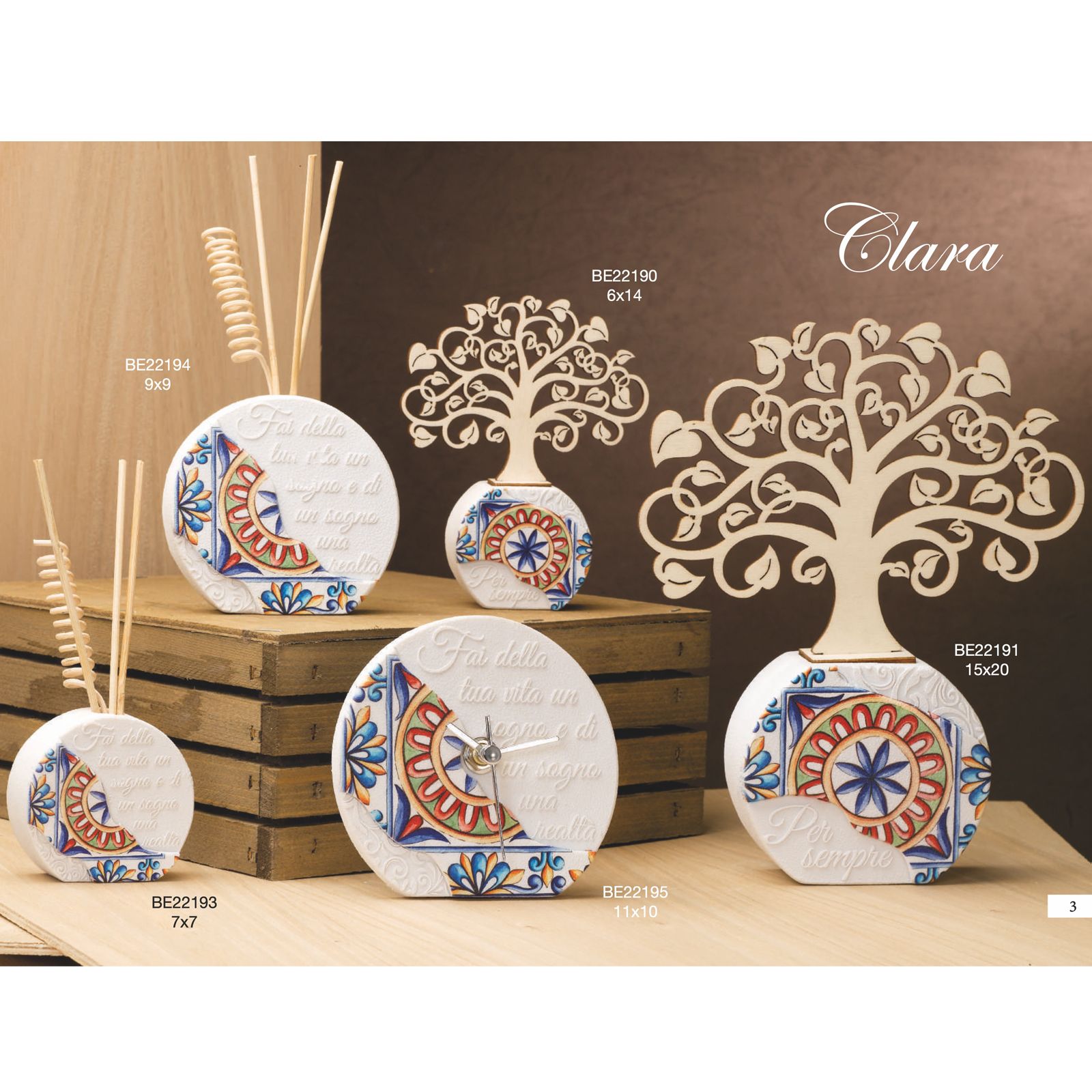 Dal catalogo 2022, eccoti la linea Clara comprendente diffusori per ambienti e orologio da tavolo con scritte in rilievo intervallate da particolari decorati in motivo a maiolica.