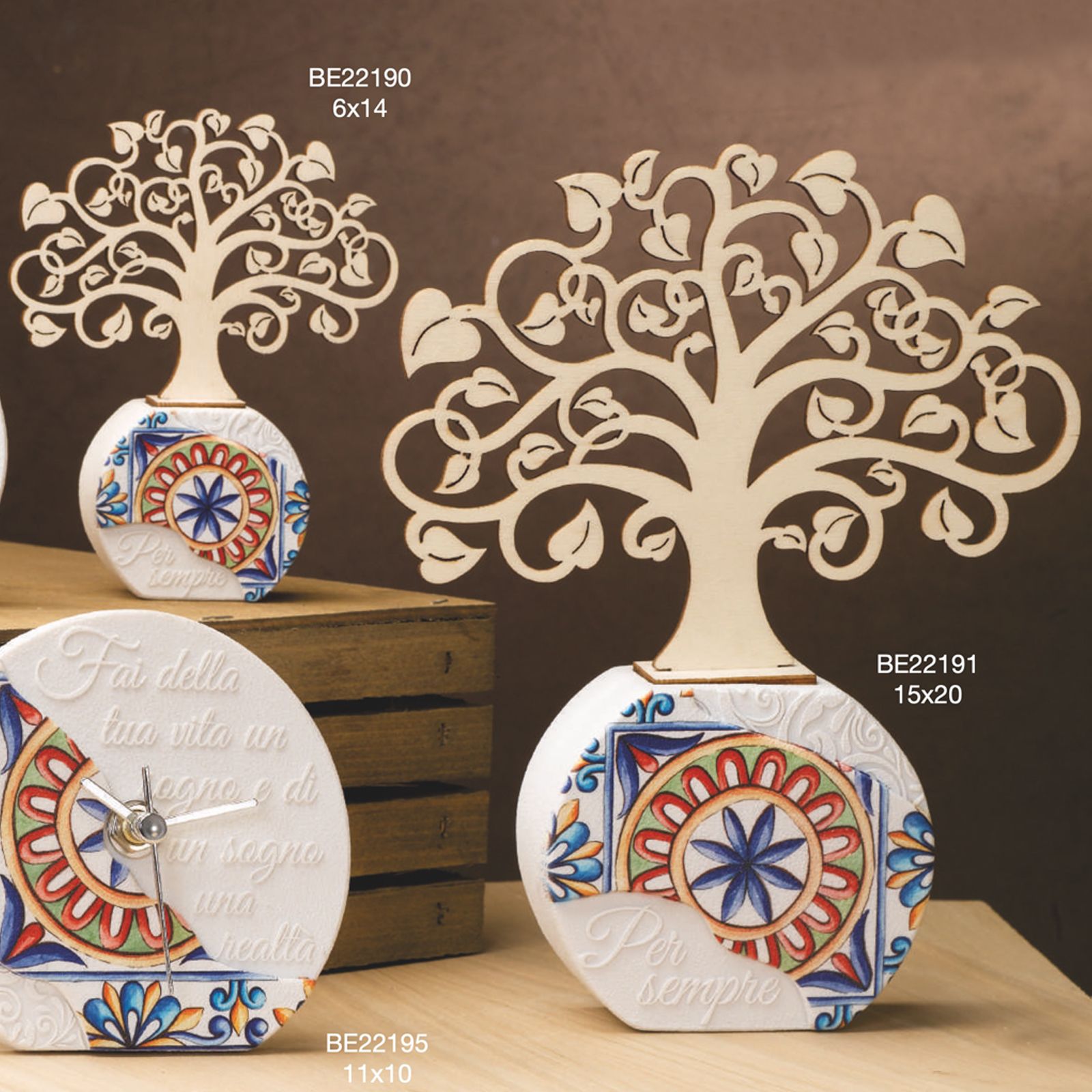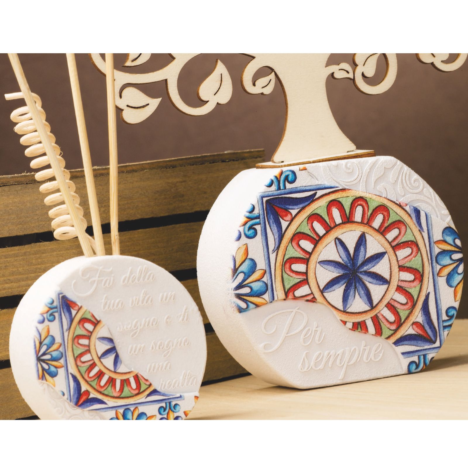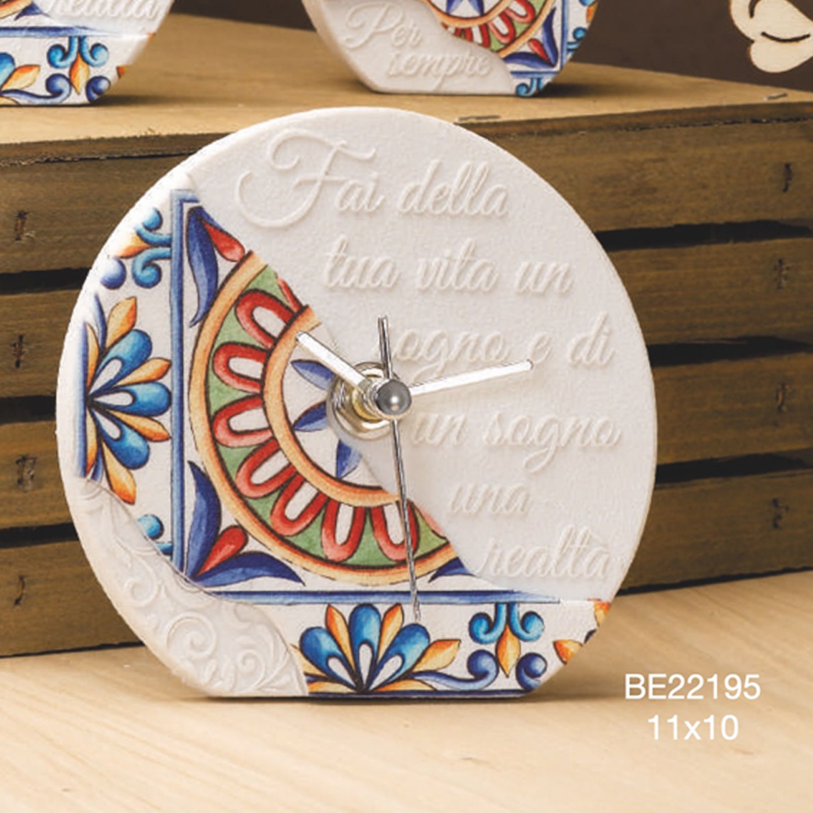 Dal catalogo 2022, eccoti la linea Clara comprendente diffusori per ambienti e orologio da tavolo con scritte in rilievo intervallate da particolari decorati in motivo a maiolica.
