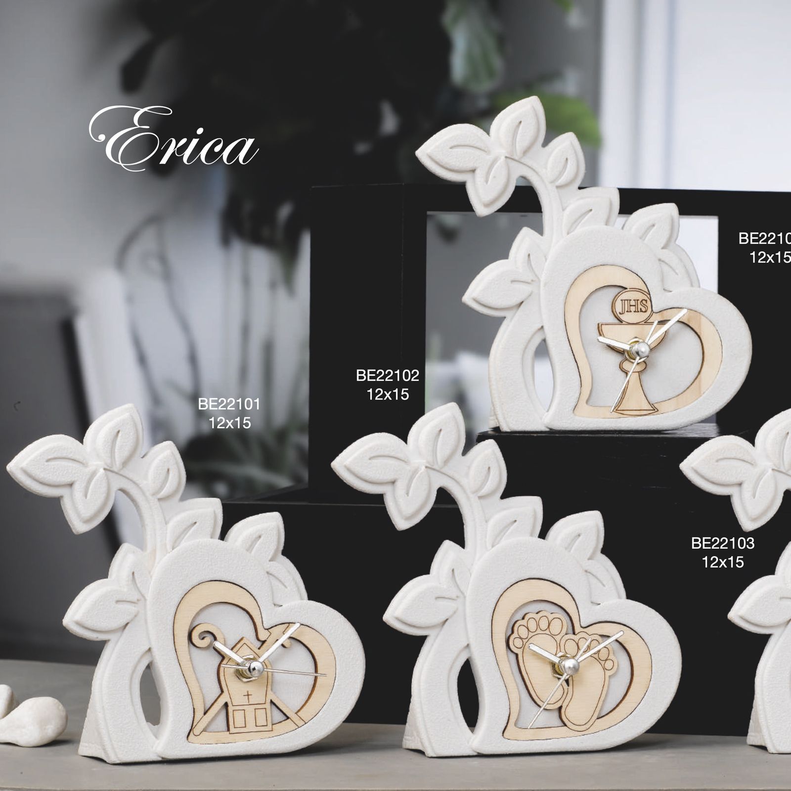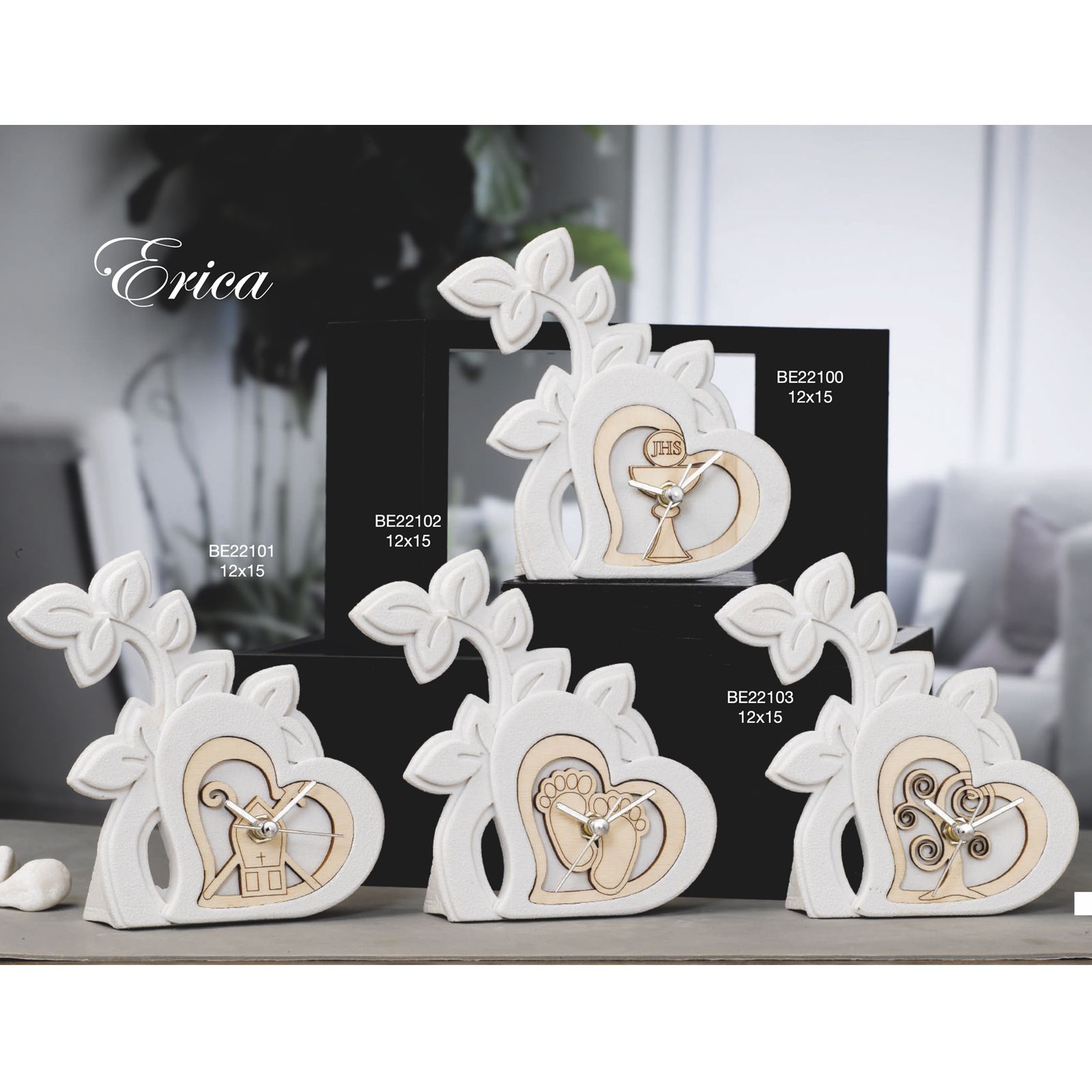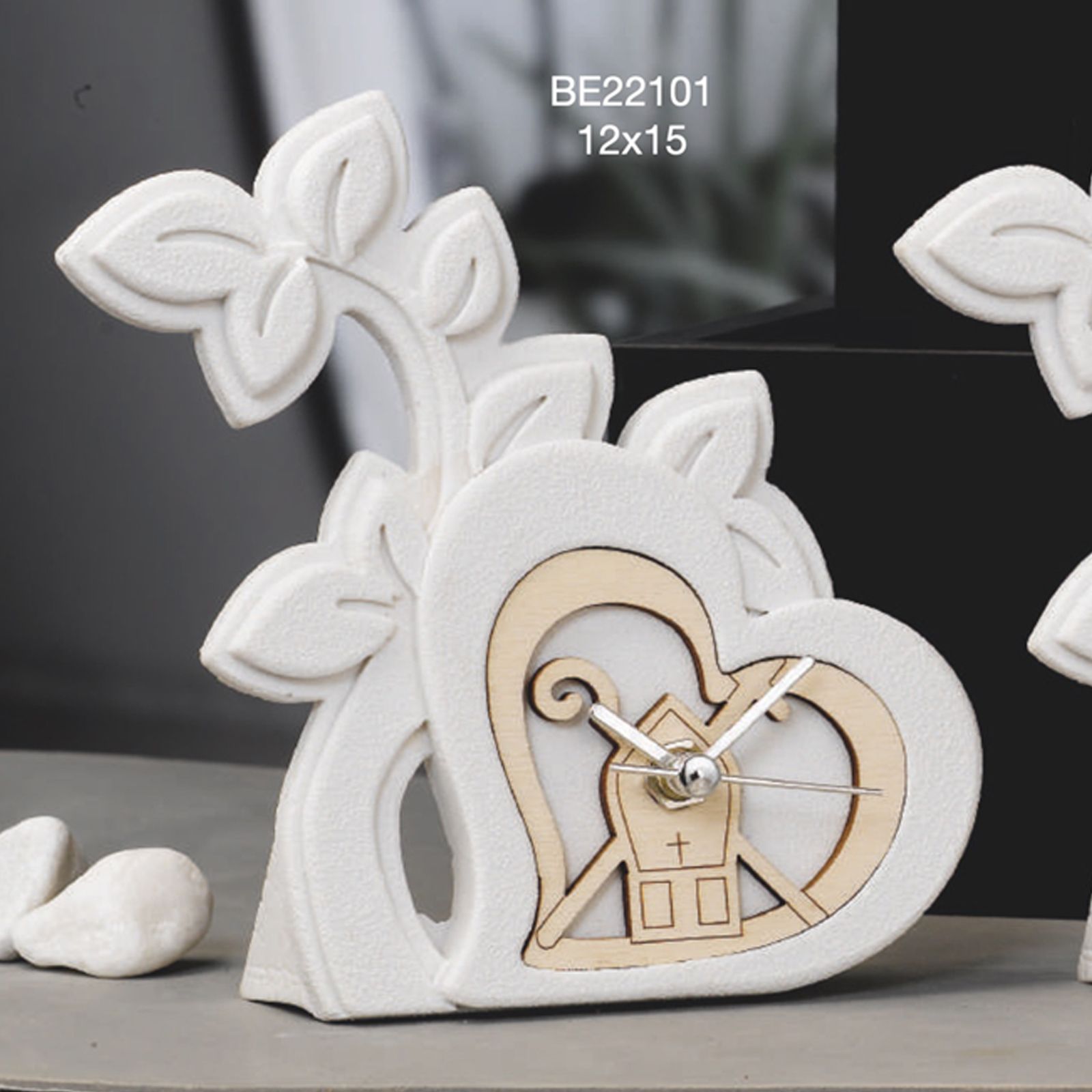 Direttamente dal catalogo 2022, dalla linea Erica, abbiamo selezionato per te questi eleganti orologi da tavolo a forma di cuore con un ramo laterale con foglie, in resina e polvere di marmo bianca, con applicazione centrale in legno a forma di cuore con simboli diversi in base al modello e alla ricorrenza.