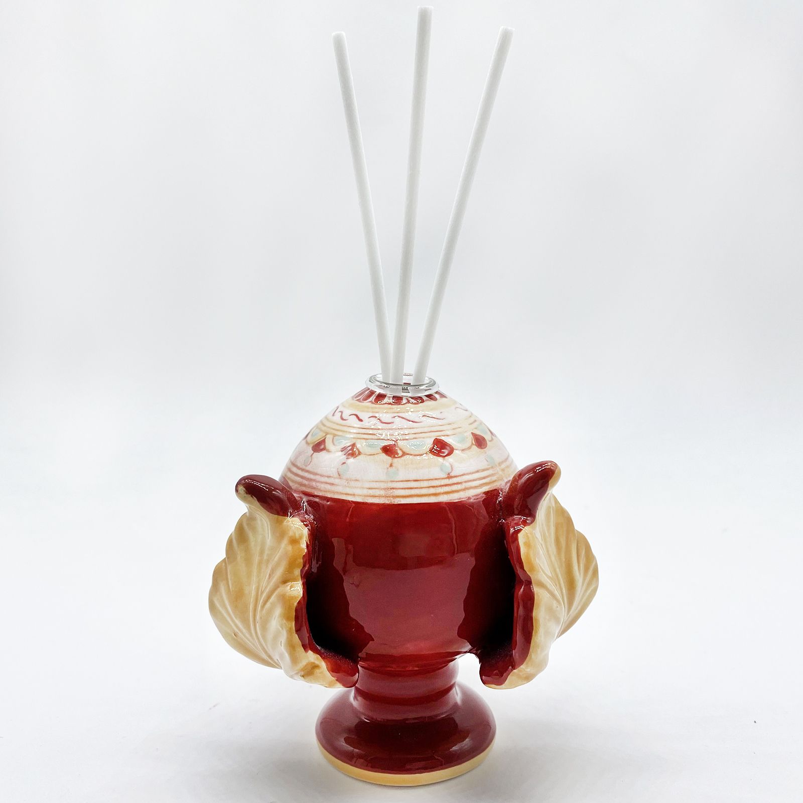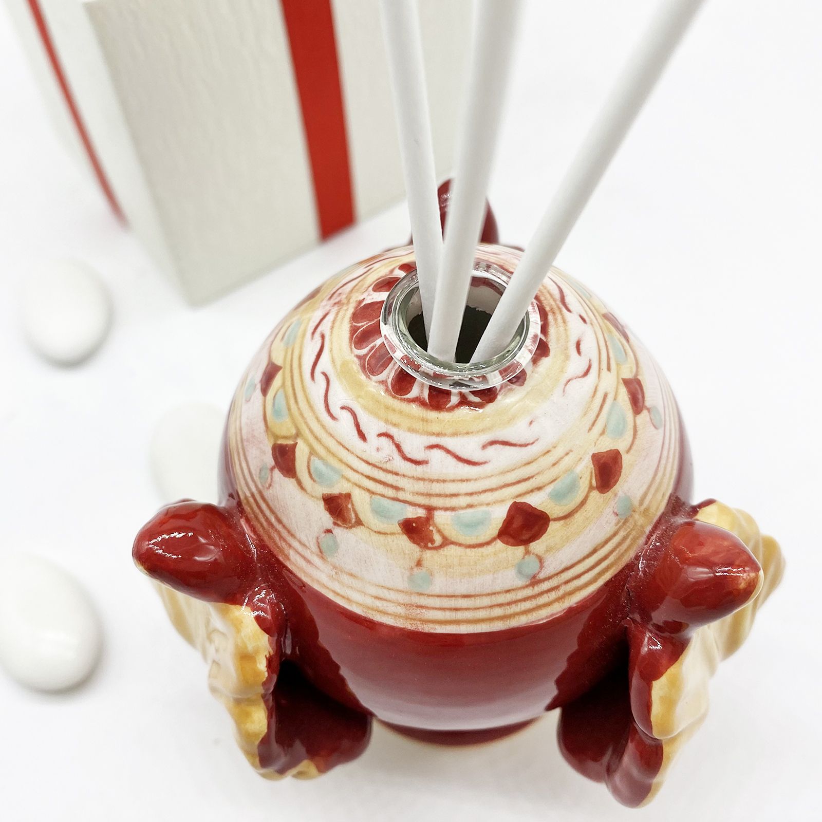 Scegli i nostri pumi in porcellana, profumatori con fiala dipinti con una fantasia in tonalità scarlatta con richiami in ocra e piccoli dettagli tiffany con un gioco geometrico.