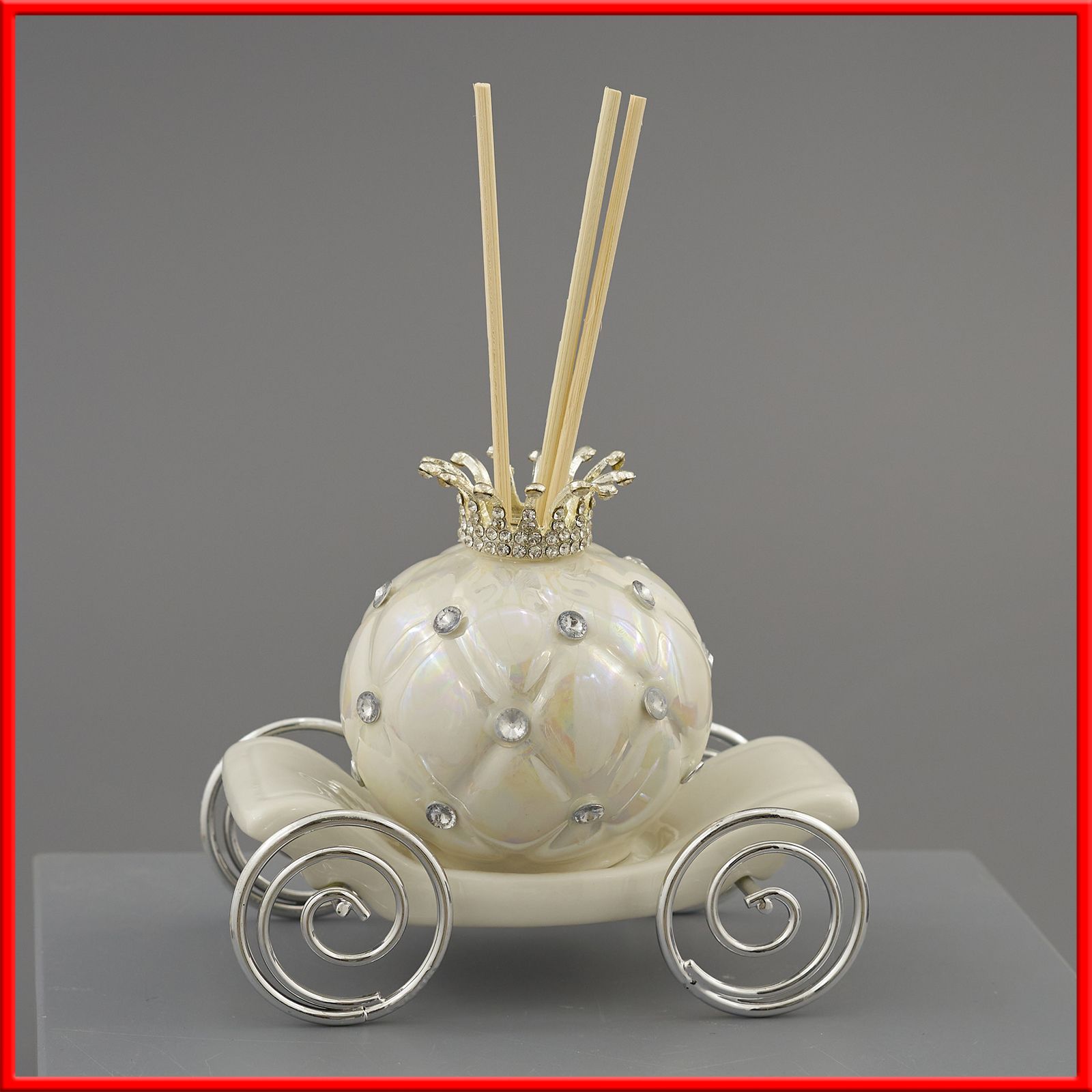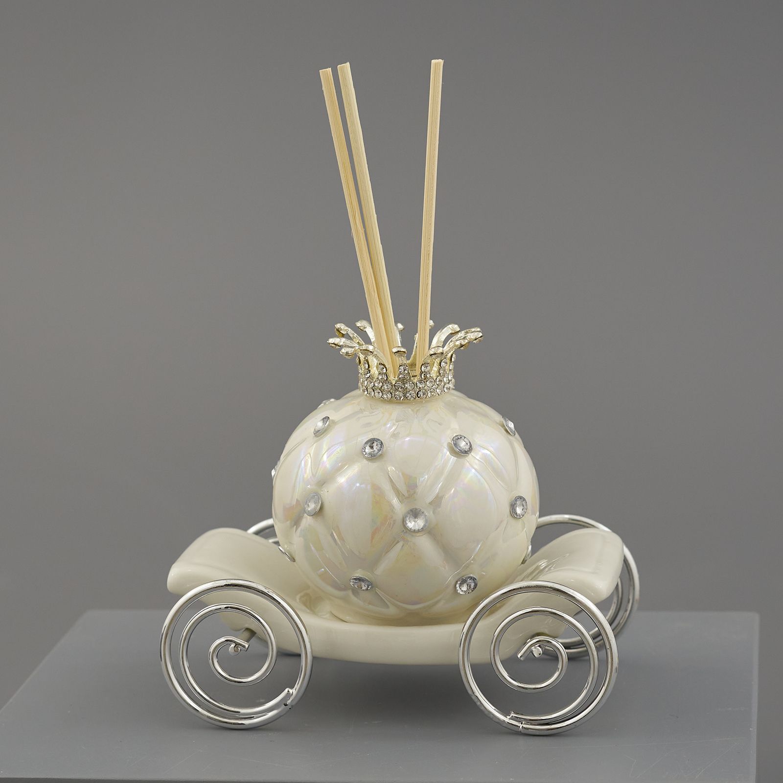 Ordina adesso questi incantevoli profumatori per ambienti a forma di carrozza di Cenerentola con dettagli in metallo su ruote e corona, in tonalità bianco perlato con strass e lavorazione a finta impuntura.