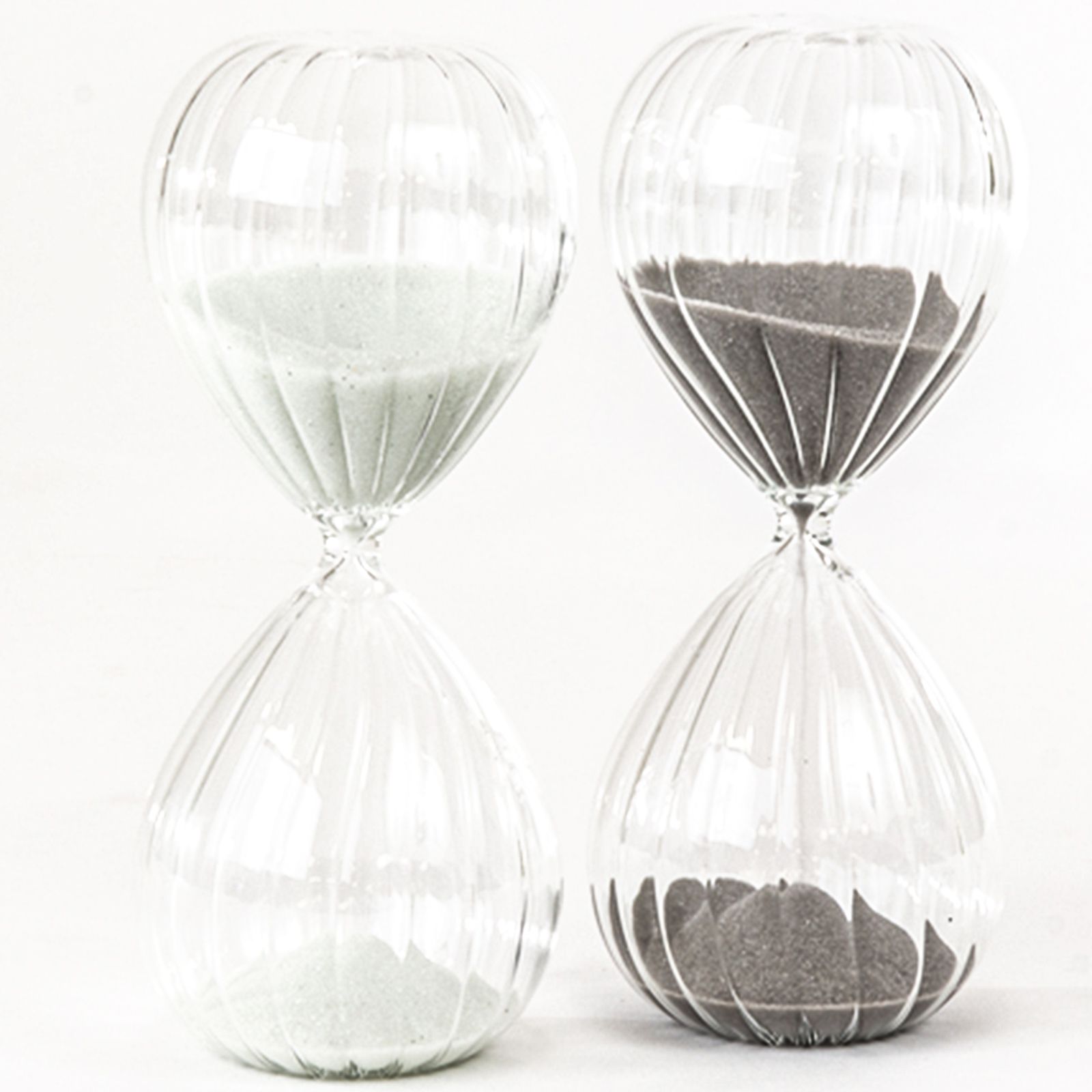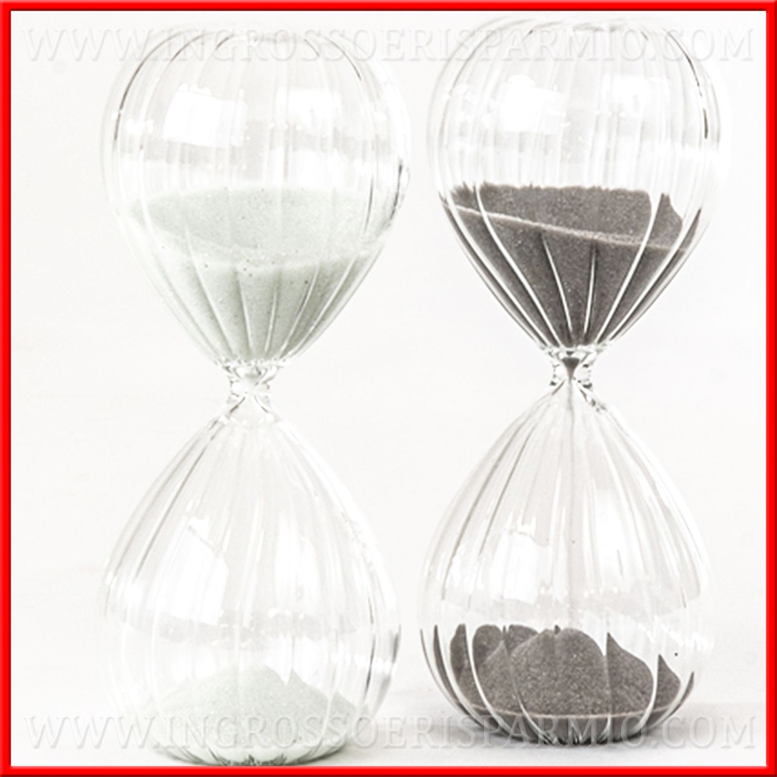 Solo per te su ingrossoerisparmio.com delle bellissime clessidre in vetro con una particolare lavorazione a righe, con all'interno sabbia bianca o grigia (non è possibile scegliere solo un colore per la sabbia).