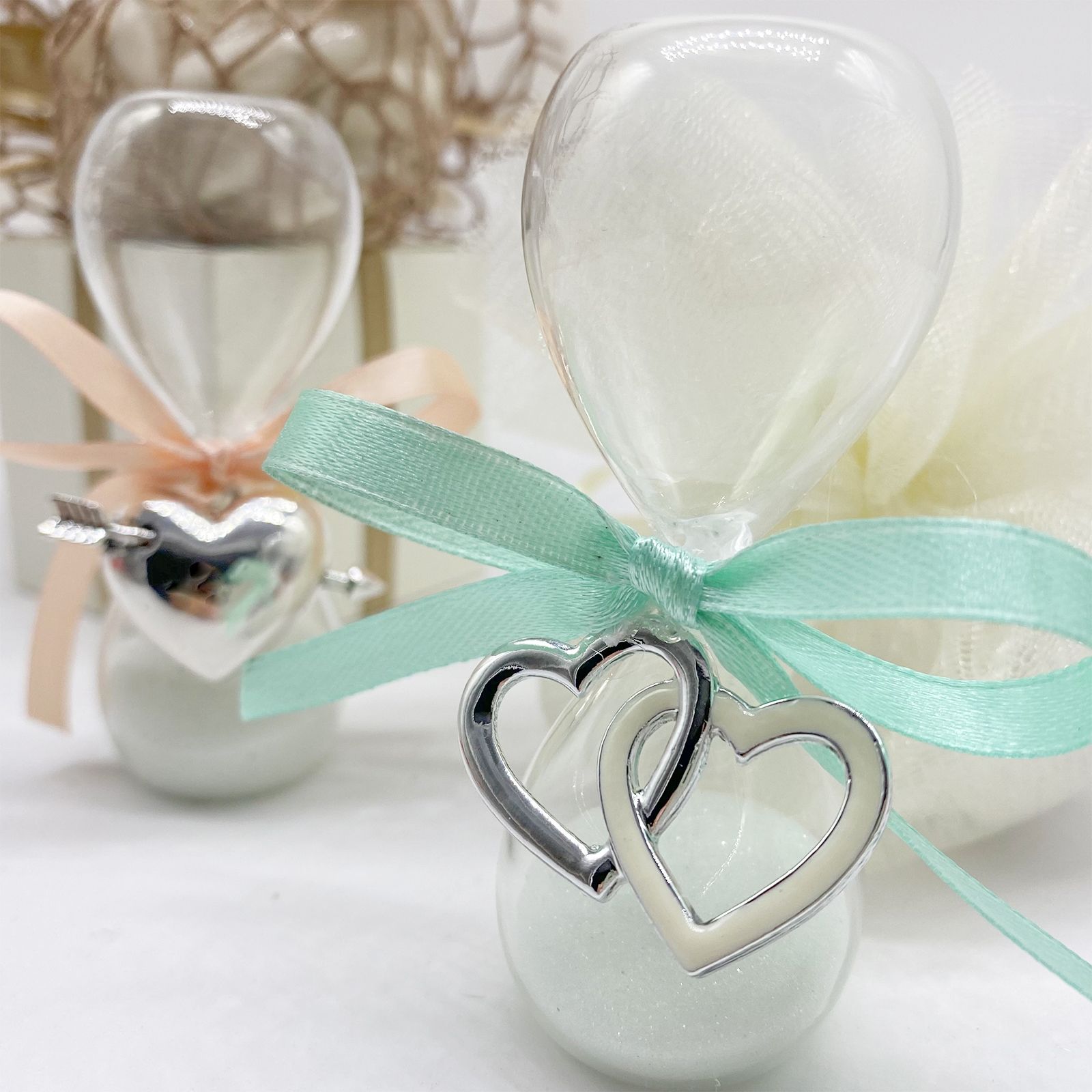 Realizza degli eleganti segnaposto con le nostre clessidre in vetro con ciondolo per cui potrai scegliere il colore tra: