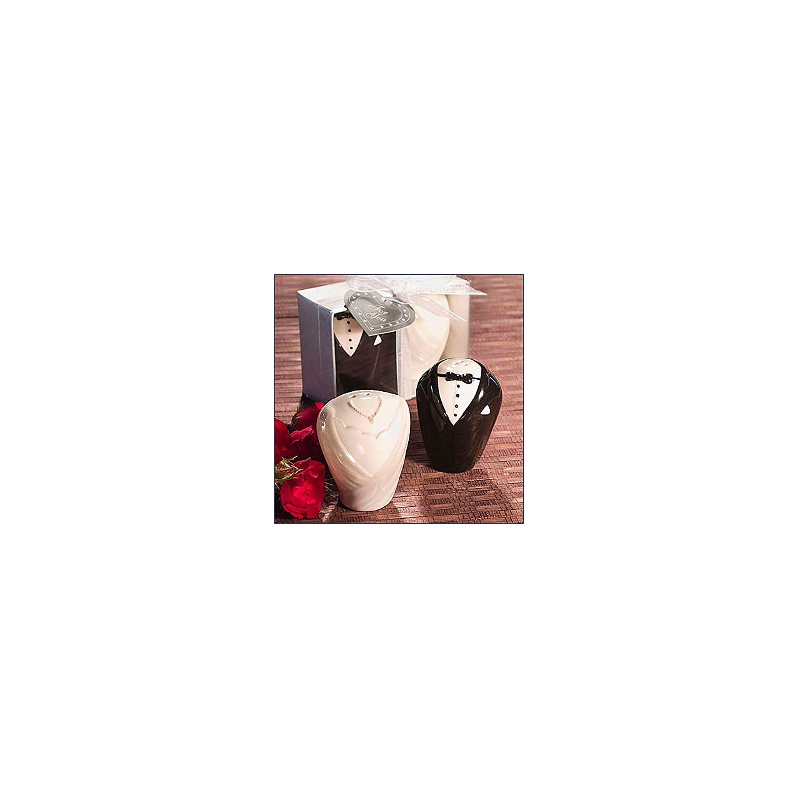 Come questo simpatico set sale e pepe in ceramica, a forma di abito da sposa e smoking da sposo divertente e utile allo stesso tempo! All'abito da sposa, bianco, è abbinata una collana mentre lo smoking è completo di papillon.