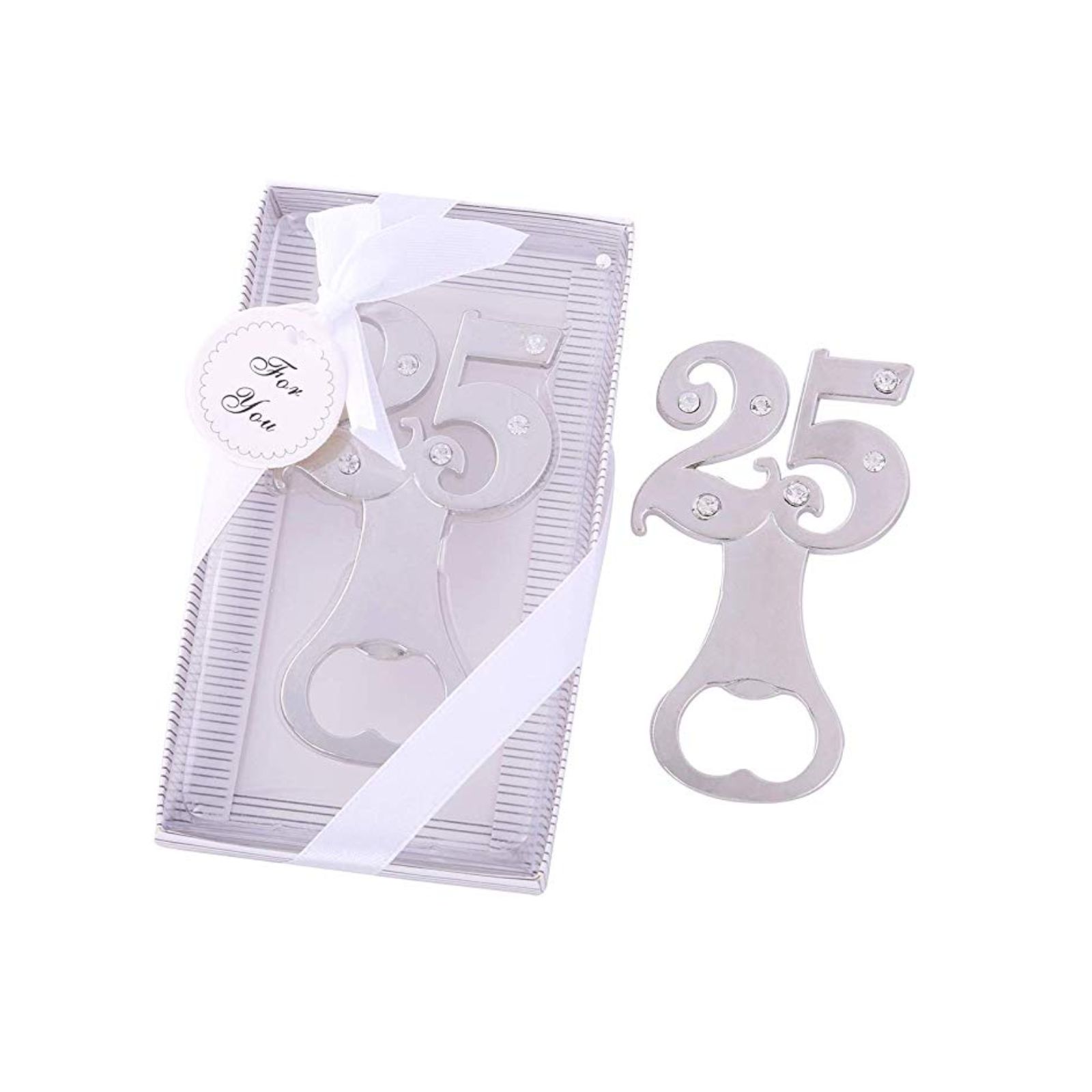 Disponibili per te questi utilissimi apribottiglie in metallo, con finitura cromata argentata e numero 25 con brillanti strass su entrambi i numeri. Scatola con coperchio in pvc in omaggio con ogni apribottiglie!