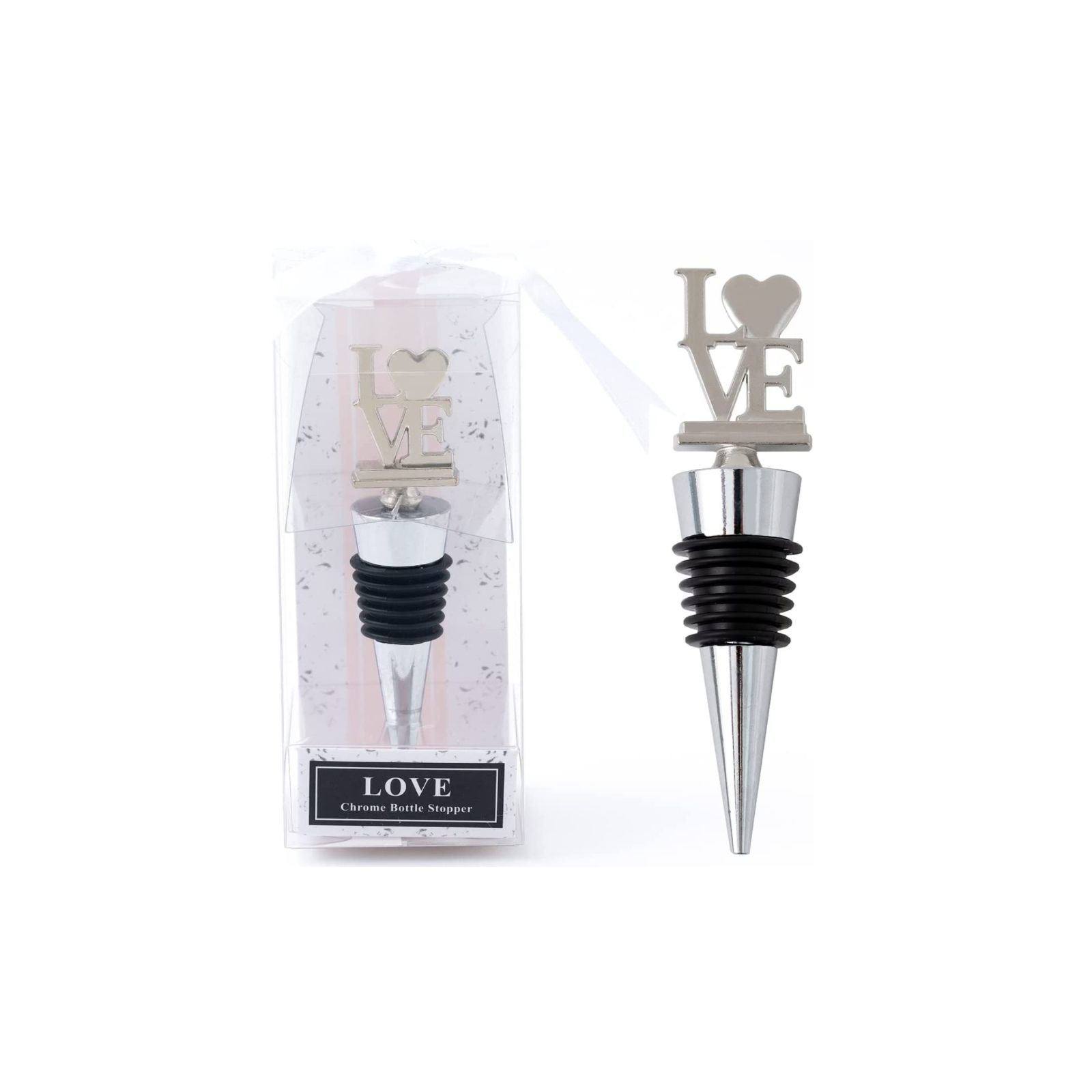 Come questi utilissimi tappi ermetici in acciaio inox con guarnizione in gomma, con la particolarità di avere sull'impugnatura, la scritta "Love" anch'essa in metallo con un cuore al posto della "O". Ogni tappo per vino arriva all'interno di una scatola con coperchio in pvc trasparente.