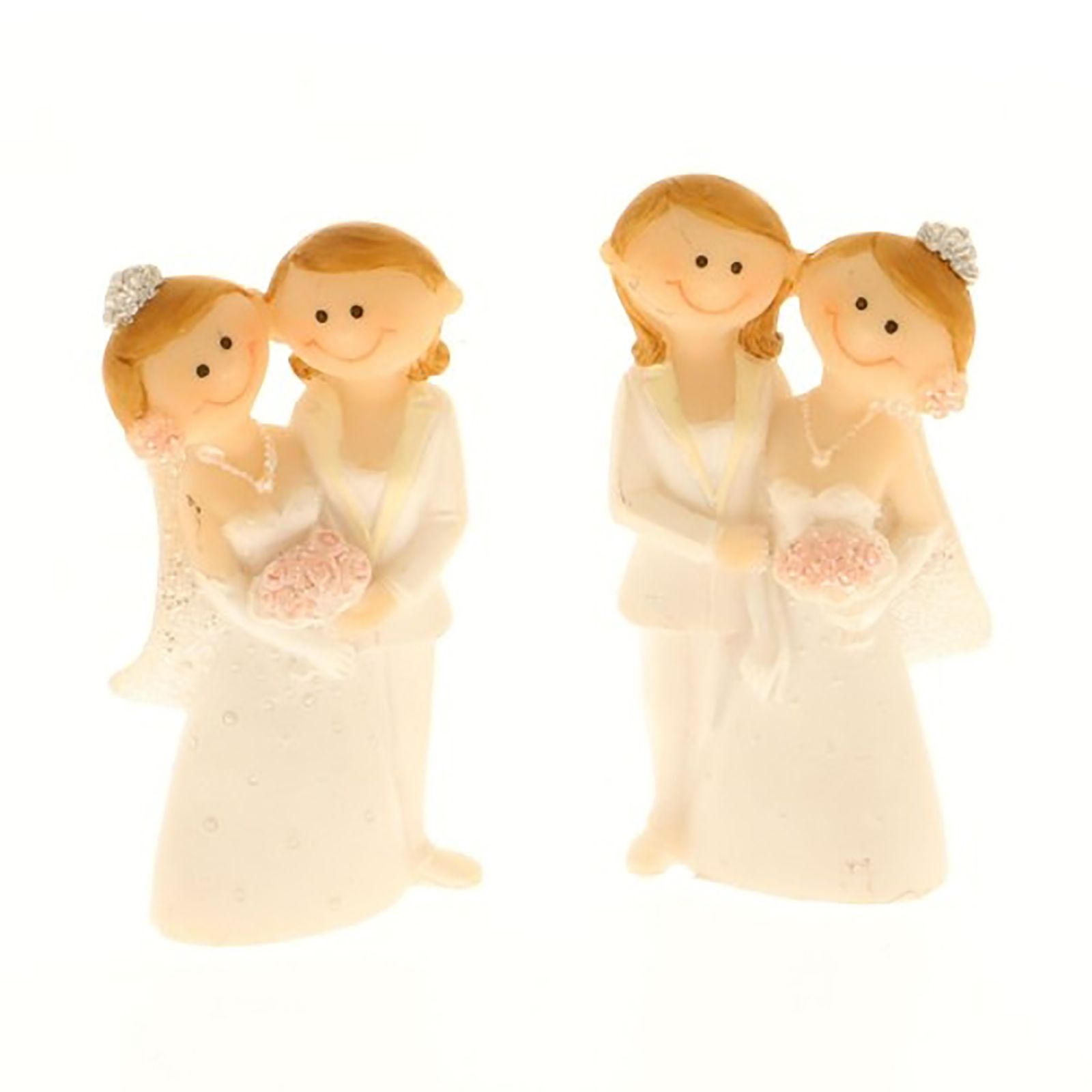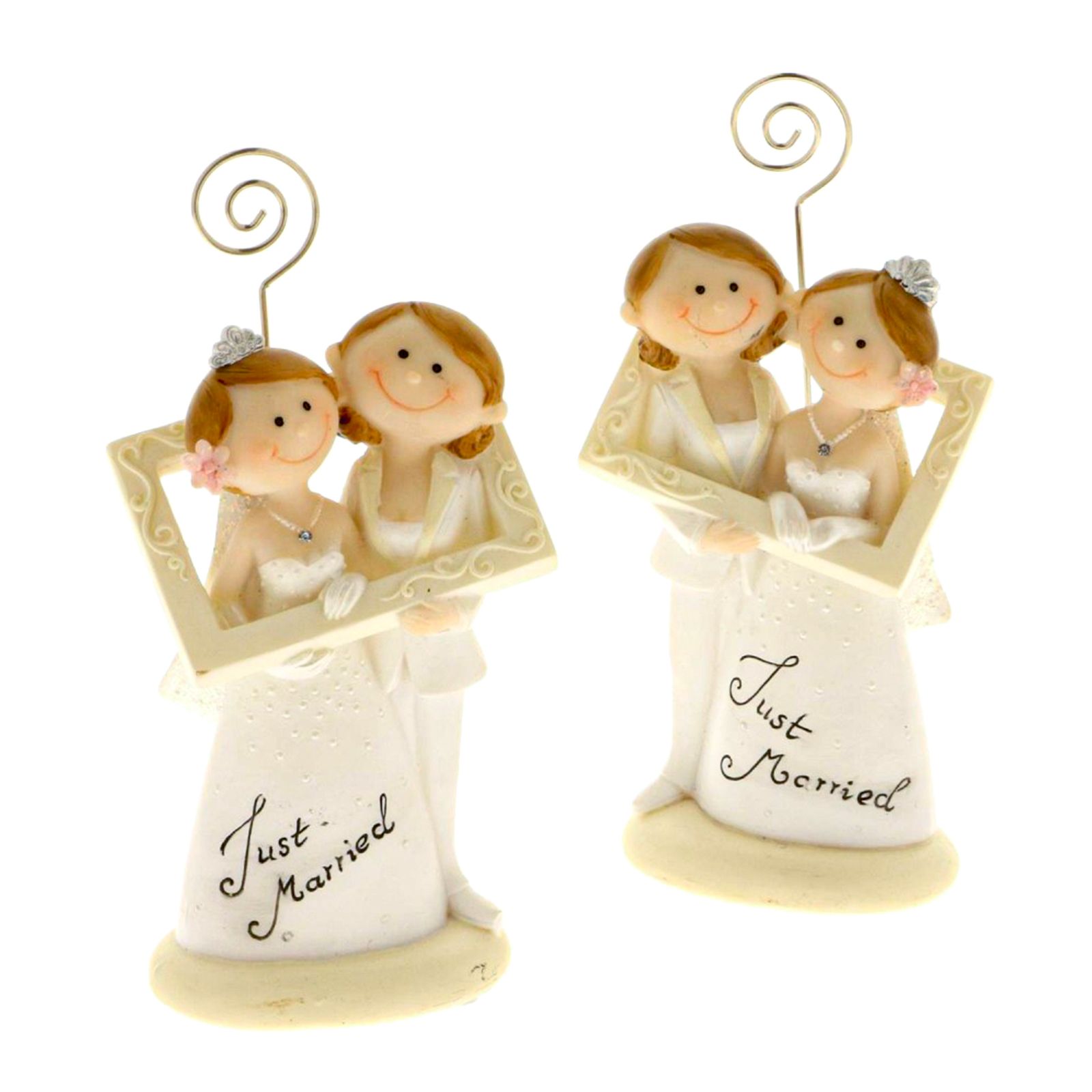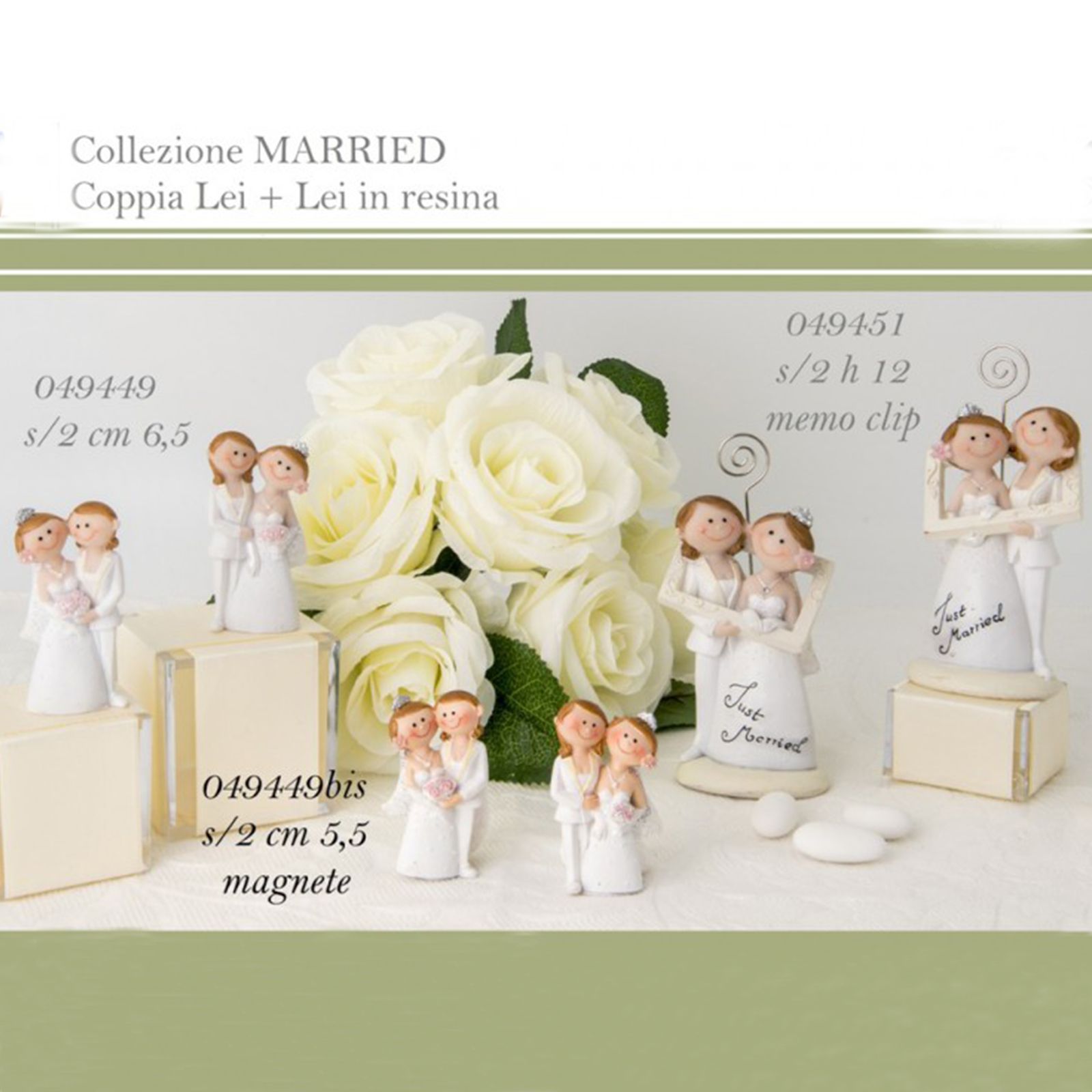 Tutta la collezione è assortita in due varianti di posa per le due spose, sul memoclip, alla base dell'abito è presente la scritta "Just Married".
