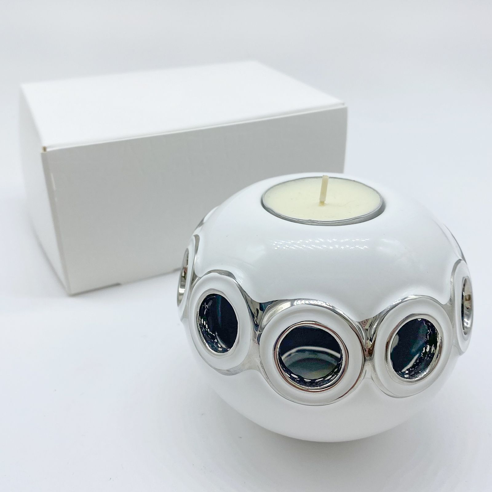 Disponibili per te questi eleganti portacandele in ceramica lucida bianchi con interno e decori argento con trafori circolari che percorrono tutta la circonferenza dell'oggetto. Lo spazio riservato alla candela ospita comodamente una tea light classica.