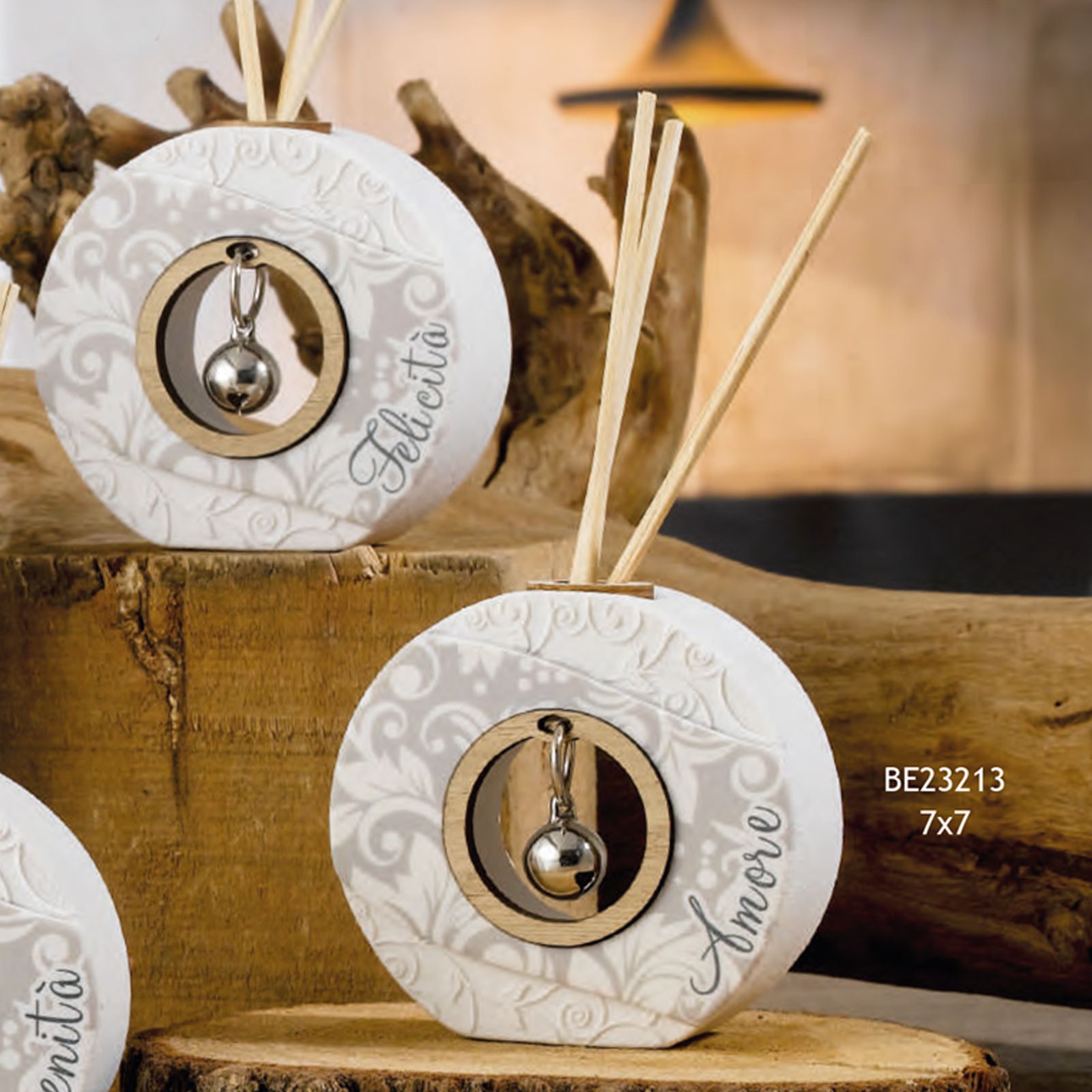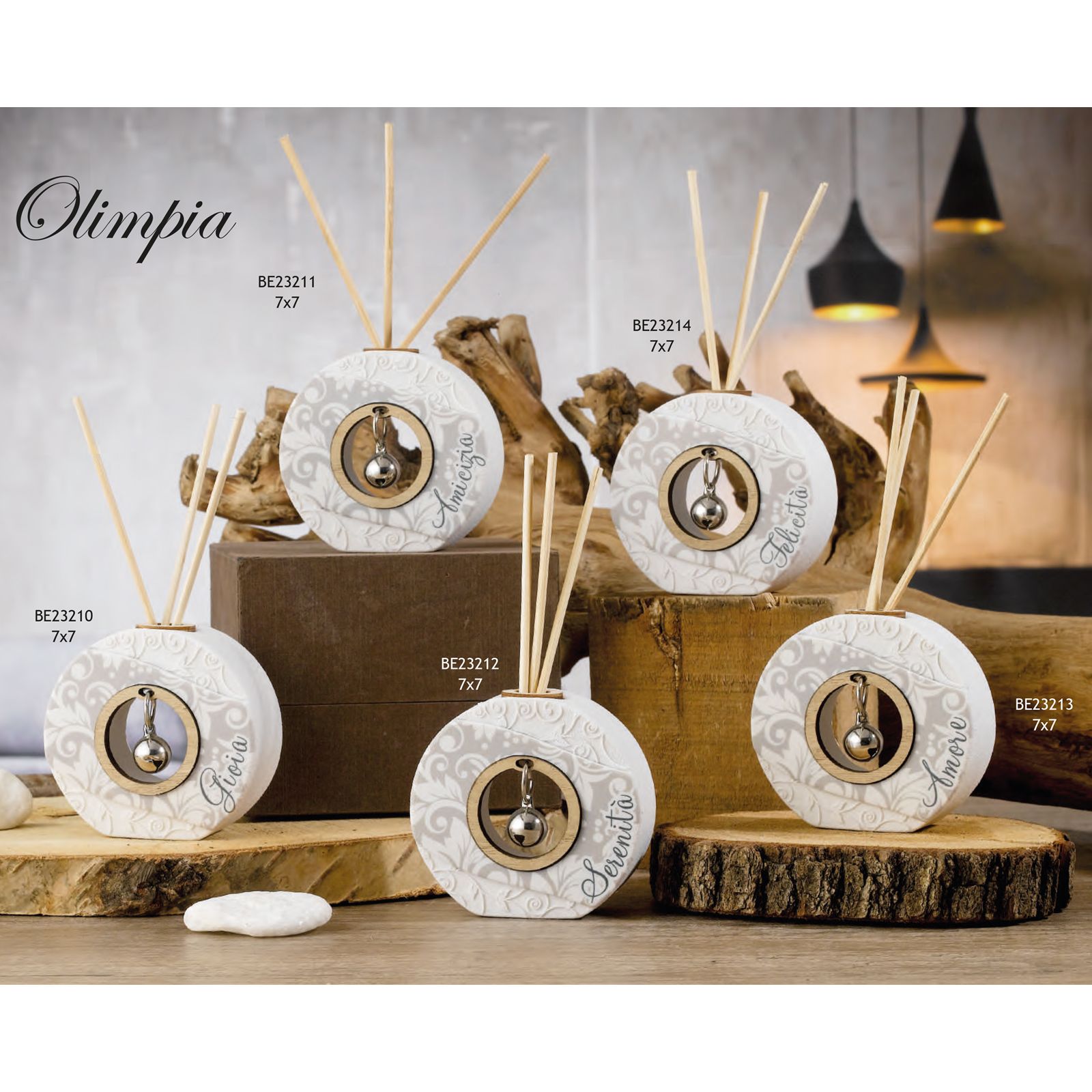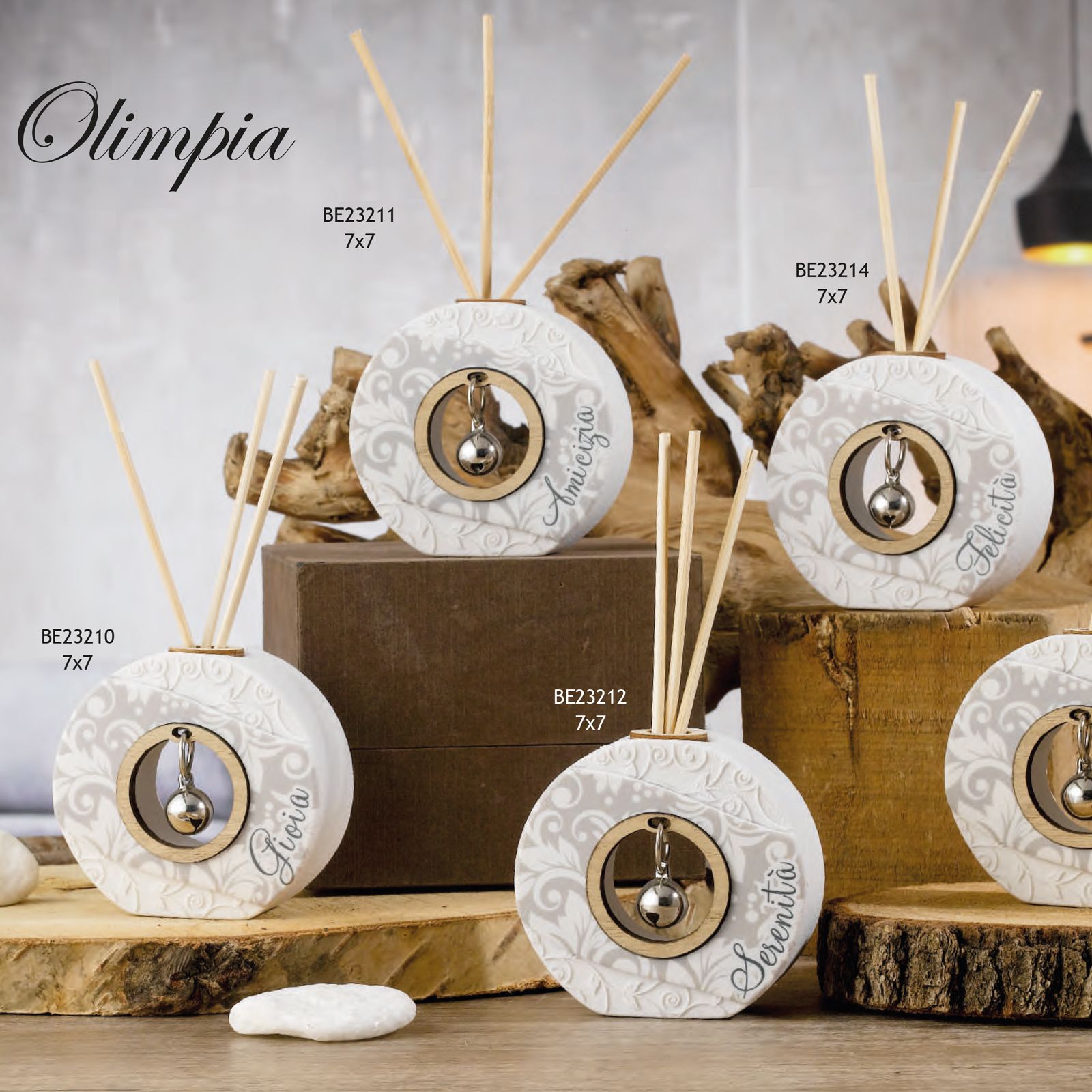 In esclusiva sul nostro store la linea Olimpia, che comprende diversi diffusori di essenze, in resina e polvere di marmo di forma circolare, con all'interno un piccolo sonaglio in metallo. Sulla parte frontale decorata con un delicato motivo floreale, è riportato un termine beneaugurante, che cambia a seconda dell'articolo scelto.