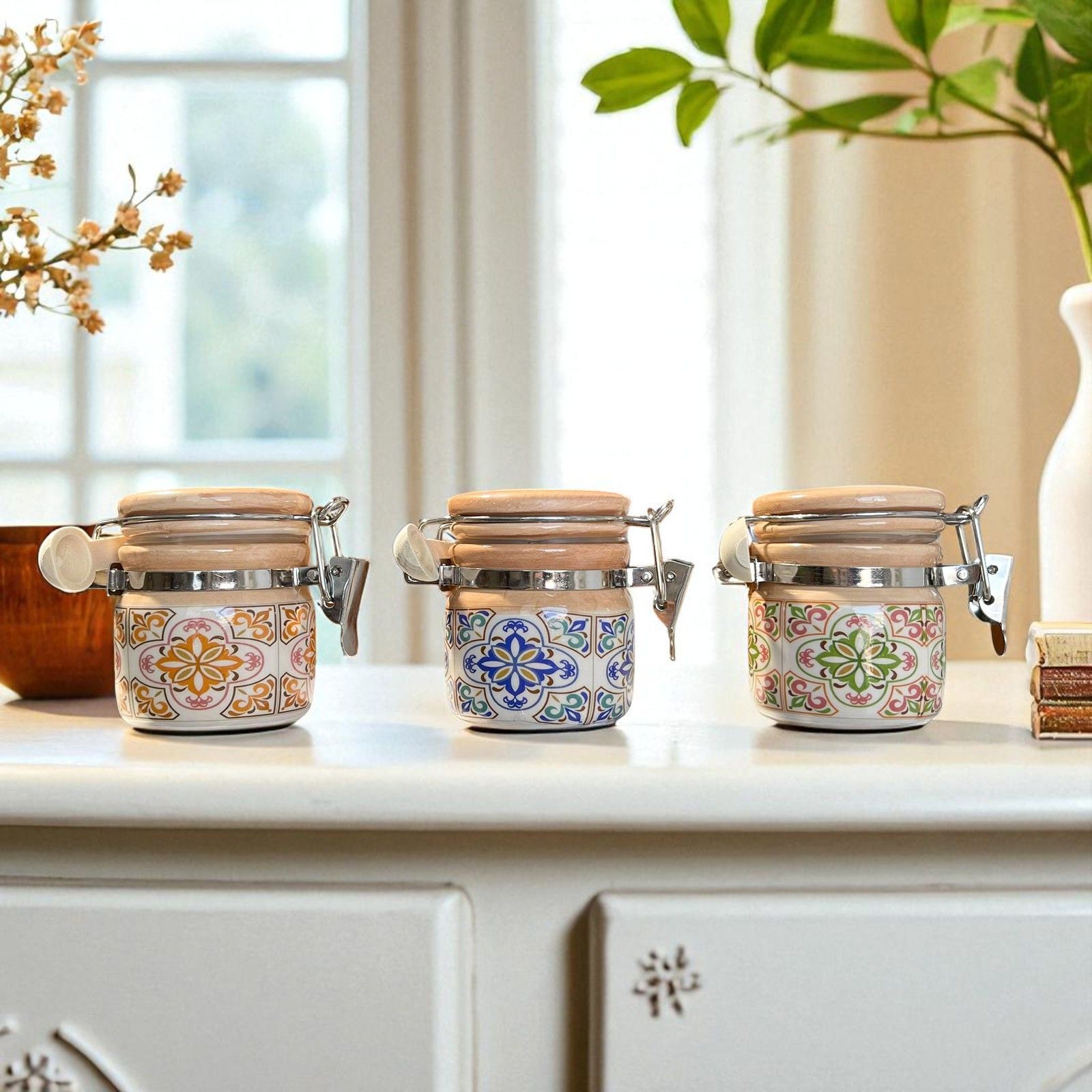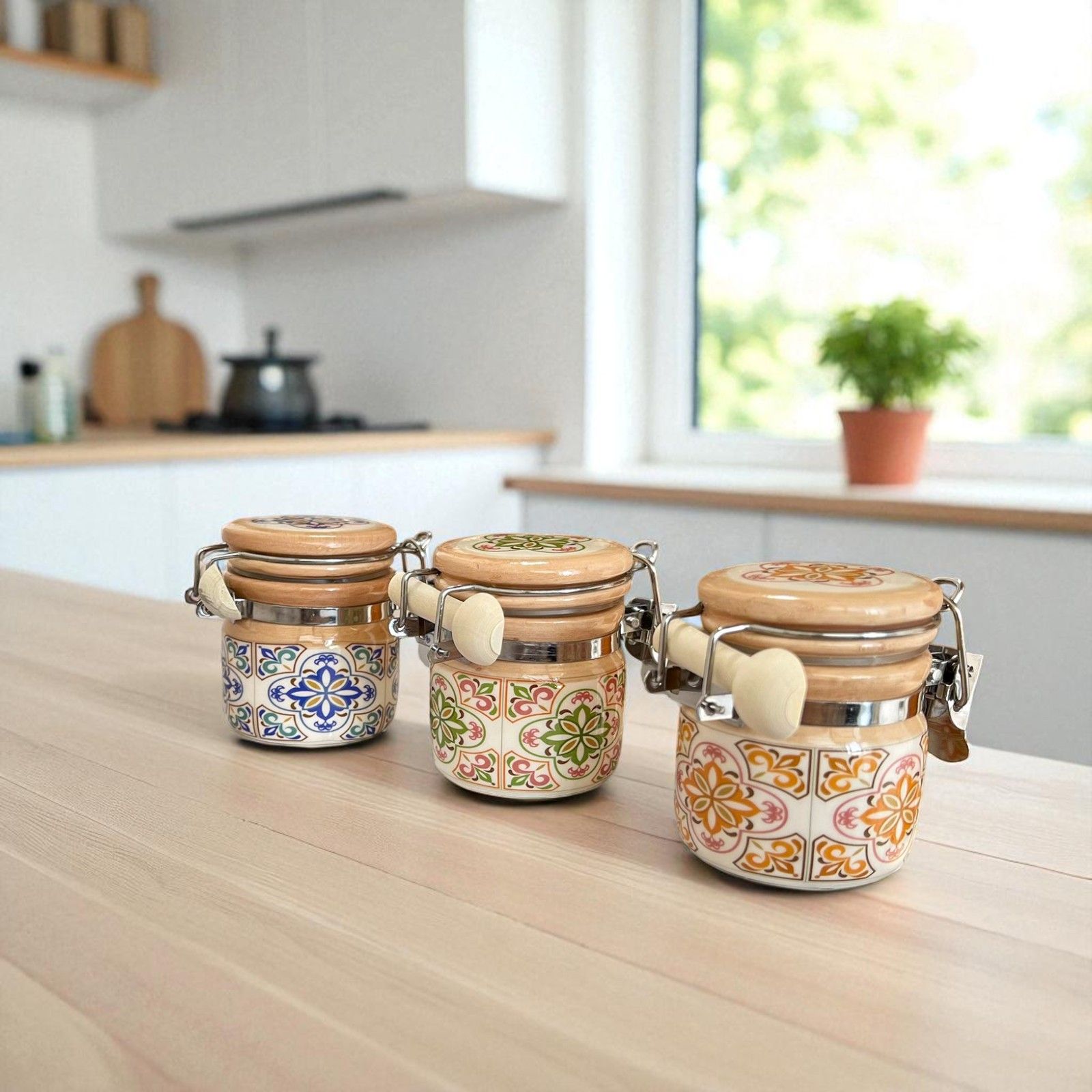 Barattolini maiolica portaspezie utilizzabili come portaconfetti originali, realizzati in porcellana ad effetto lucido con decorazioni nei toni nei toni assortiti del giallo, verde e blu. Tutti i vasetti bomboniere presentano un piccolo cucchiaino in legno e la chiusura ermetica in metallo a gancio.