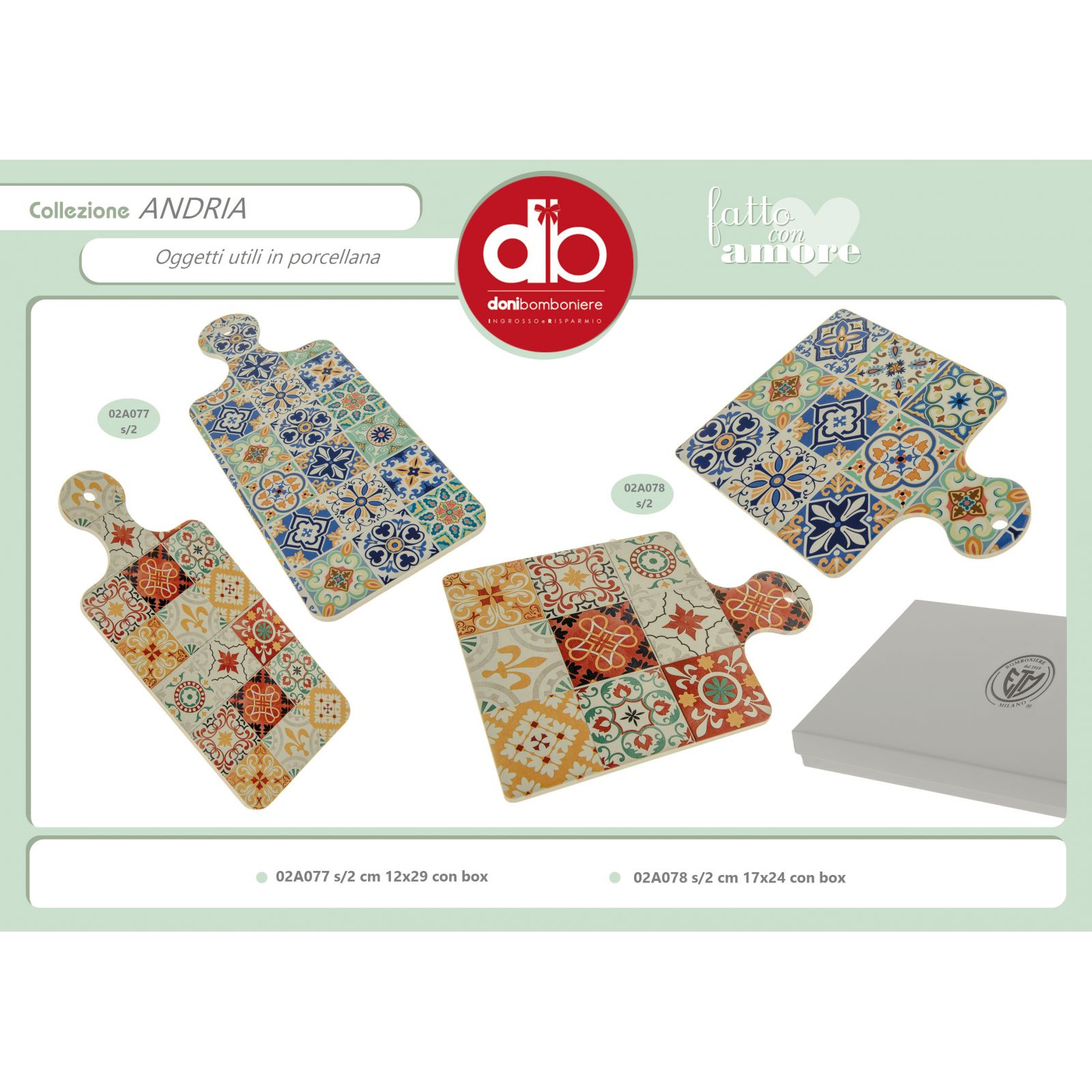 Taglieri bomboniere in porcellana lucida con base antiscivolo e decorazioni maiolica in due tonalità assortite: blu e arancio con decori particolarissimi a mattonelle. I taglieri antipastiera presentano un foro sul manico per poter essere eventualmente appesi come taglieri decorativi in cucina.