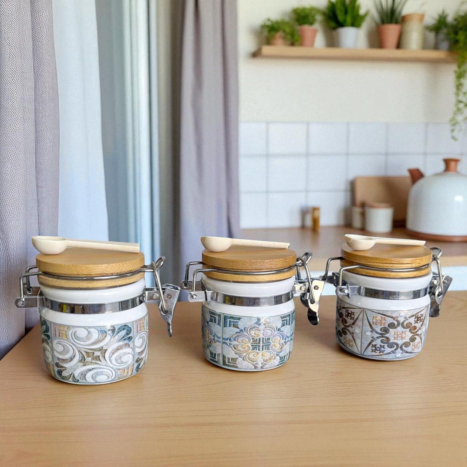 Vasetti ermetici bomboniere portaconfetti in porcellana lucida con tappo in legno naturale, con decorazioni a fantasia maiolica che ricordano gli affreschi pompeiani per un effetto vintage assicurato! I barattolini sono tutti con chiusura ermetica a gancio e arrivano provvisti di piccolo cucchiaino in legno.
