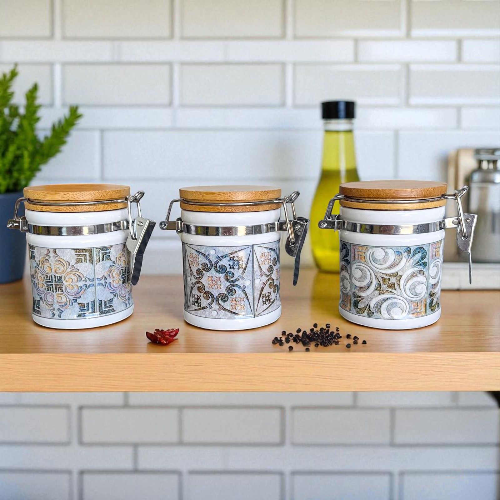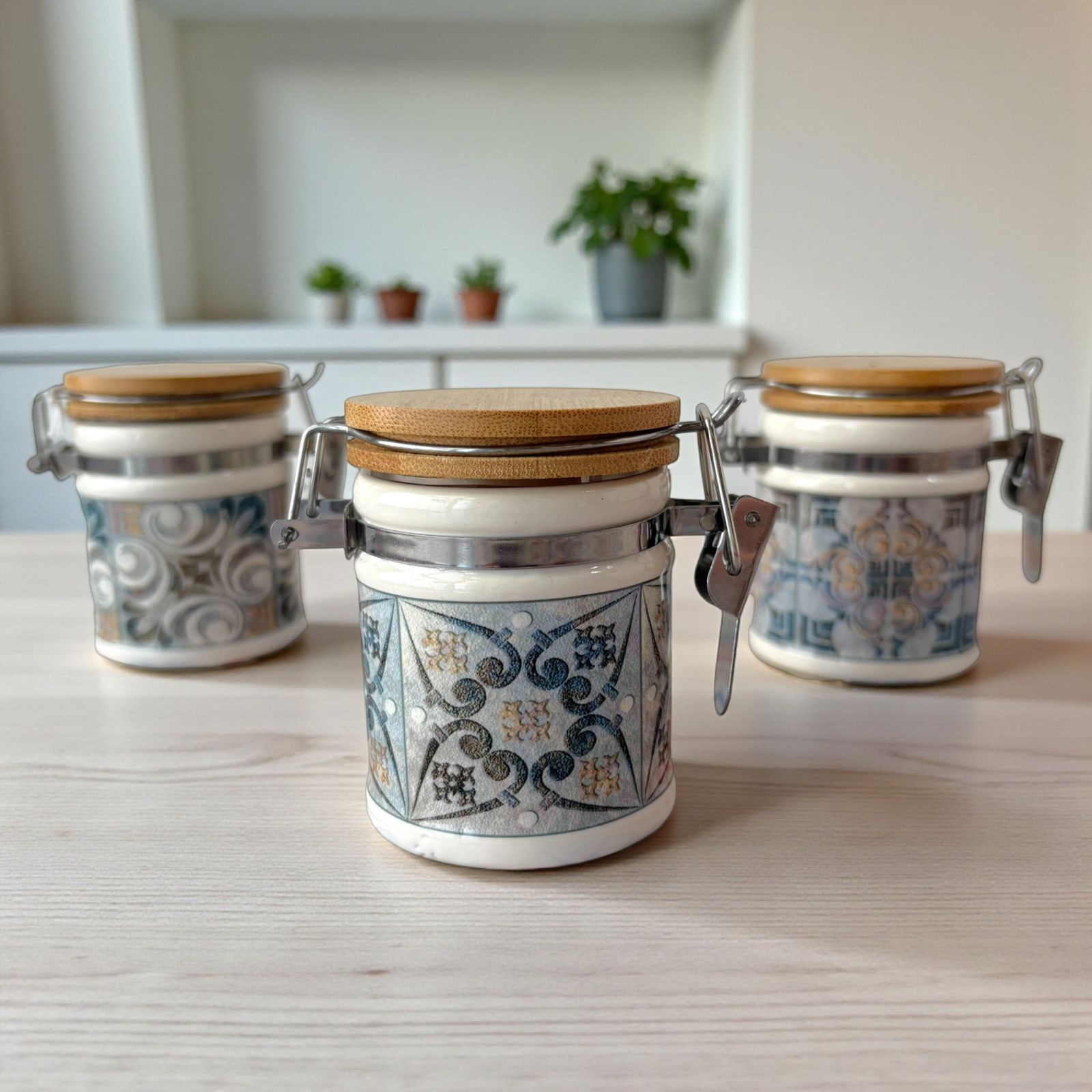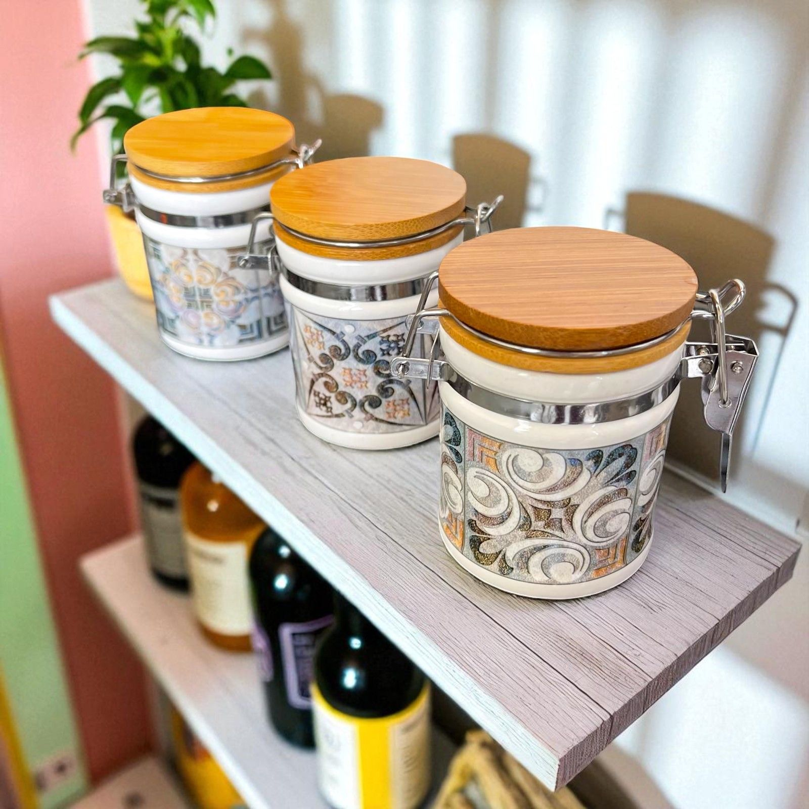 Acquista i nostri barattoli portaspezie in porcellana con chiusura ermetica a gancio in metallo e fantasia con decoro maiolica effetto vintage, dai toni leggermente scoloriti in tre assortimenti che differiscono tra loro per i motivi della decorazione.