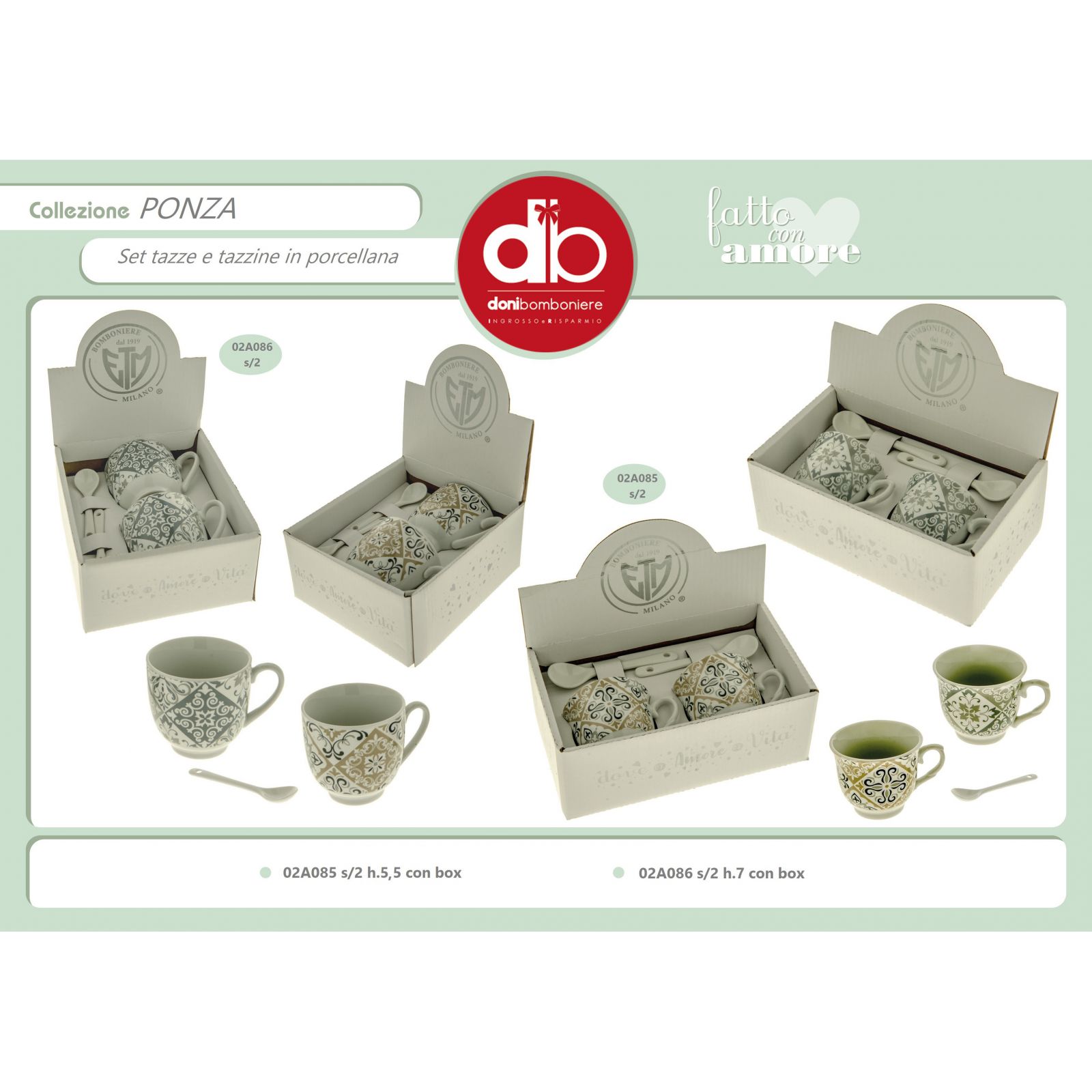 Bellissimo set tazze in porcellana con raffinata decorazione a tema maioliche in due assortimenti di colore. Le tazzine caffè sono complete di cucchiaino in ceramica.
