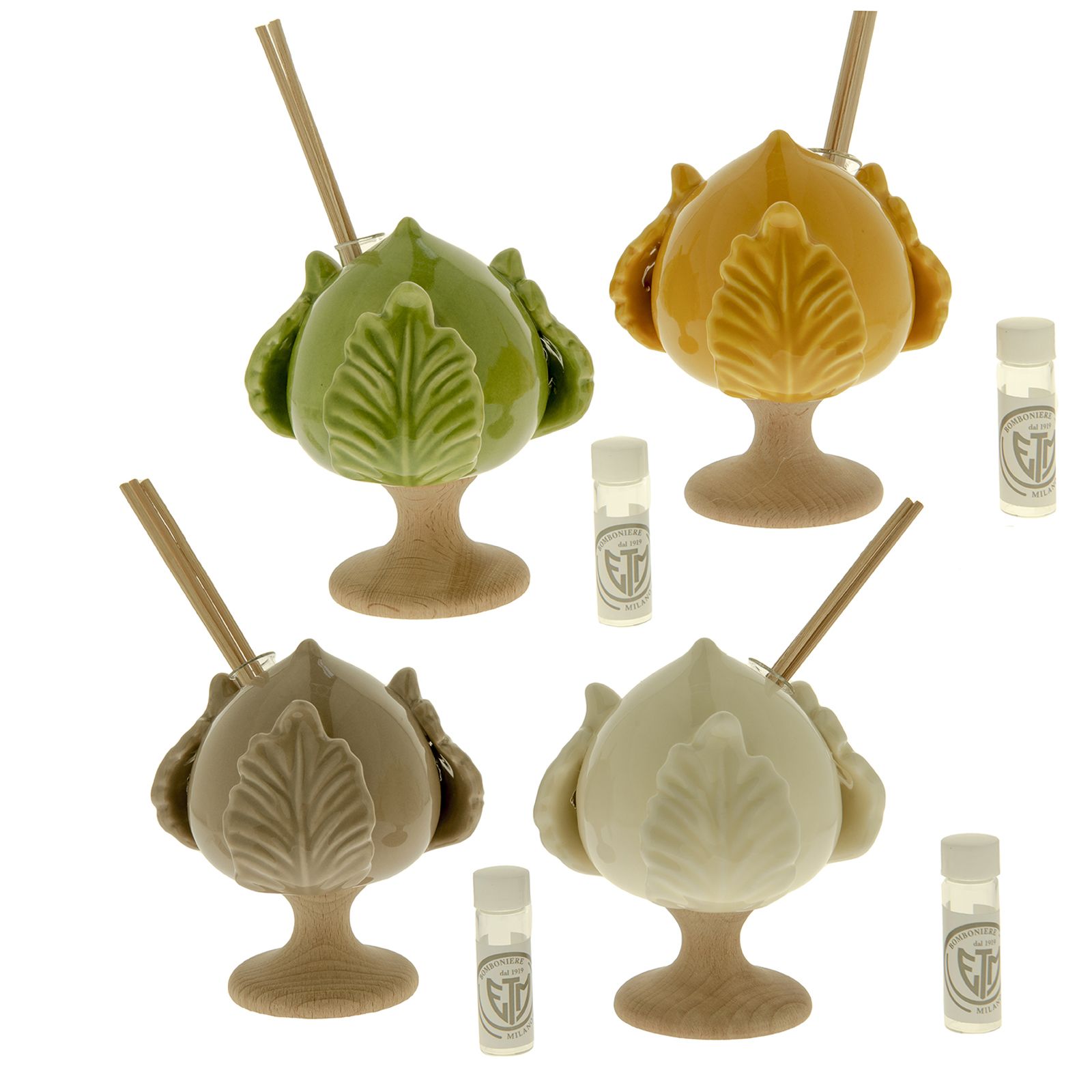 Eccoti il nostro pumo (o pomo) profumatore in porcellana purissima con base in legno naturale in 4 colori assortiti: bianco, tortora, arancio e verde.