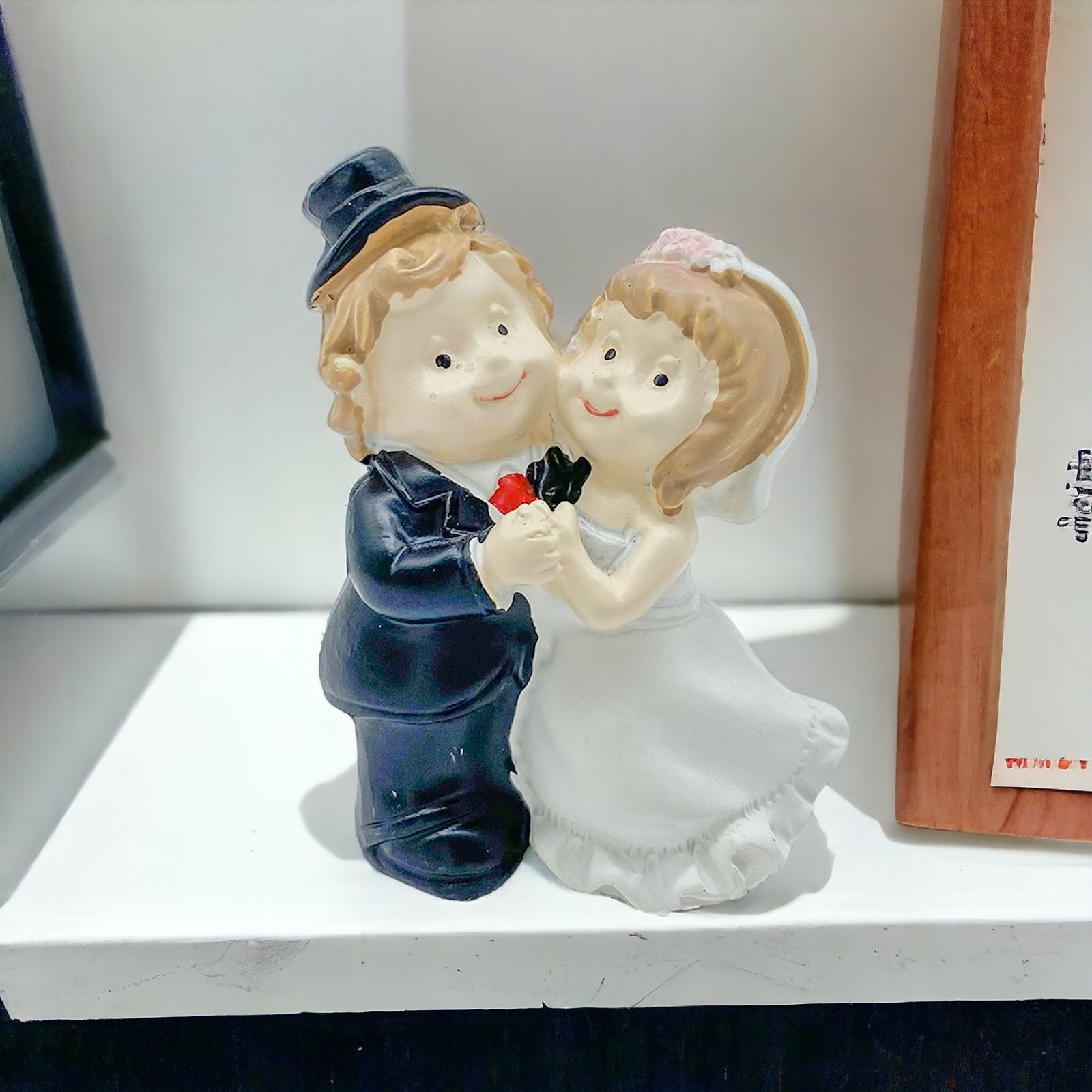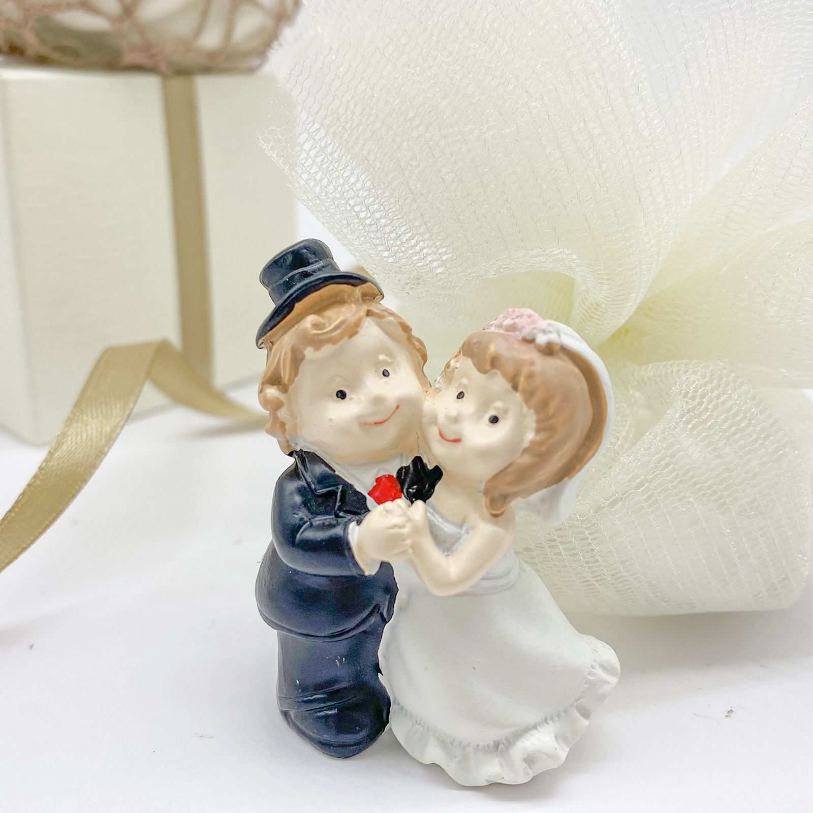 Acquista questi teneri sposini in resina, raffigurati abbracciati, con abito bianco e velo per la sposa e smoking con cappello a cilindro per lo sposo. Ideali come segnaposto matrimonio o da utilizzare per abbellire confettate nozze economiche!