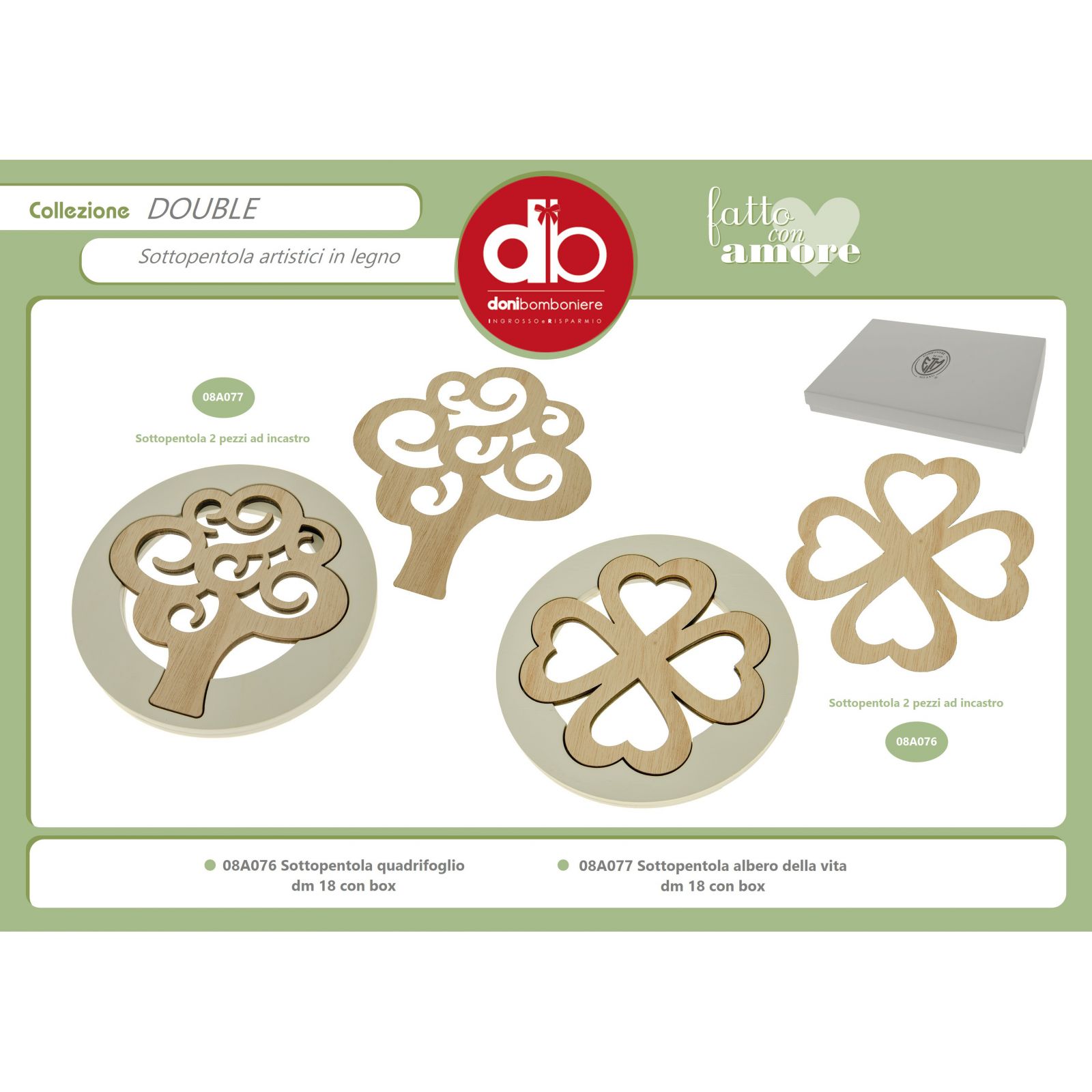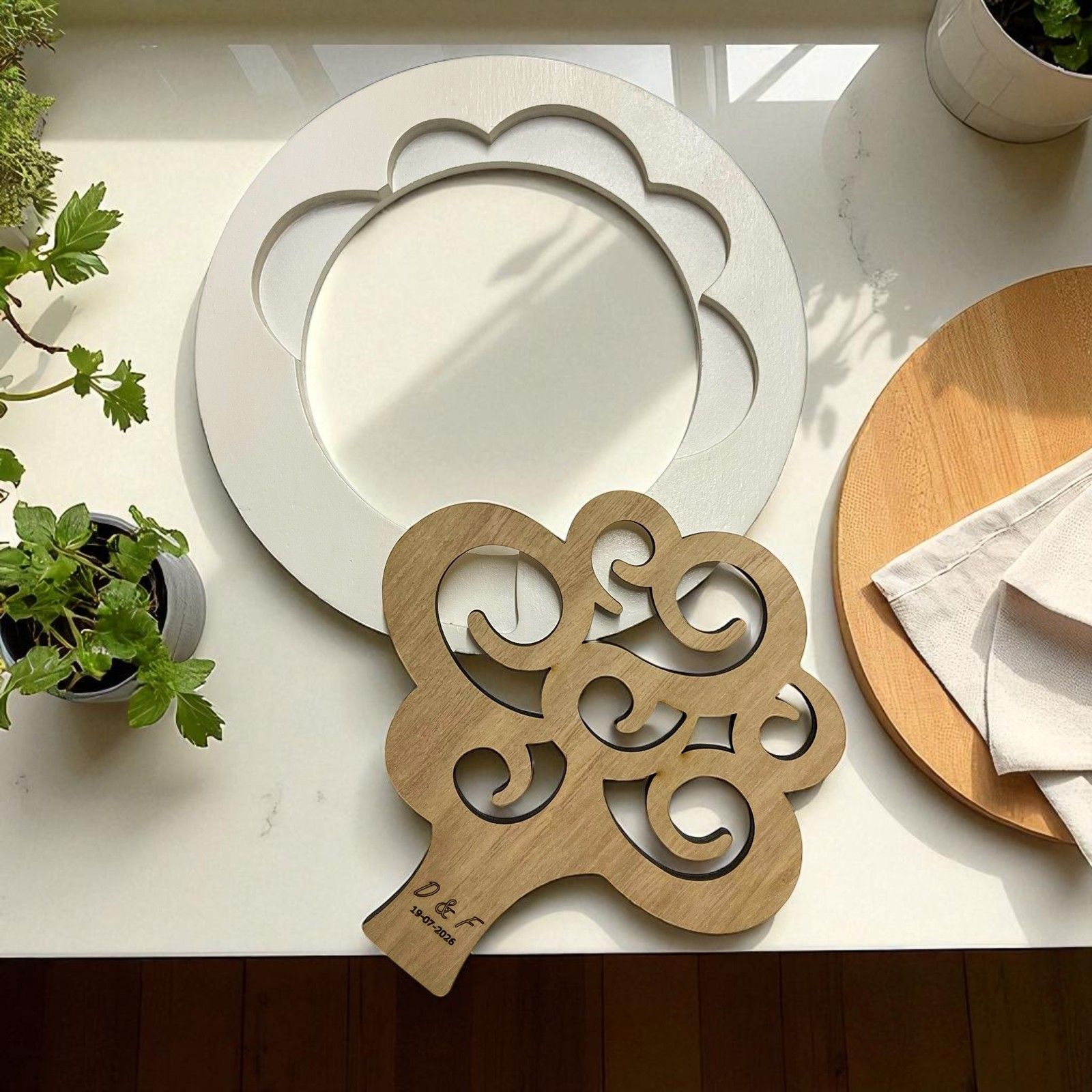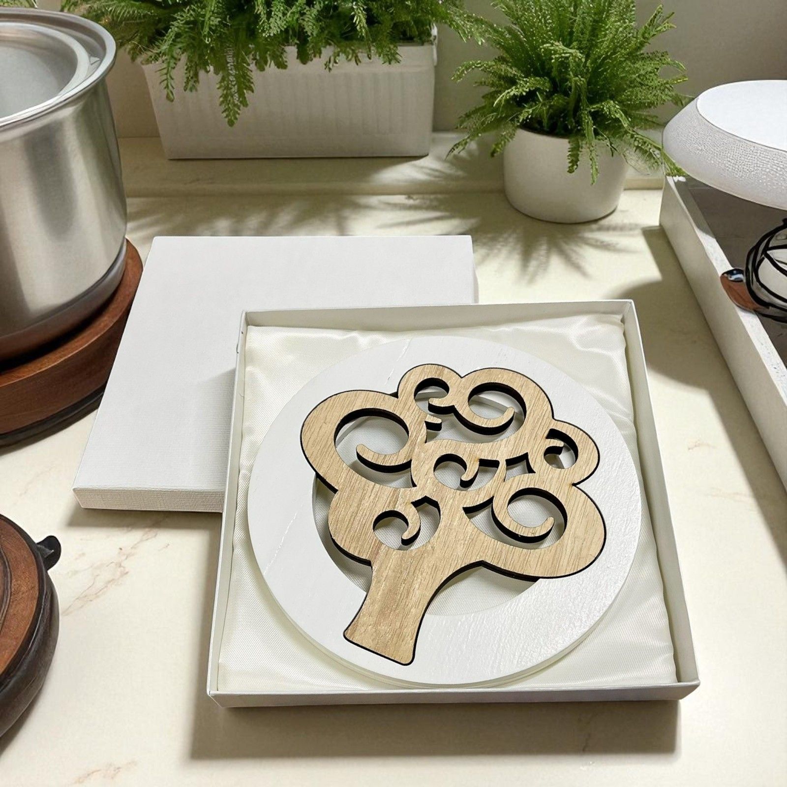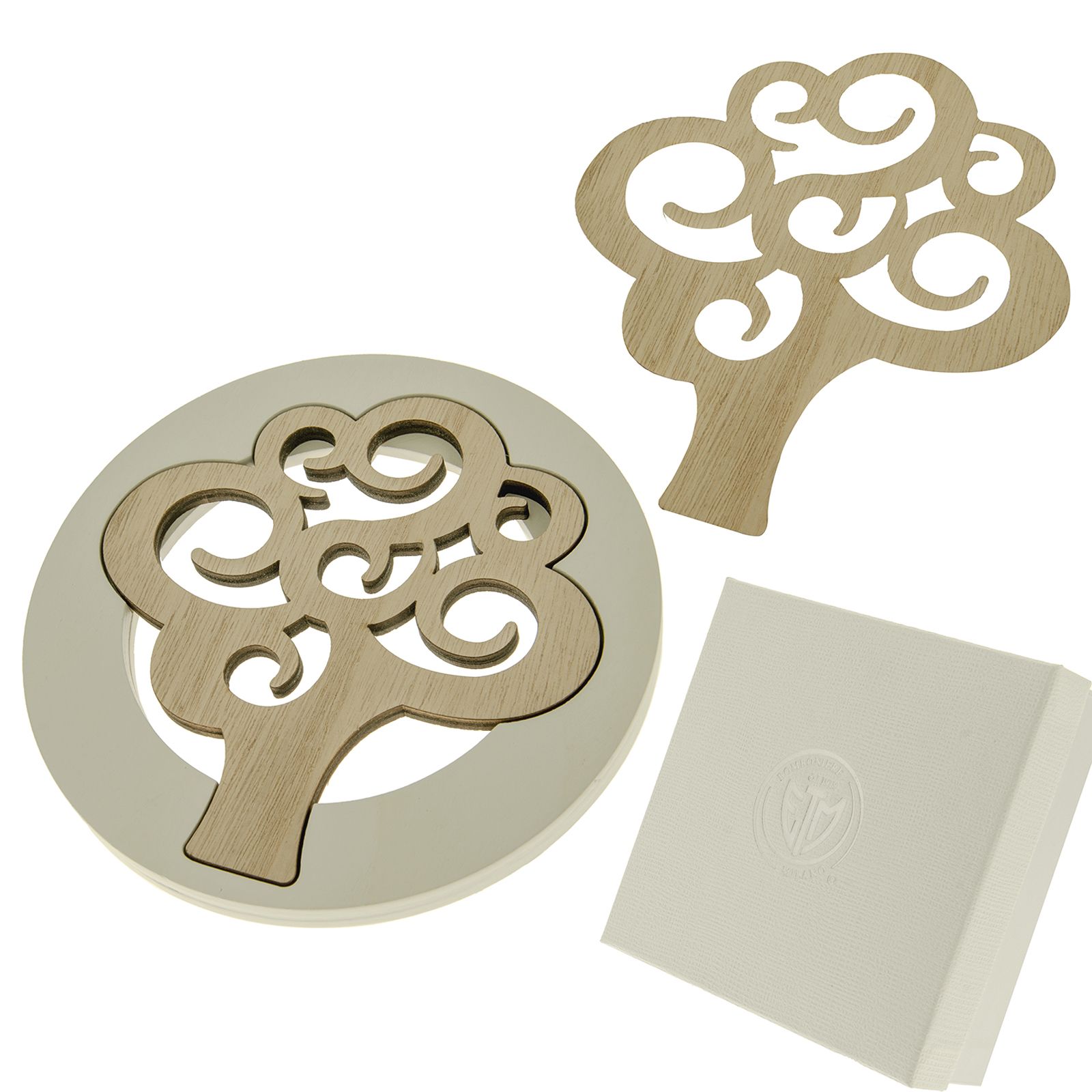 Sorprendi i tuoi invitati con queste raffinate ed eleganti bomboniere sottopentola realizzate in legno di alta qualità, nei delicati toni bianco e naturale. Il design sdoppiabile consente di separare le due parti del sottopentola, rendendolo un oggetto pratico e versatile. Il cuore di questo oggetto è l'albero della vita, simbolo di crescita, forza e amore, delicatamente inciso e posizionato al centro tramite un originale sistema ad incastro.