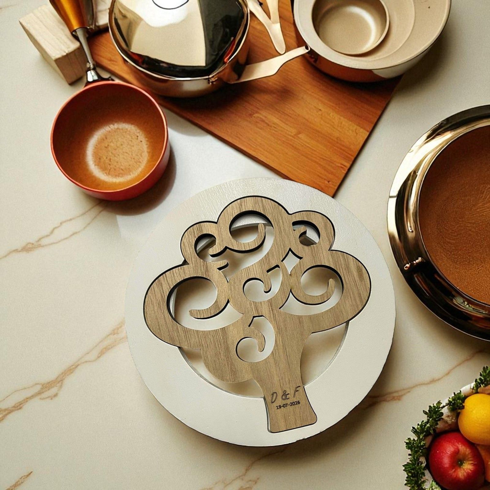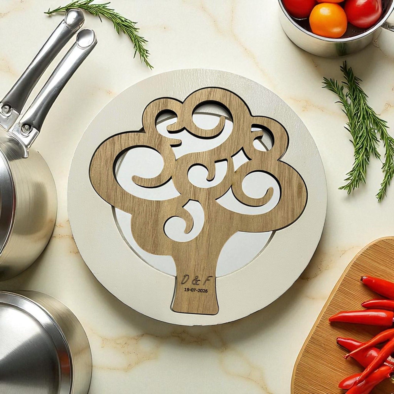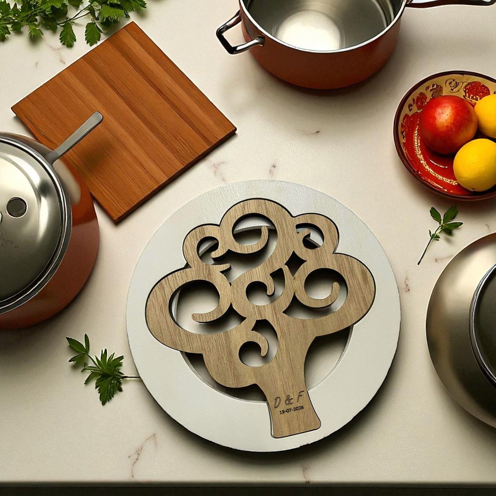 Per rendere il tuo regalo ancora più personale, puoi scegliere di incidere direttamente sul sottopentola le iniziali degli sposi e la data del tuo evento. Un tocco di eleganza e unicità che renderà ogni bomboniera un ricordo speciale e personalizzato, pensato esclusivamente per i tuoi ospiti.