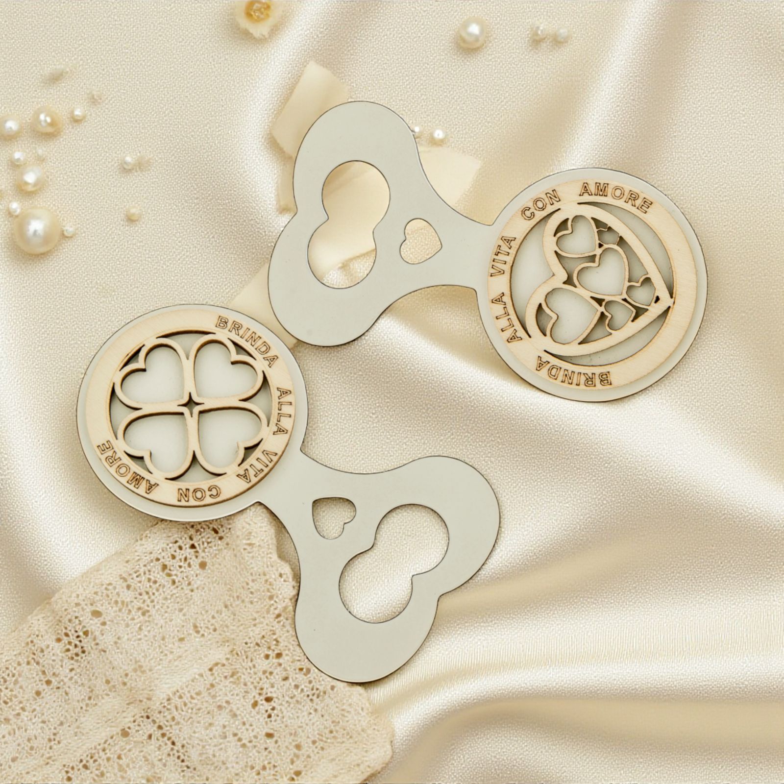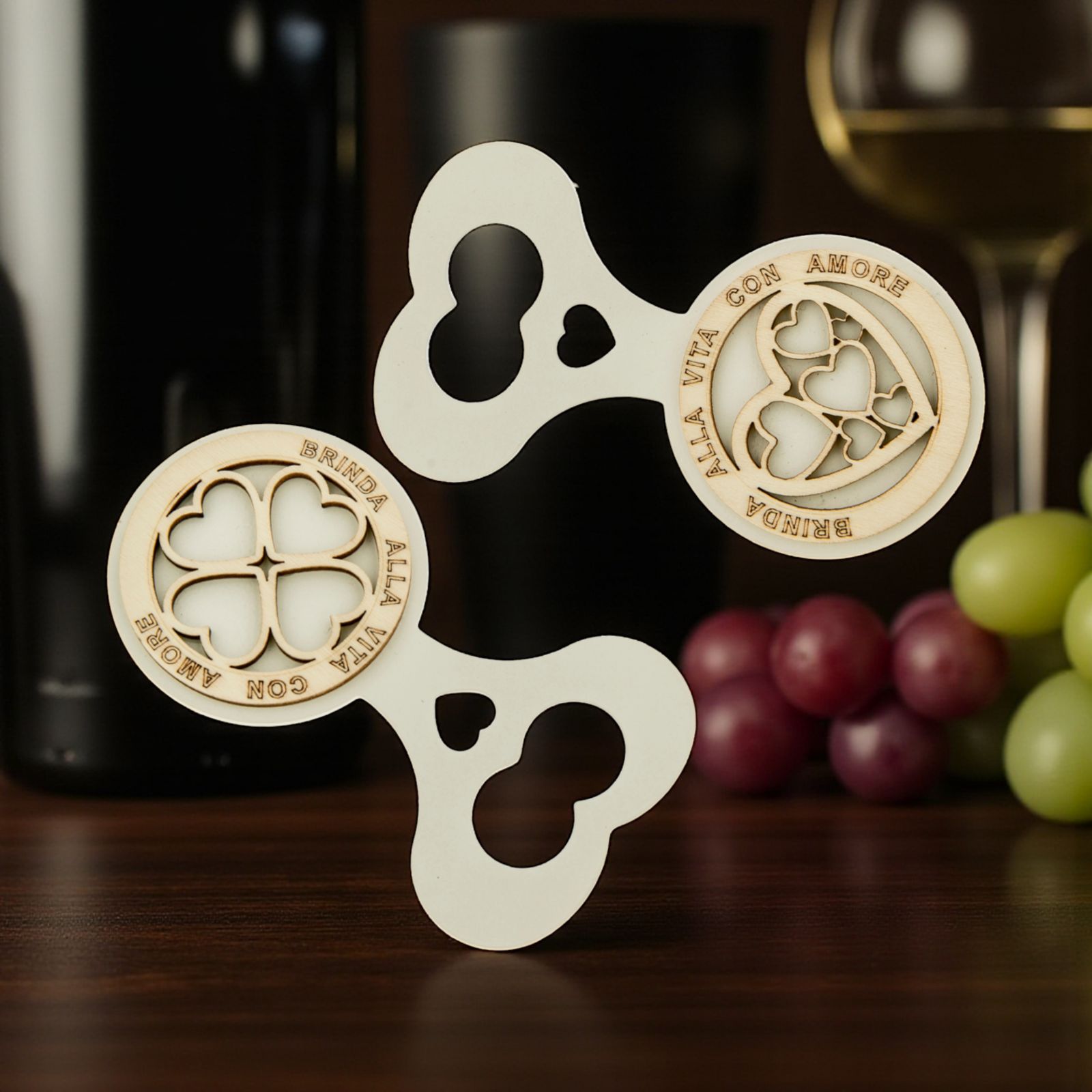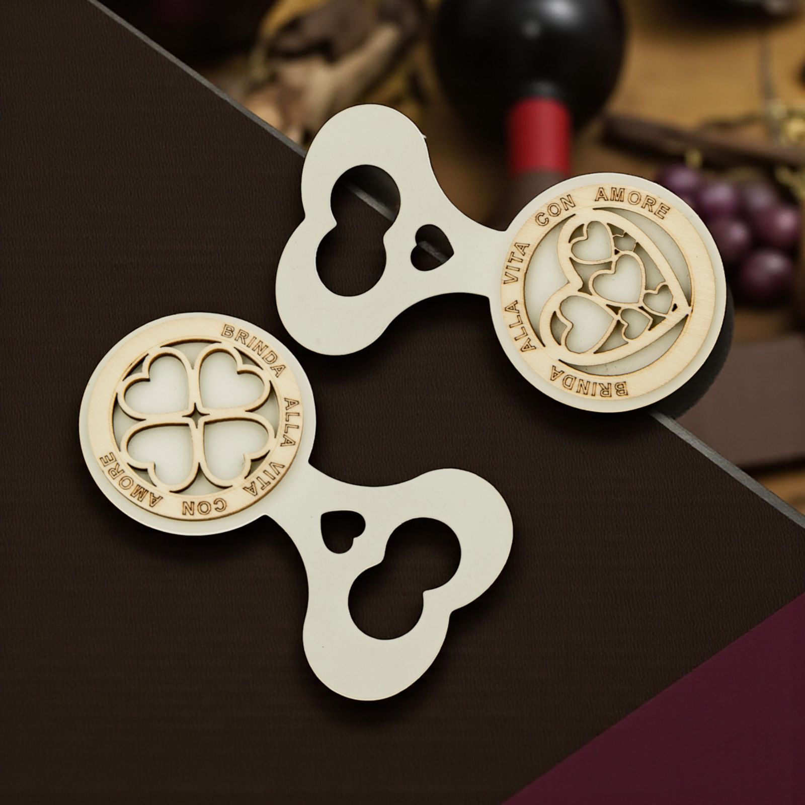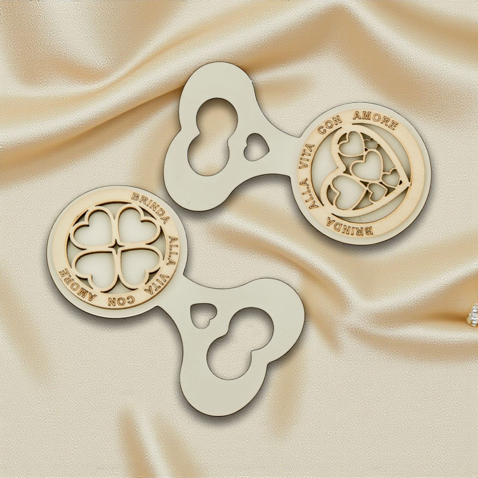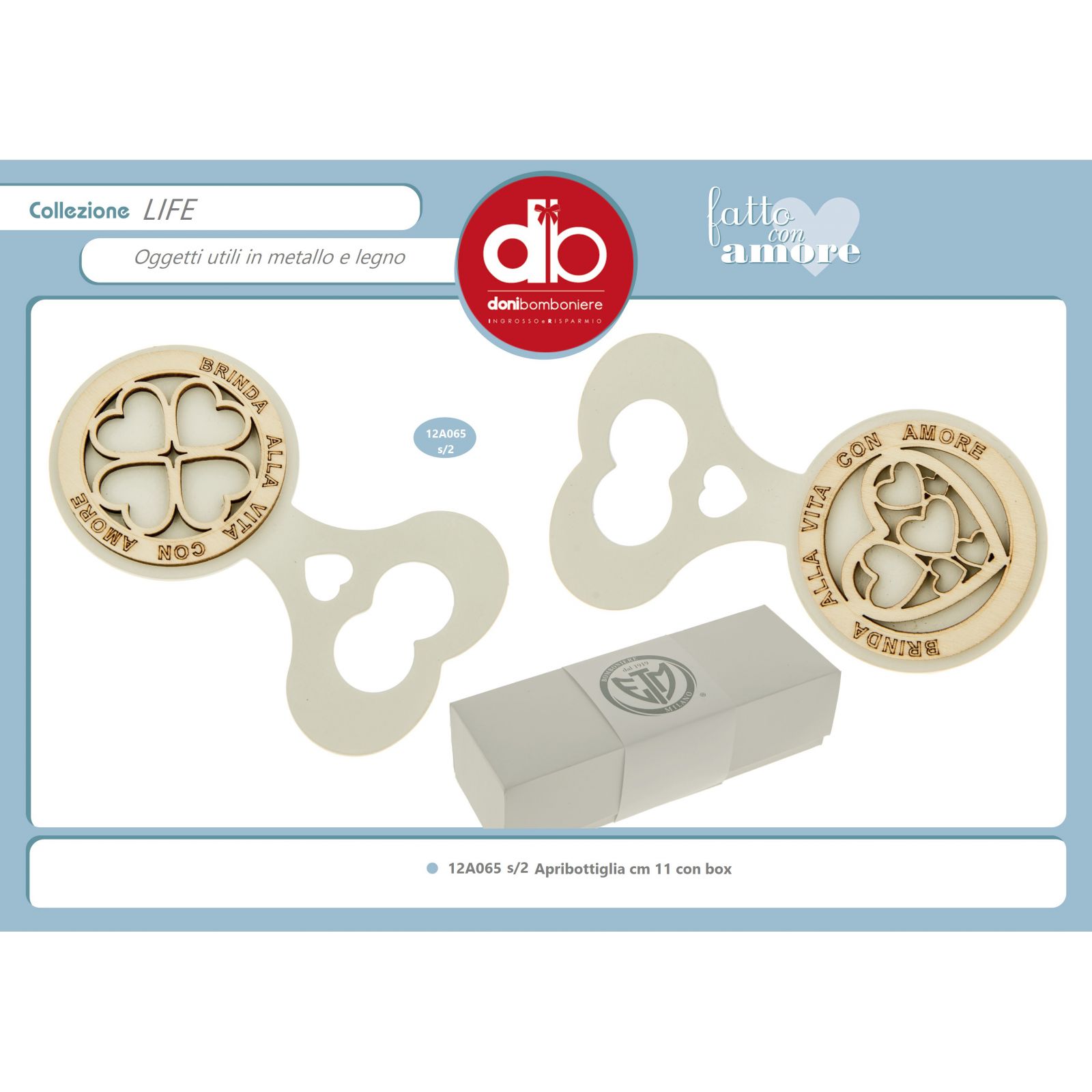 Scegli questi graziosi apribottiglie in metallo con impugnatura che presenta un inserto in legno naturale assortito in due varianti: con quadrifoglio o con cuore. Di colore bianco e dall'impugnatura ergonomica, questi levatappi bomboniere saranno l'ideale per lasciare un ricordo della tua cerimonia!