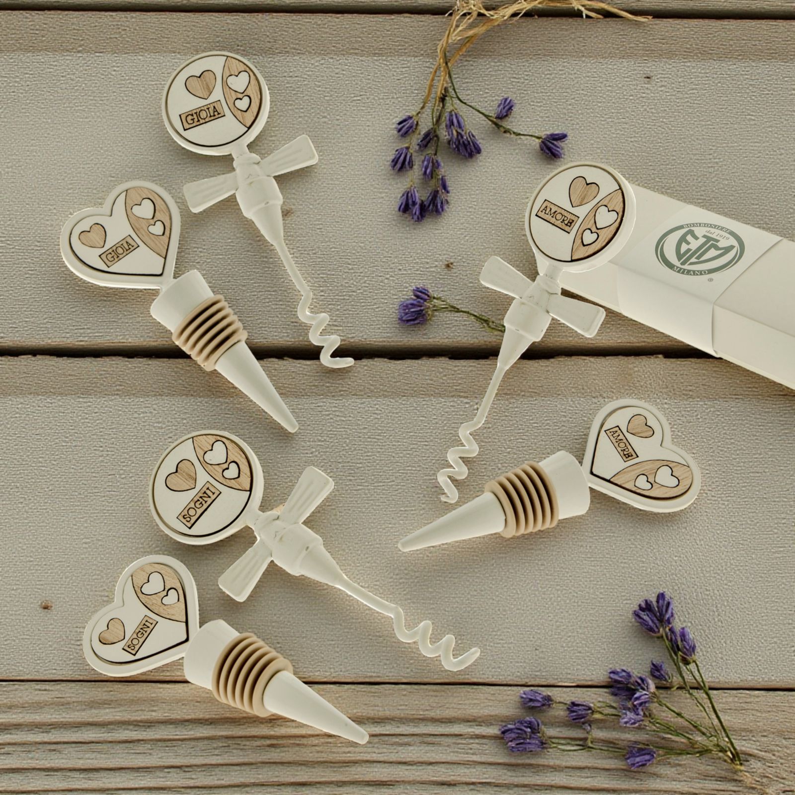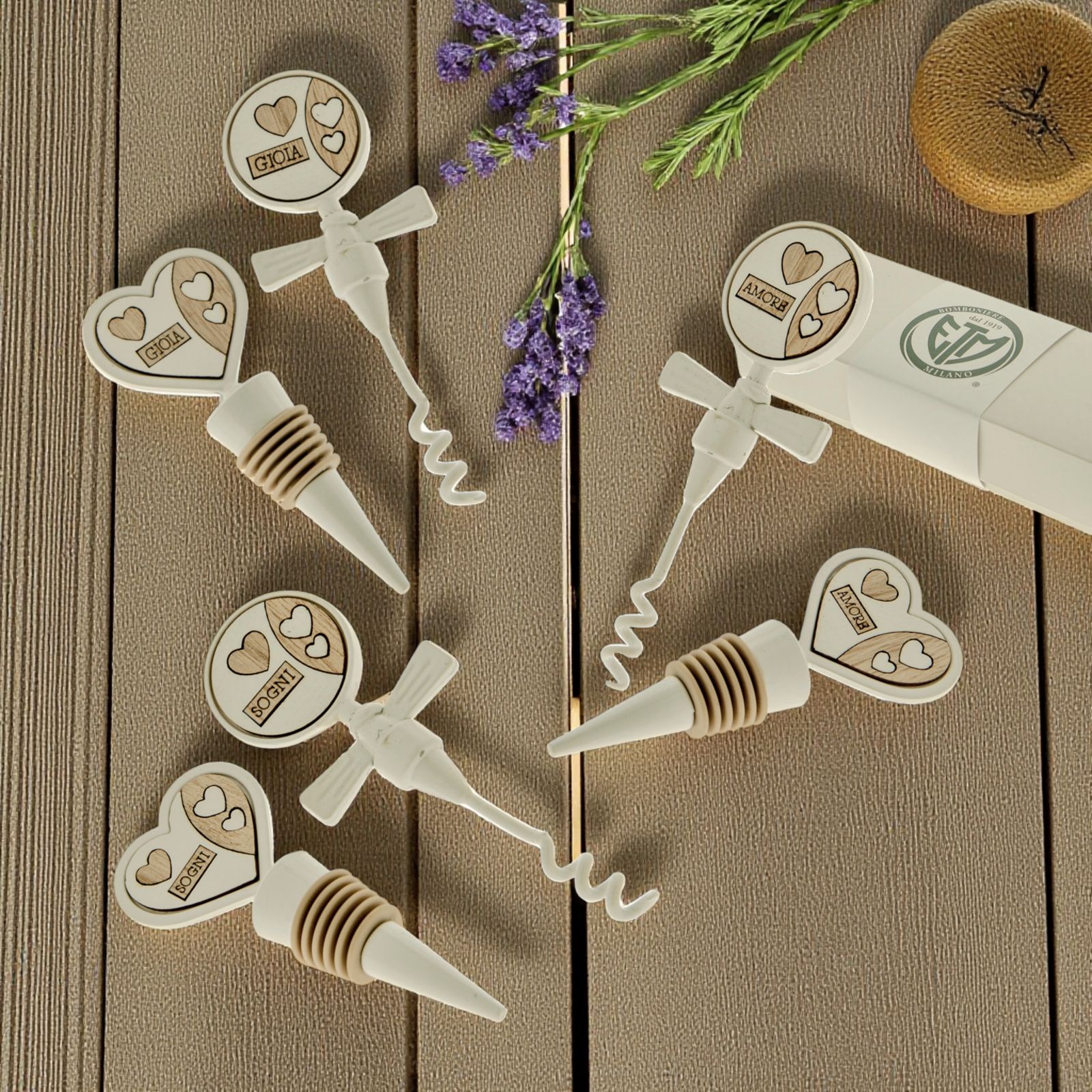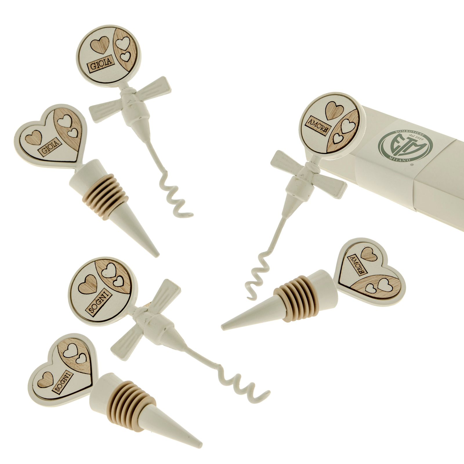 Acquista i nostri set da vino con cavatappi spiralato e tappo ermetico con guarnizione in gomma, entrambi in metallo bianco, con impugnatura a forma di cuore e circolare con inserti in legno bianco e naturale, assortiti in tre varianti, con i termini: "Gioia", "Amore" e "Sogni".