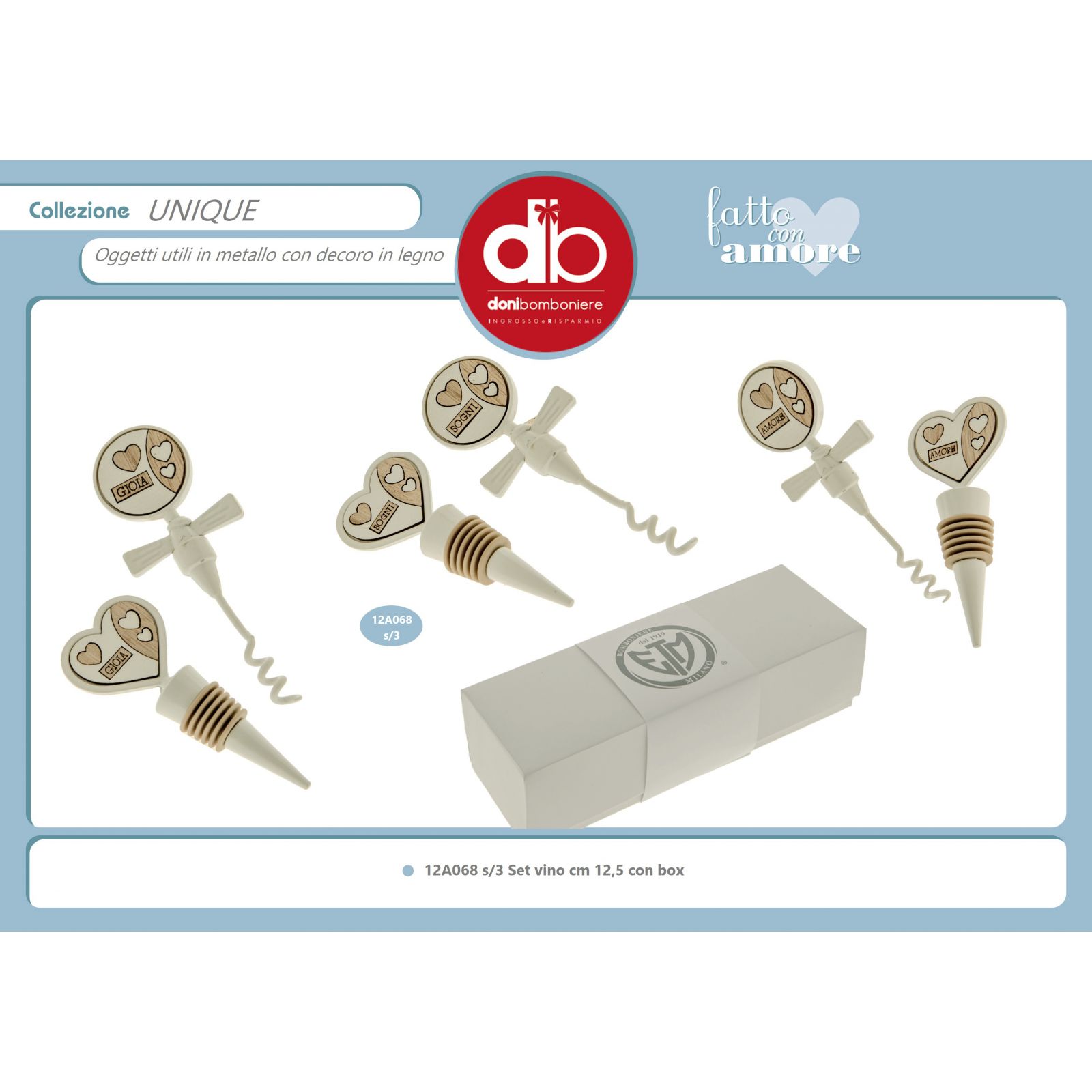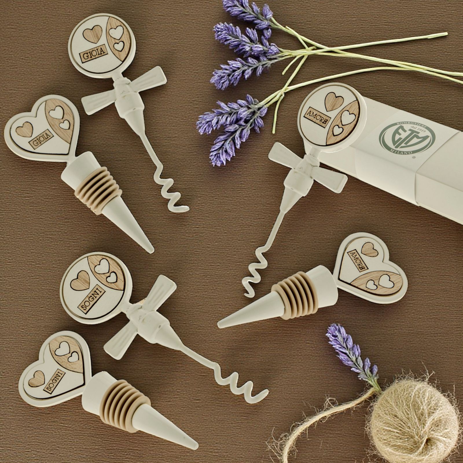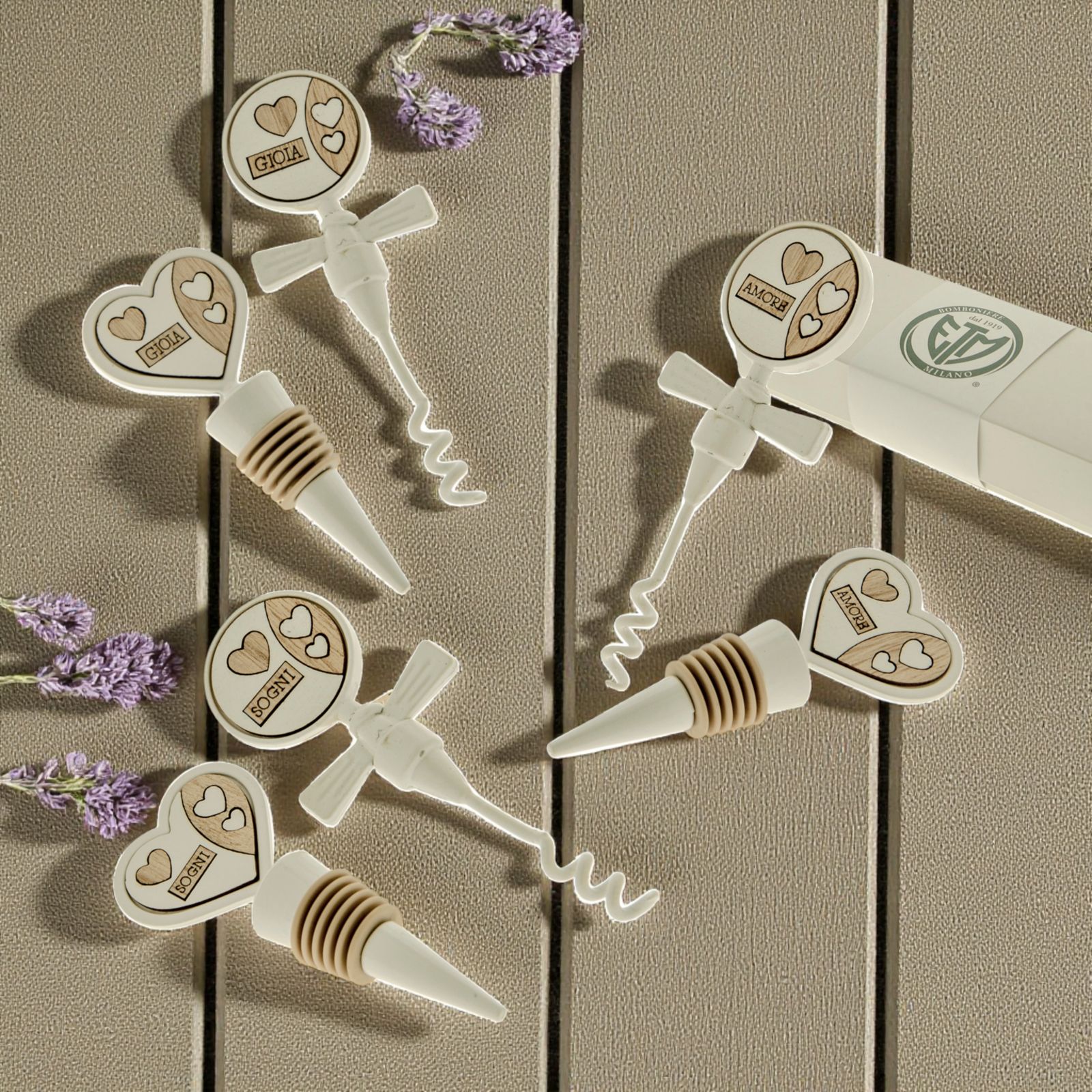 Acquista i nostri set da vino con cavatappi spiralato e tappo ermetico con guarnizione in gomma, entrambi in metallo bianco, con impugnatura a forma di cuore e circolare con inserti in legno bianco e naturale, assortiti in tre varianti, con i termini: "Gioia", "Amore" e "Sogni".
