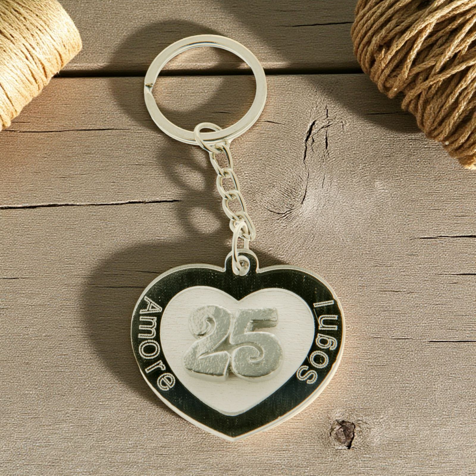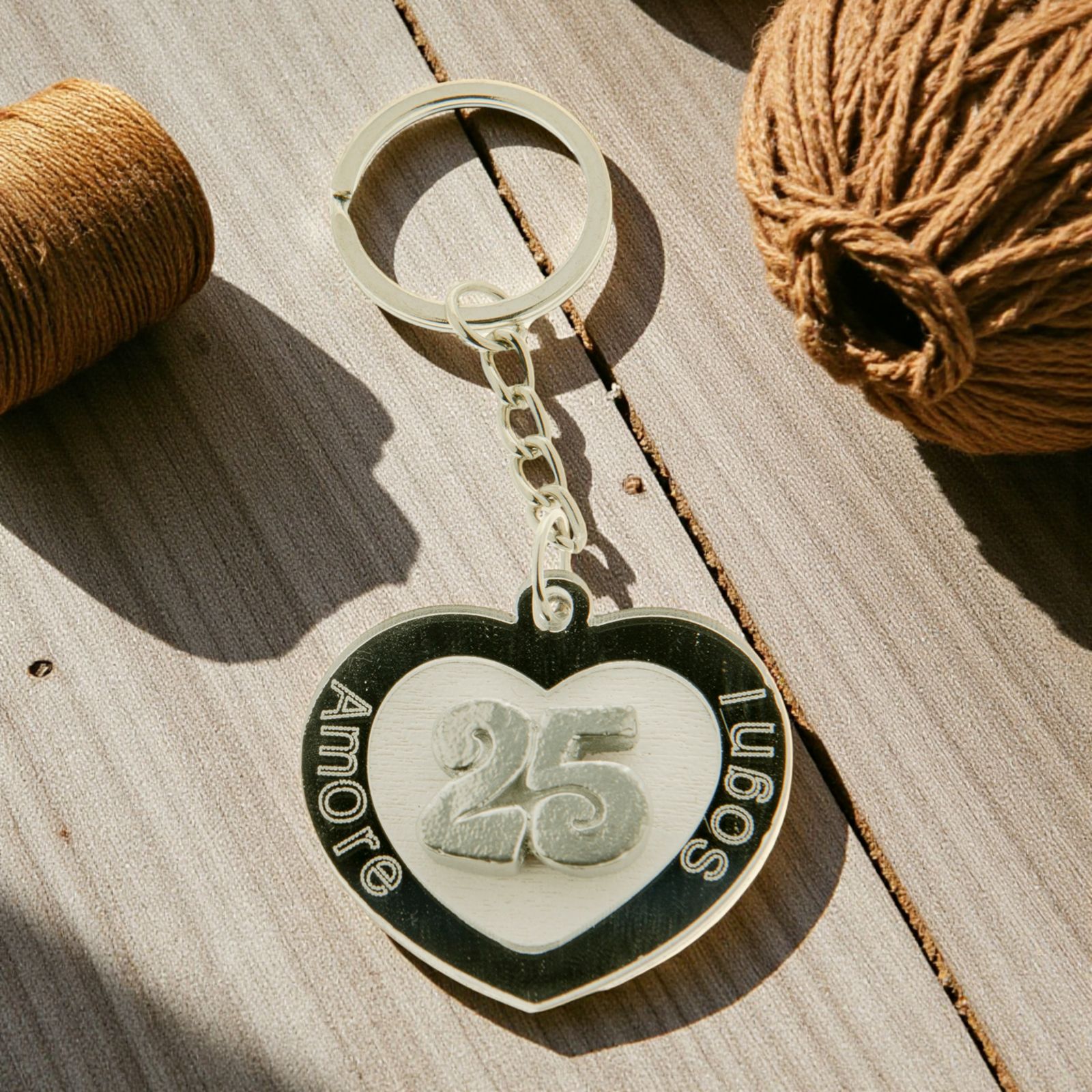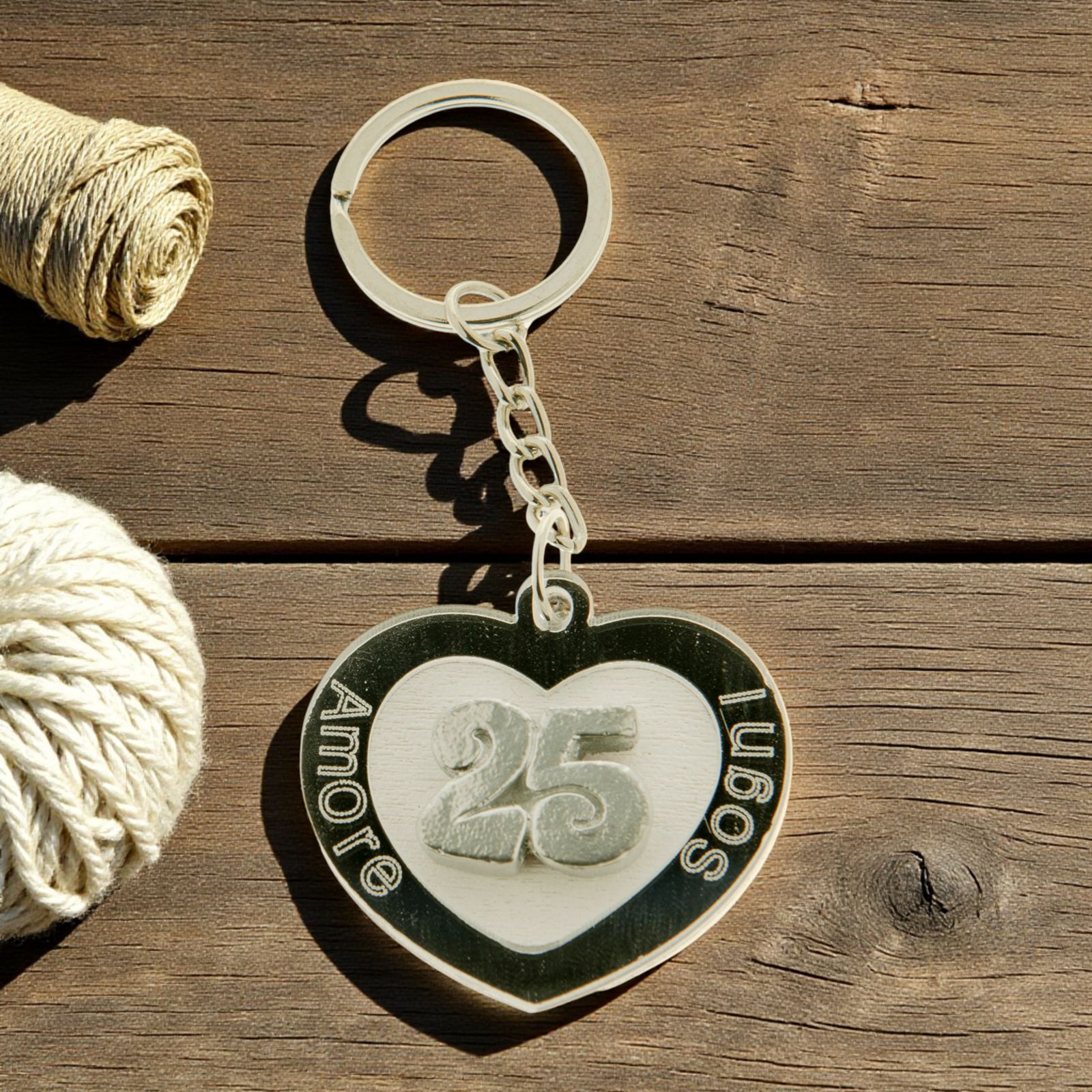Acquista questi graziosi portachiavi in plexiglass a forma di cuore con dettagli argento, che riportano i termini: "Amore" e "Sogni" e il numero 25 al centro. Provvisti di catenina e anello in metallo.