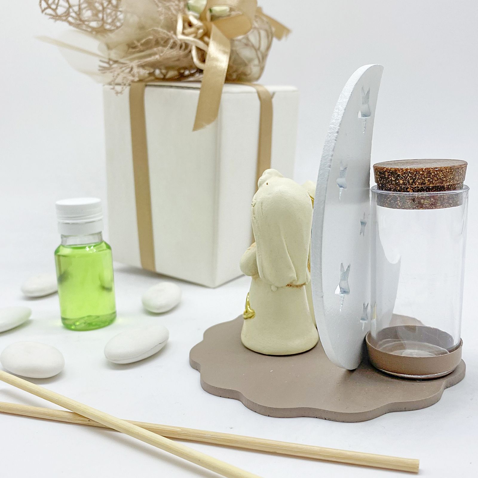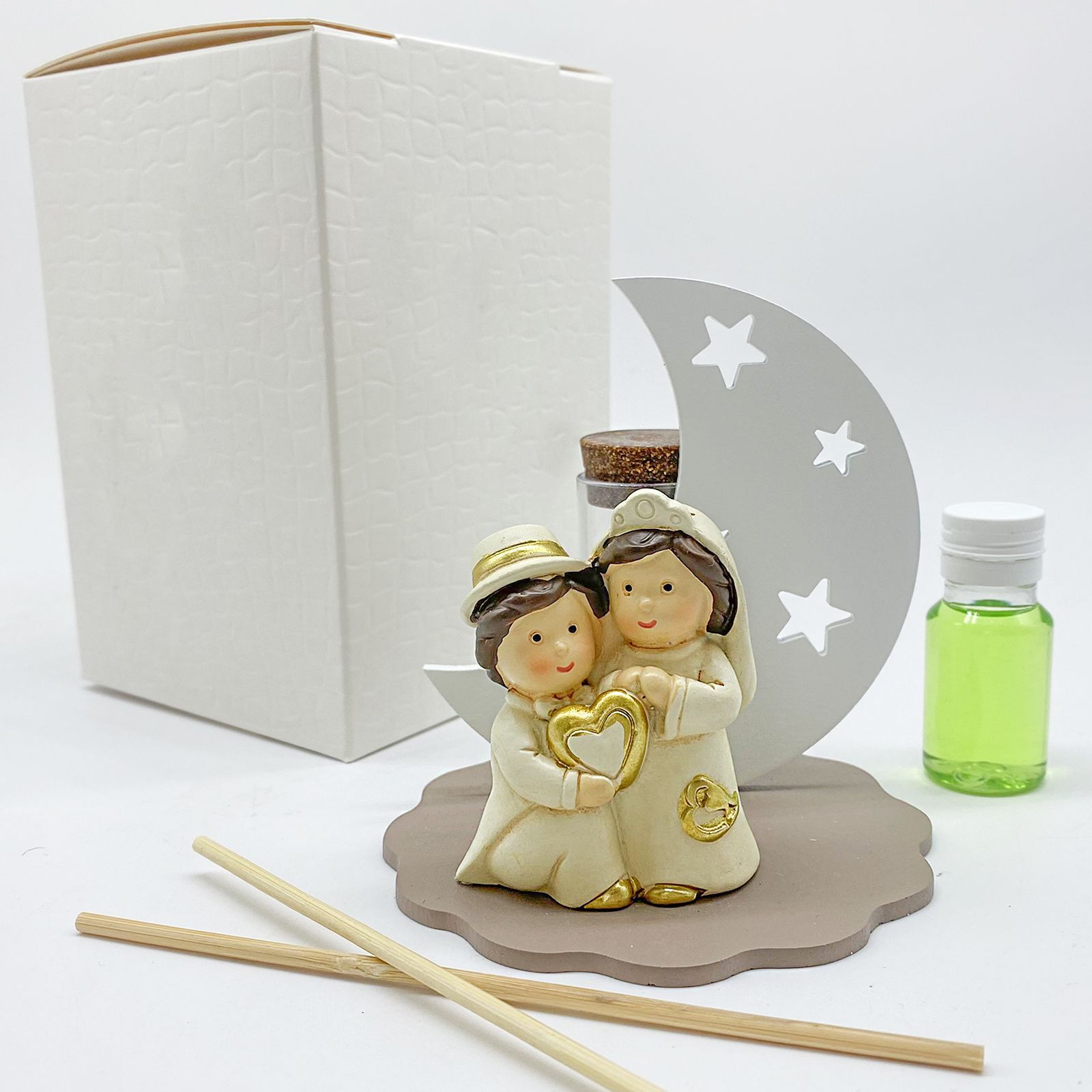Scegli questi adorabili profumatori per ambienti con base tortora e falce di luna bianca in legno davanti alla quale sono raffigurati due teneri sposini abbracciati con un cuore dorato tra le mani. Dietro la mezzaluna, invece troverai la provetta con tappo in sughero in cui inserire bacchette ed essenza profumata.