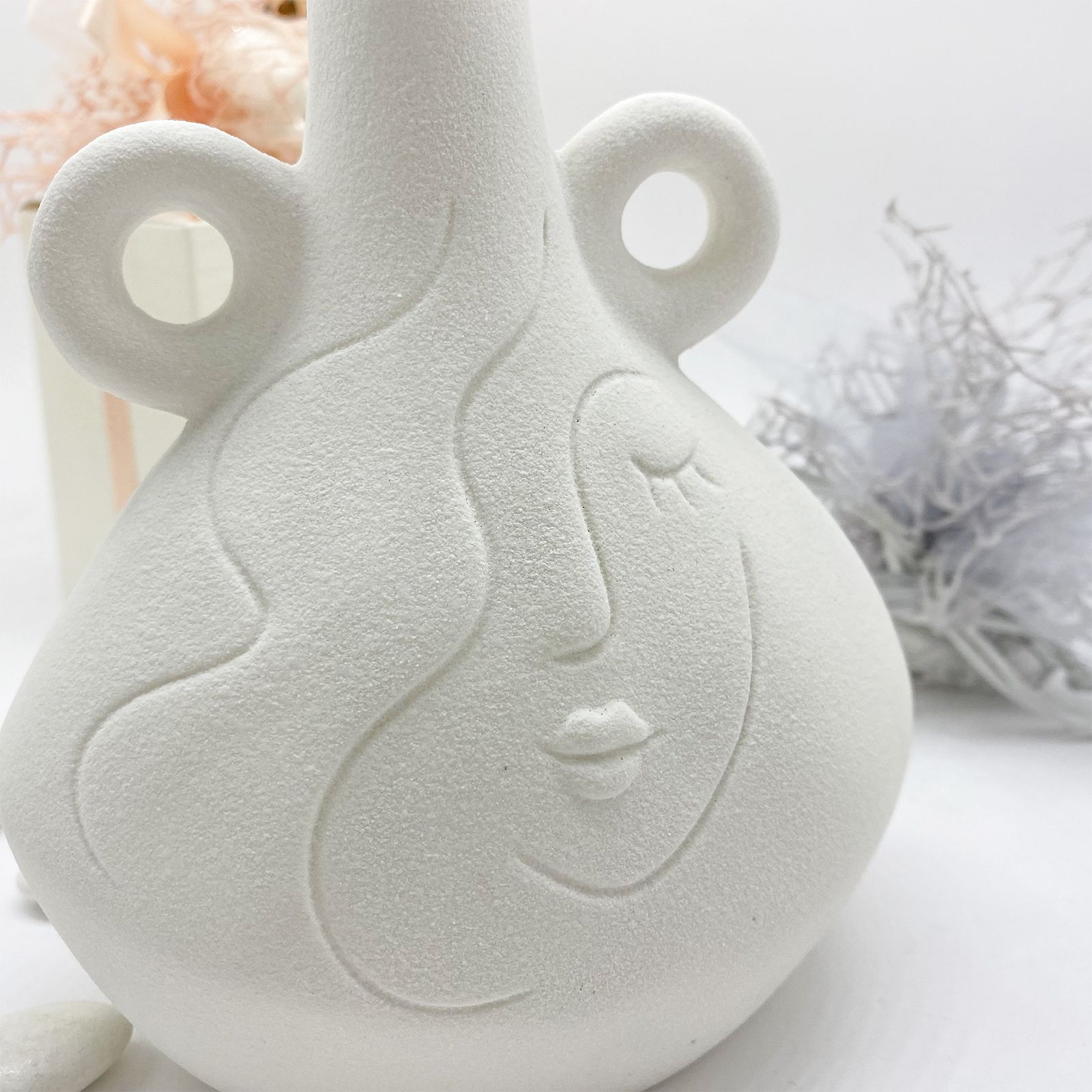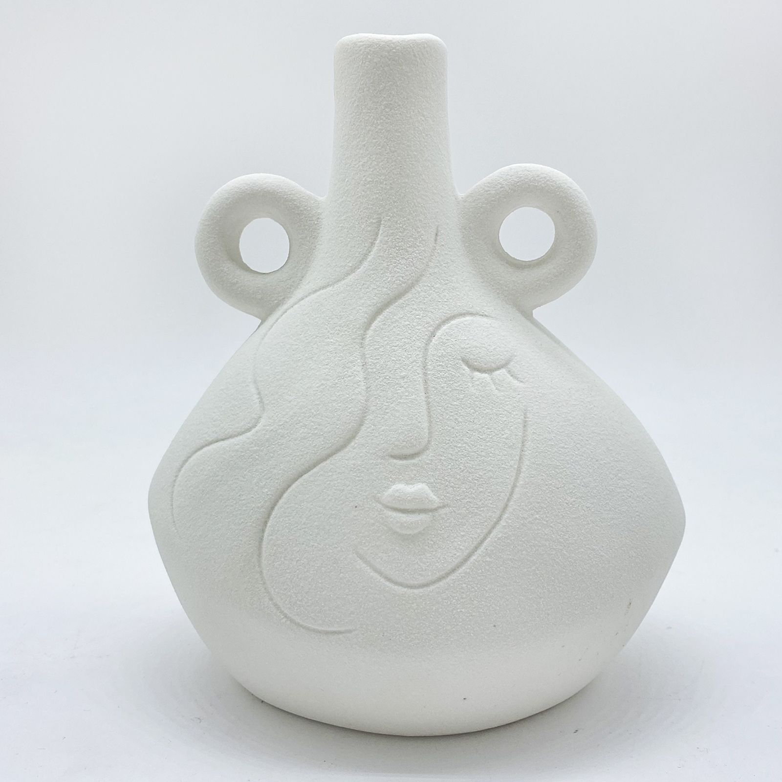 Eleganti anfore in porcellana bianca effetto biscuit, con incisione frontale stilizzata di un volto di donna, delicato e ricercato.