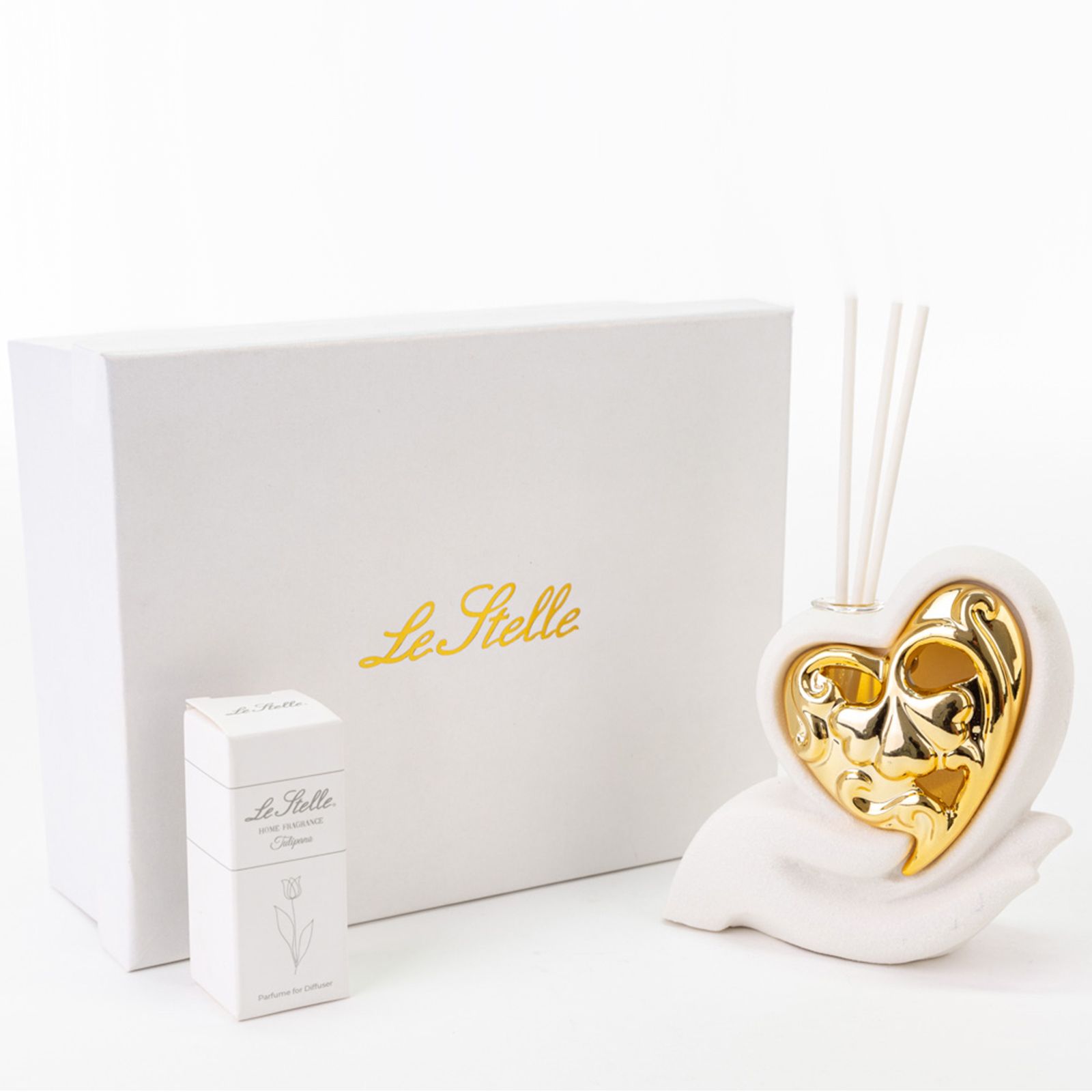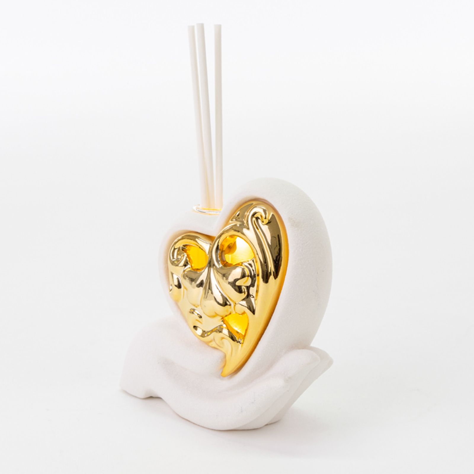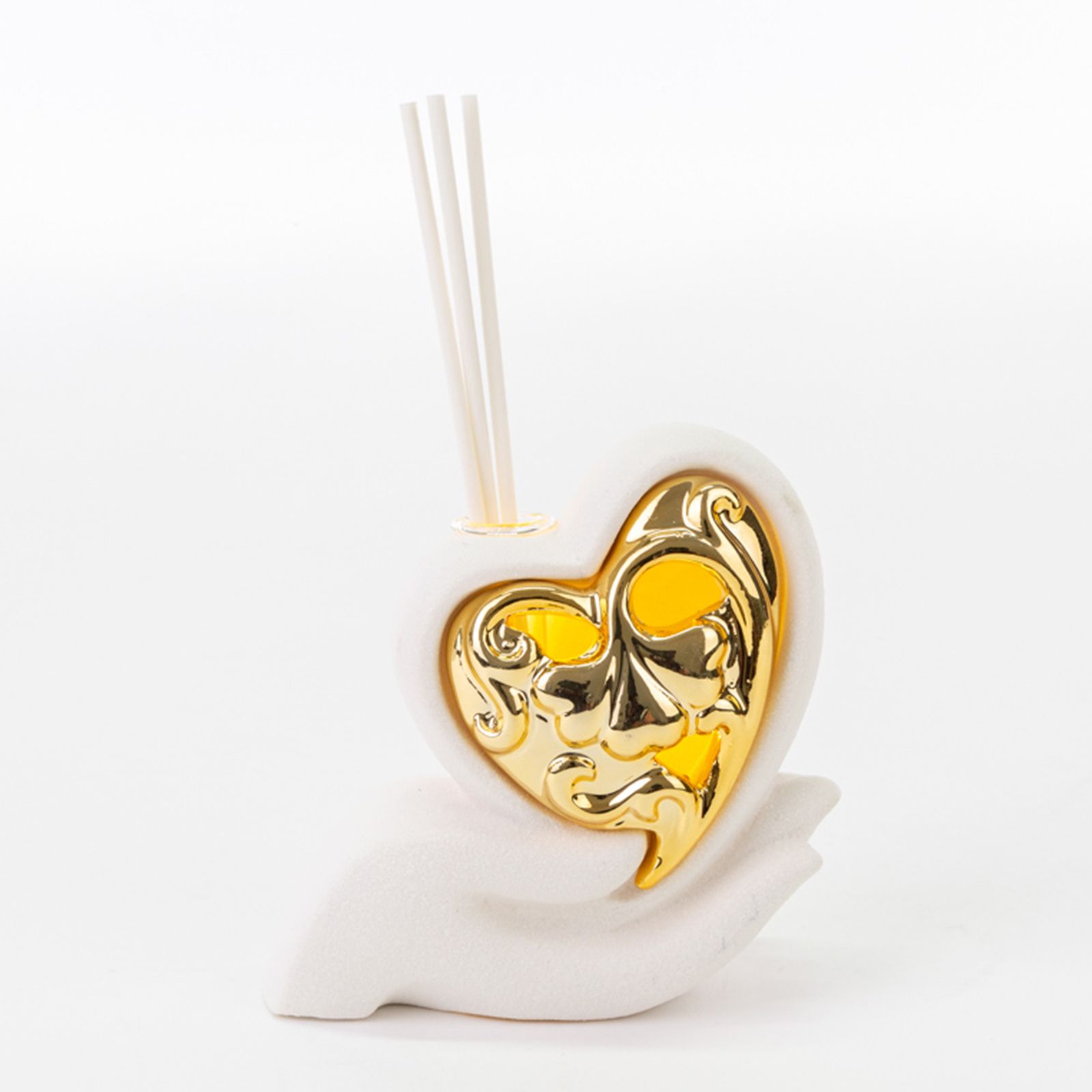 Disponibili per te questi profumatori per ambienti in porcellana bianca raffiguranti una mano che stringe un cuore, con interno color oro lucido. Il diffusore di aromi, inoltre, è anche una gradevole luce led che illuminerà delicatamente gli ambienti mentre diffonde la fragranza.