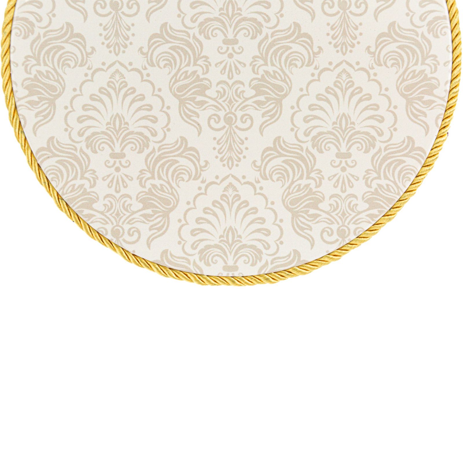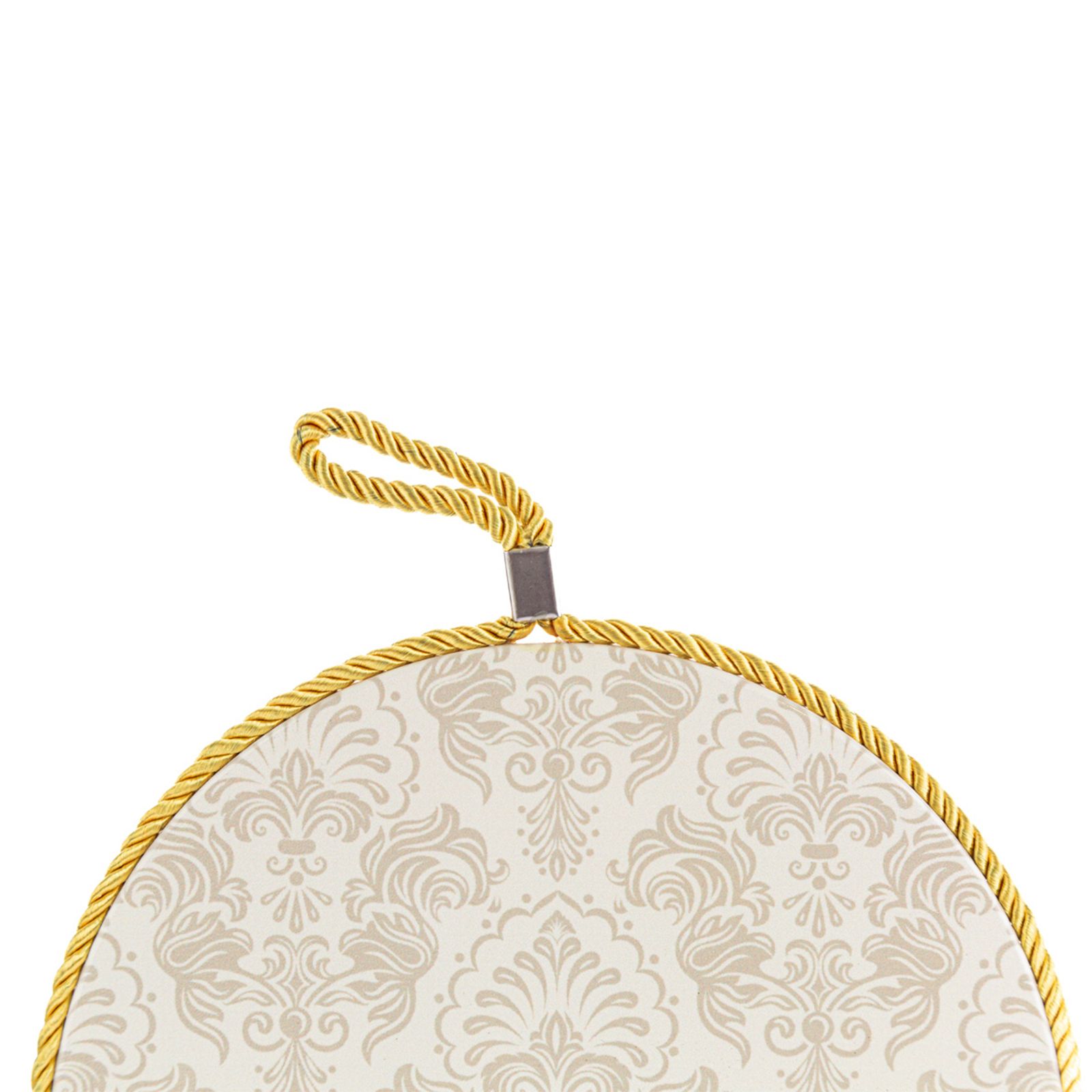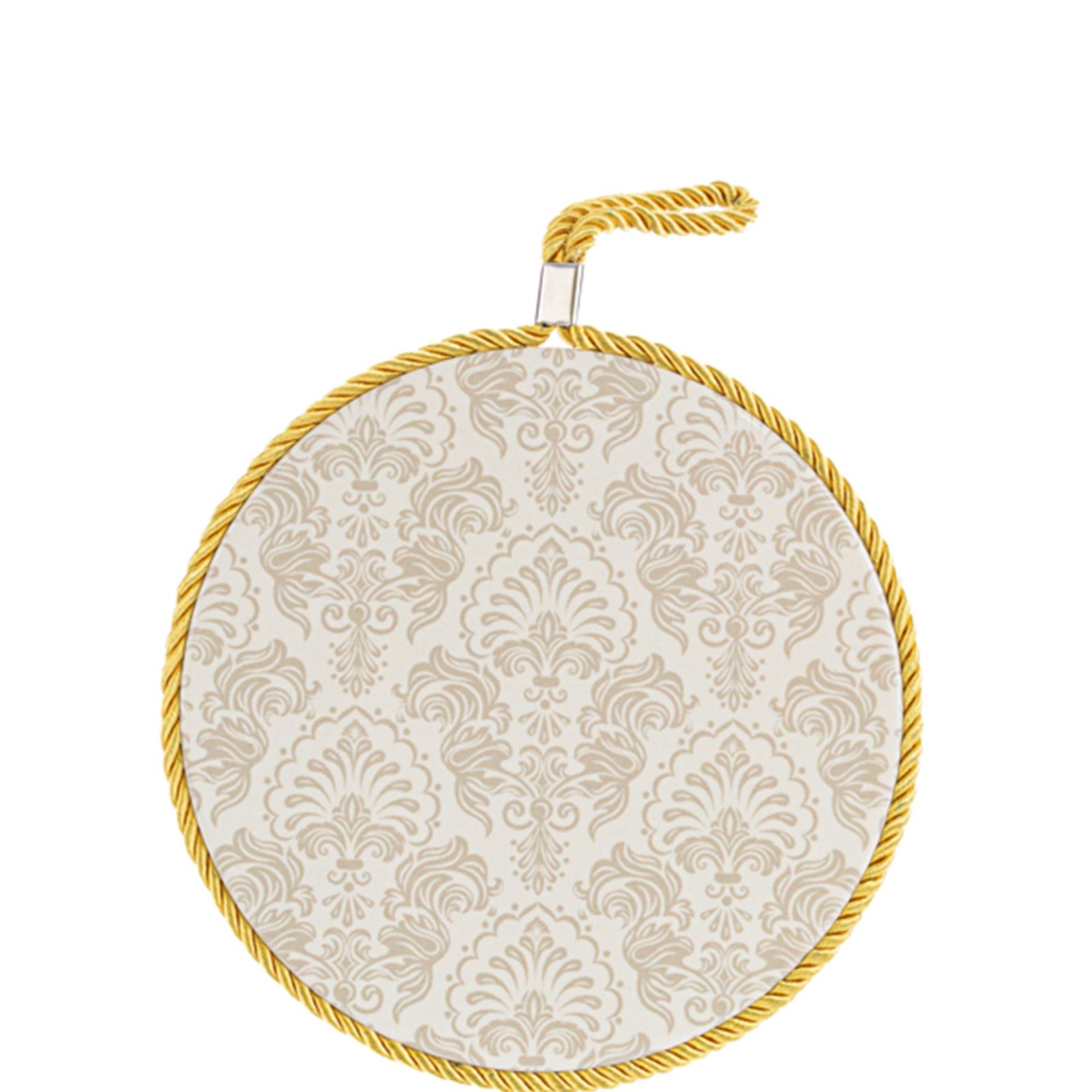 Disponibili per te i nostri sottopentola in ceramica con appendino in corda dorato che percorre tutto il bordo circolare del poggia pentole, decorati con un motivo barocco nei toni del bianco e tortora.