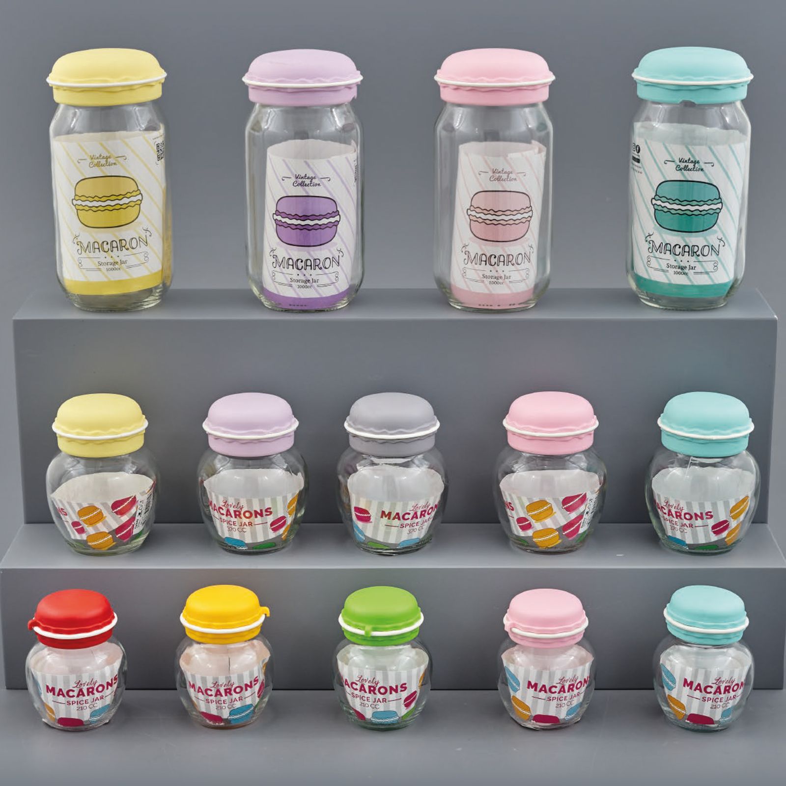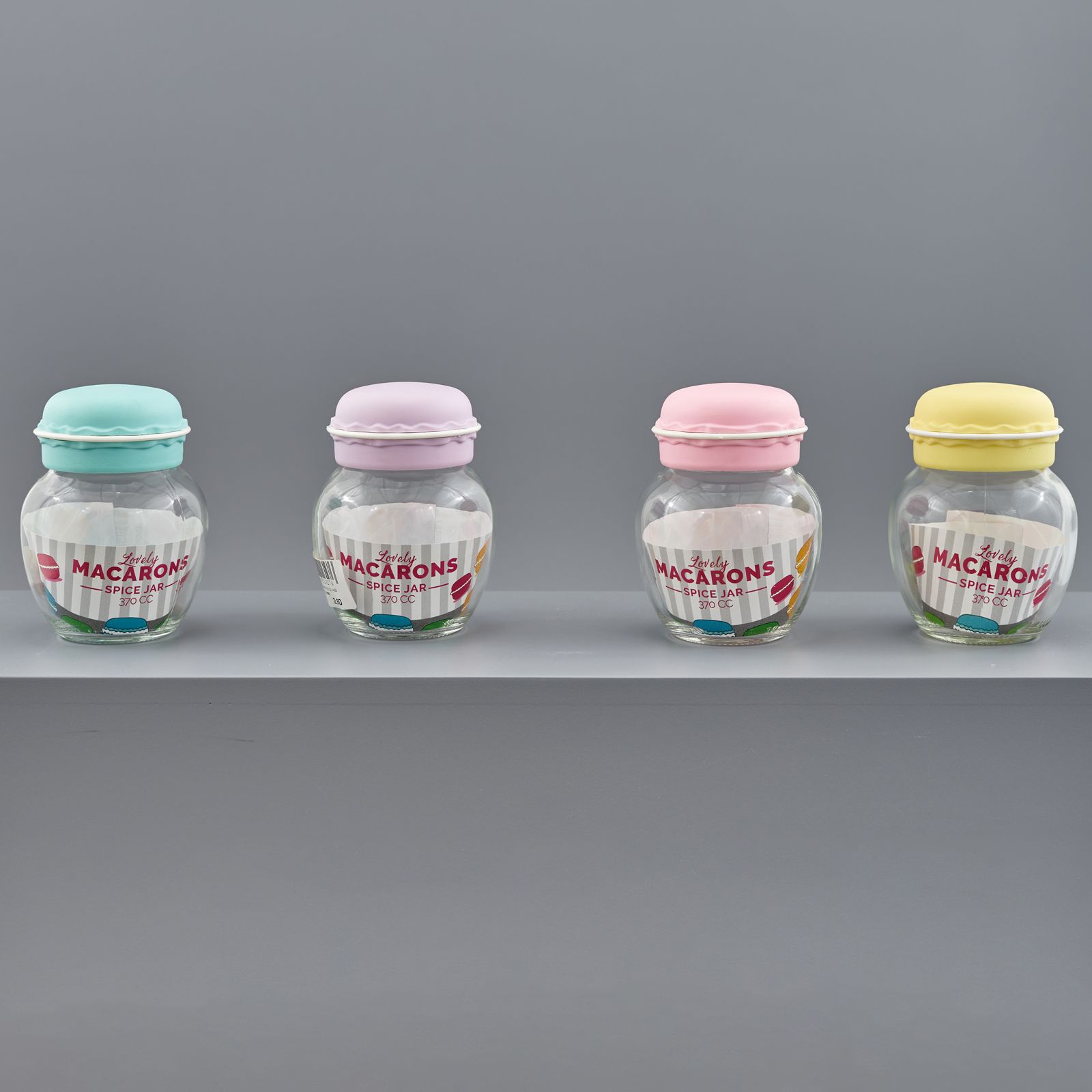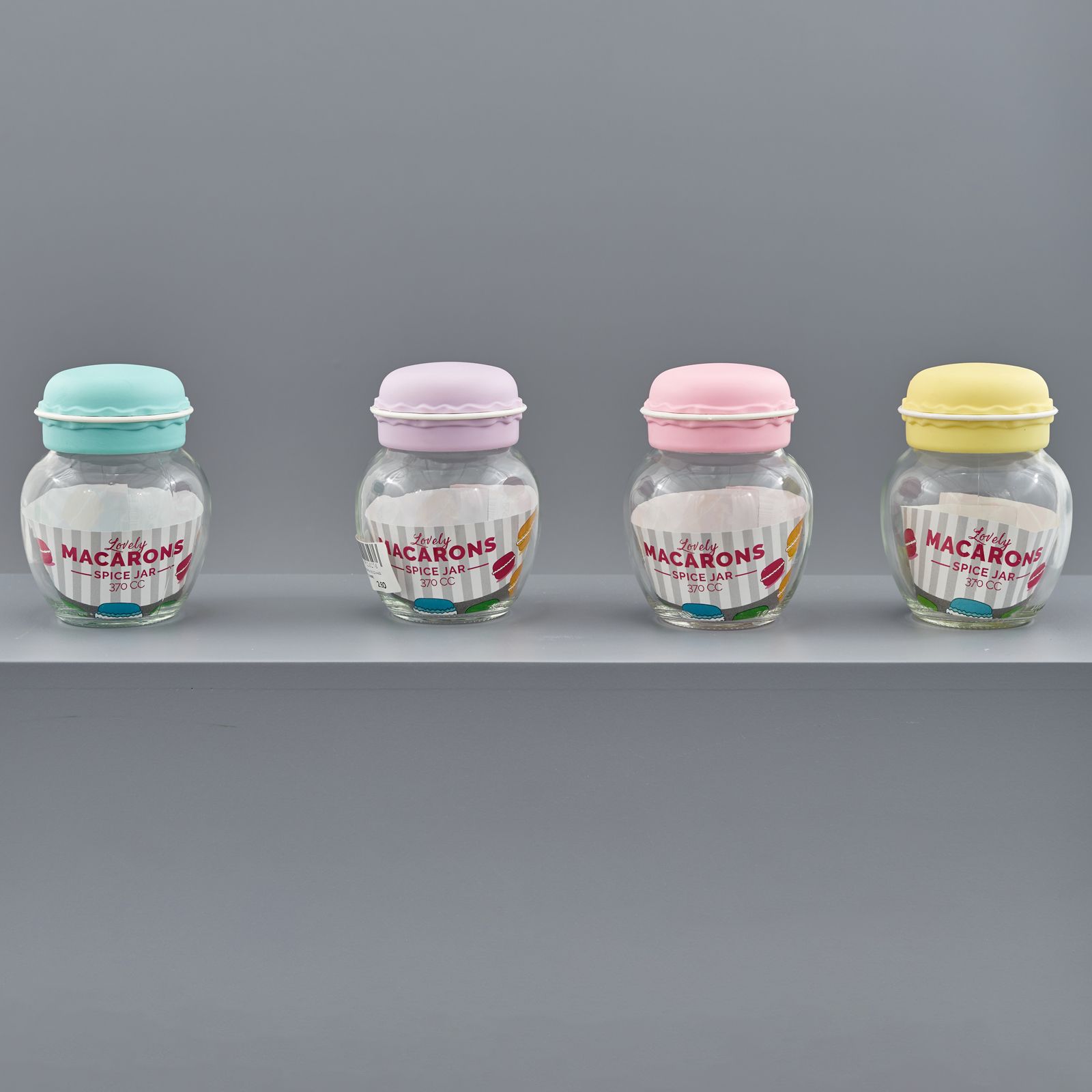 Deliziosi vasetti bomboniere con tappo in plastica a forma di macaron e base in vetro in colori assortiti come in foto! Coloratissimi e utili potranno essere adoperati anche successivamente per diversi utilizzi!